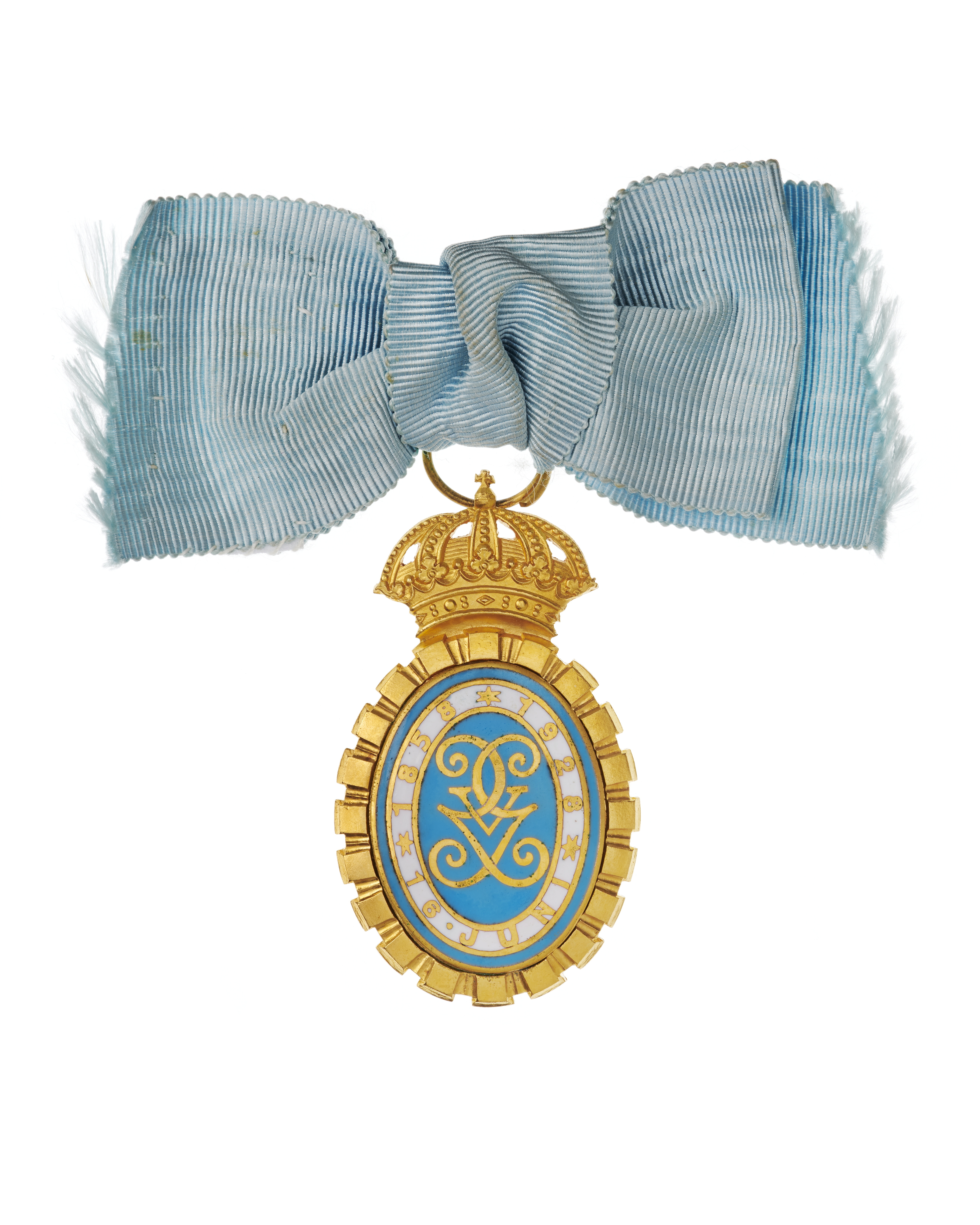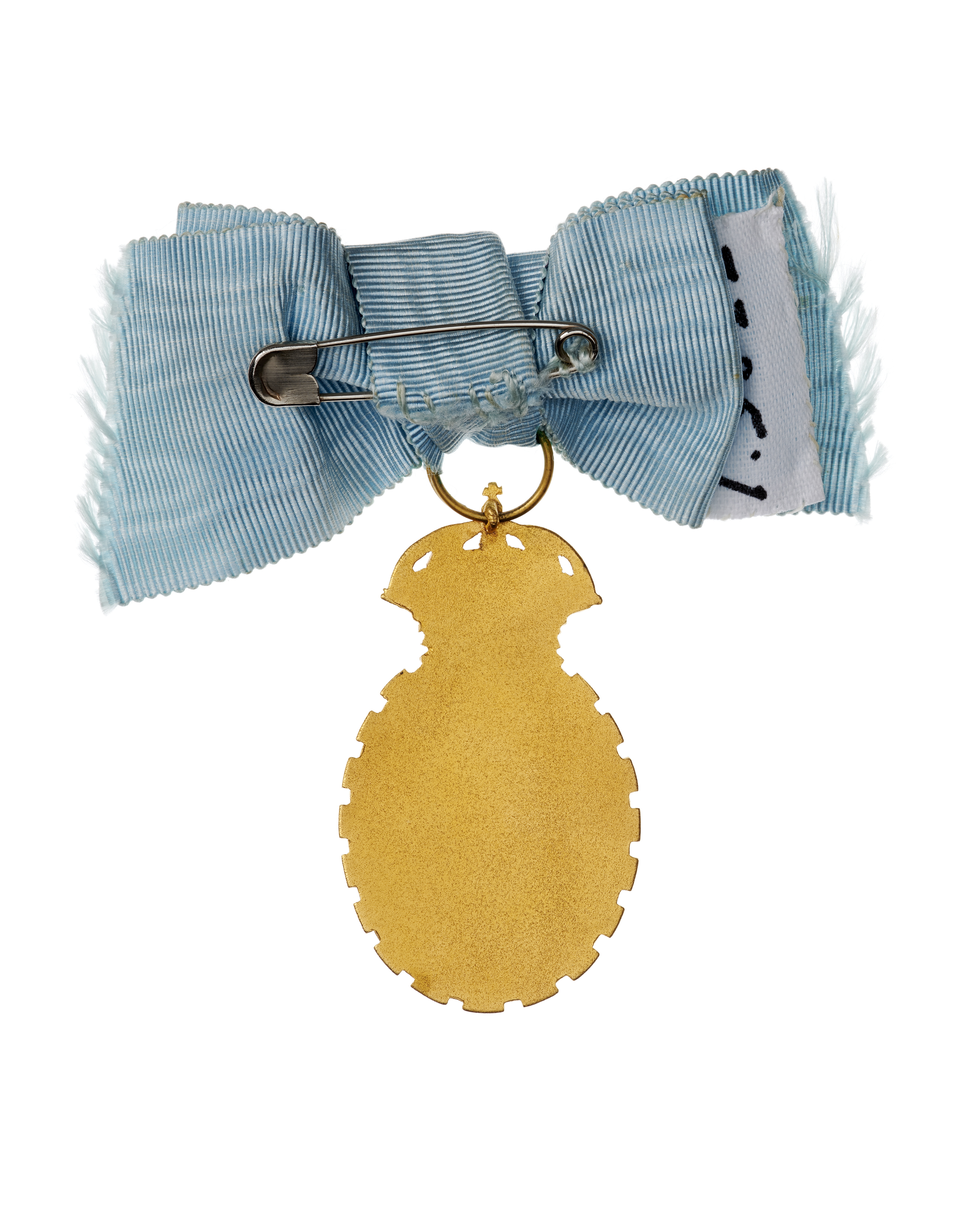 Ljusblå rosett. Säkerhetsnål. Vit ask med guldkrona på locket. Rosa bomull.