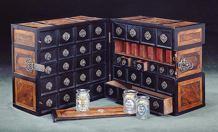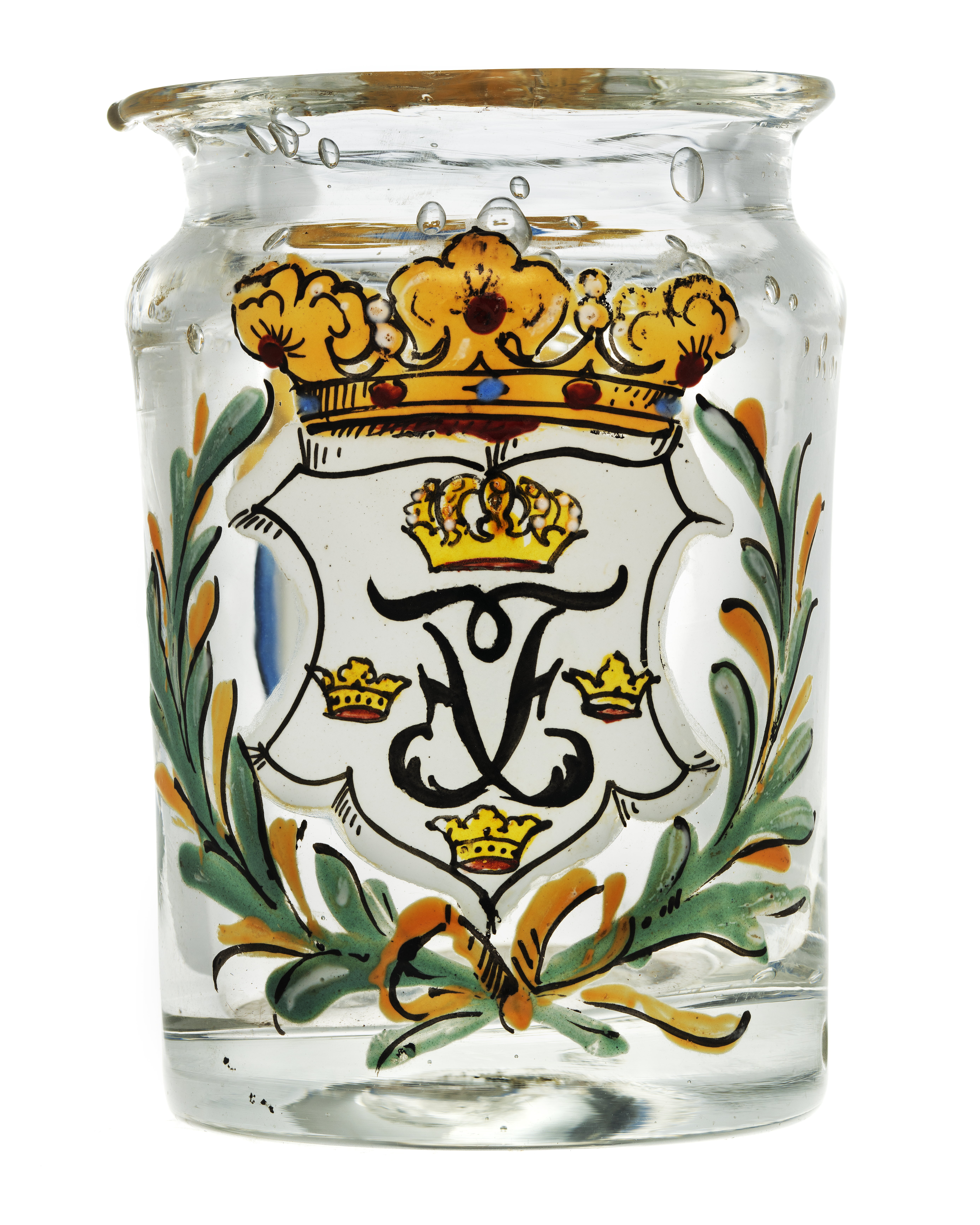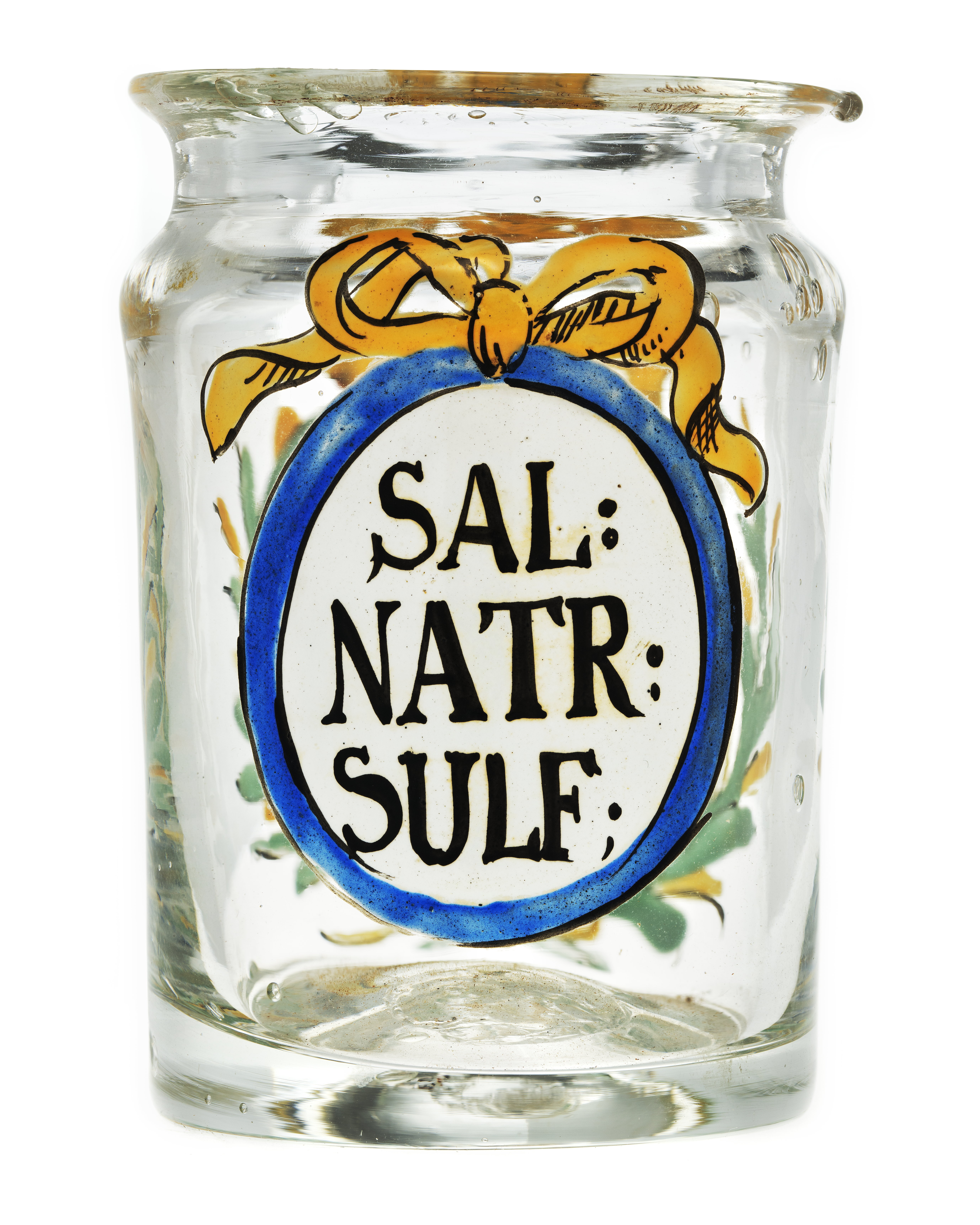 Tillhört Fredrik I, Sverige 1720-1751. Rund glasburk, svagt vidgad uppåt med något smalare hals med utsvängd kant för överbindning. Dekor i emaljmålning, på ena sidan en vit sköld, krönt av öppen krona i gult och rött, i skölden Fredrik I:s namnchiffer, spegelmonogram F (svart) krönt av en kunglig krona och omgivet av de tre svenska kronorna, allt i guld. Runt skölden en lagerkrans i grönt och guld. På motsatt sida en vit textoval med blå kant, upptill prydd med en gul rosett. I ovalen svart, latinsk text: "SAL: NATR:SULF" (natriumsulfat, glaubersalt - laxerande verkan).