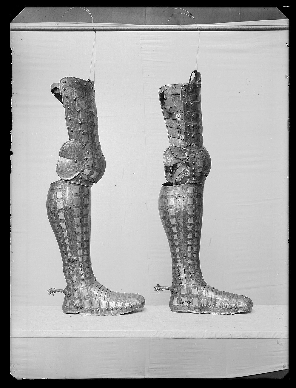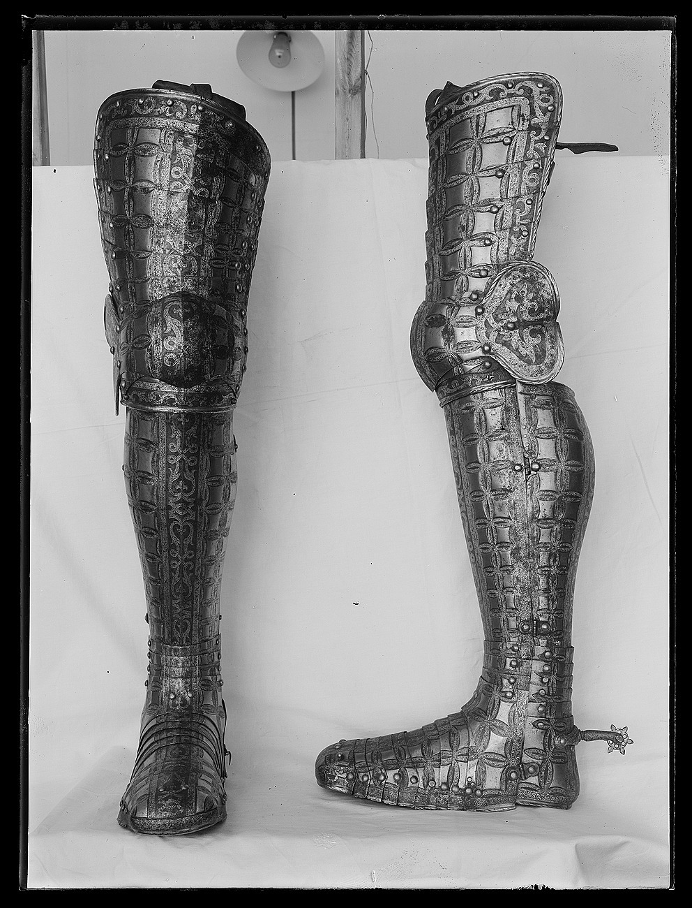 Av stål med etsad och förgyll dekor. Bestående av 10 delar. Knäbucklans yttersida utformad med en hjärtformig mussla. På insidan är upptill och nertill fästade bruna läderremmar för fastspännande i höftskörtet (tasetten). Knäbucklans har nertill två hål för fästande i benskenan. Dekor: Som hjälmens. Utmed lårskenans mitt, sidor och mussla en mörkanlöpt rand med prickad botten och ett förgyllt bandornamentmönster. I övrigt förgyllda rosetter mot blank botten. Kanterna upptill och nertill invikta, blanka och räfflade.