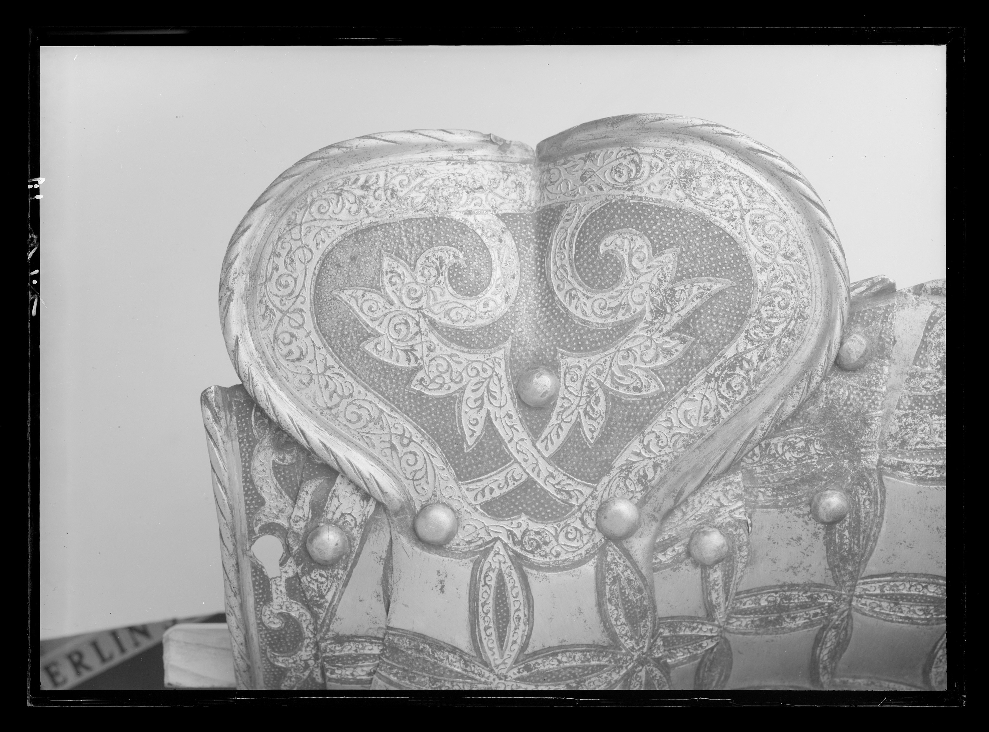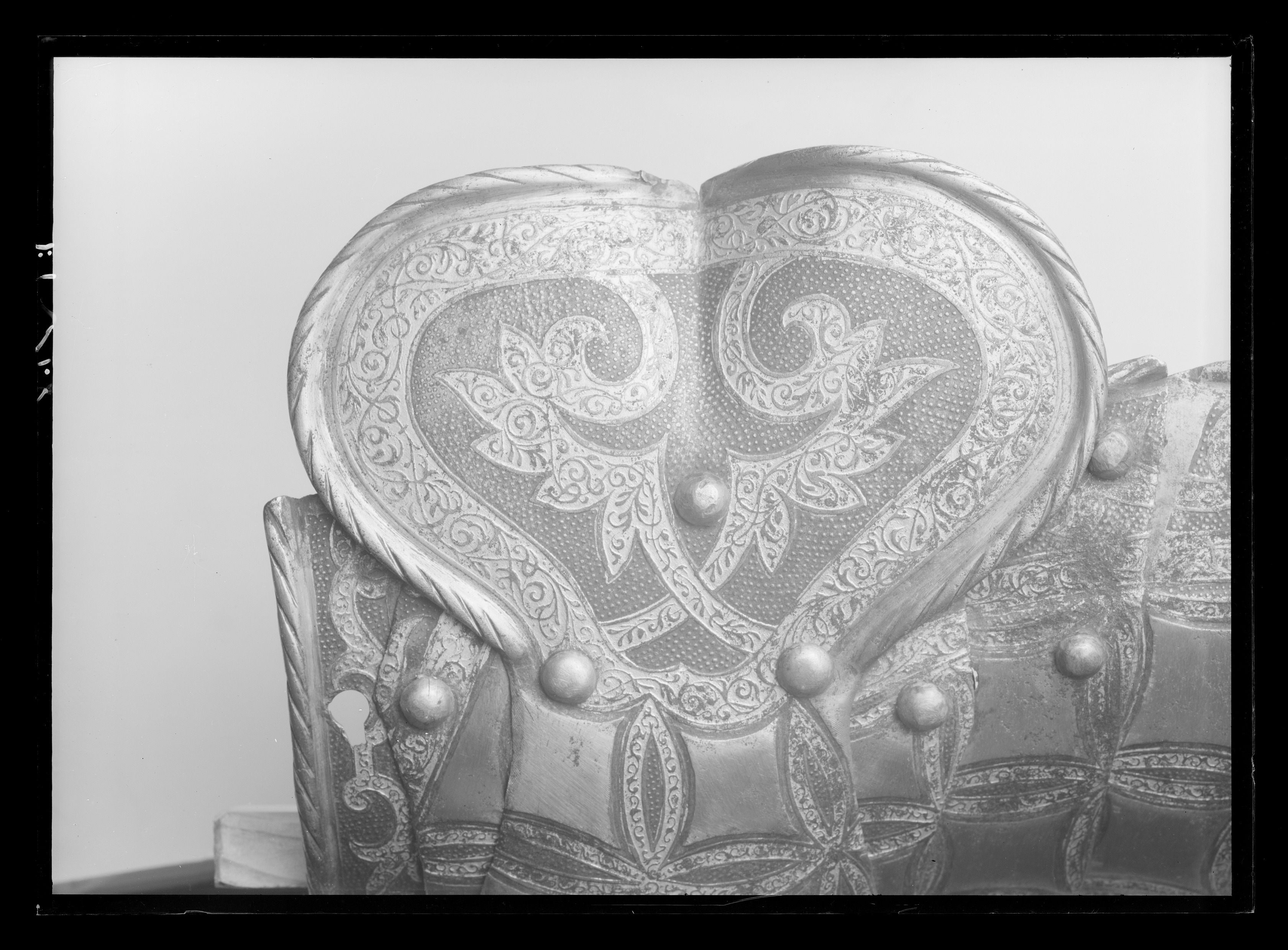 Lårpansar, höger lårskena med knäbuckla, tillverkad i Greenwich ca 1585, etsad och förgylld dekor.
