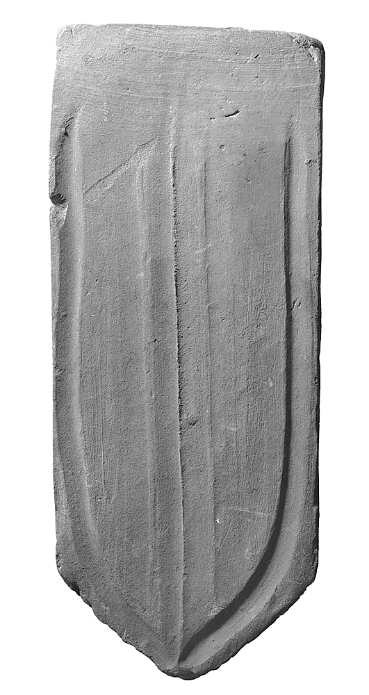 TAKTEGEL Fälltegel (s.k. bäversvans ). Av rödbrunt lergods. Avlångt skivformig, nedre ändan vinkelformigt tillspetsad. Vid övre ändan på undersidan en vinkelrät utskjutande upphängningsklack. Längs översidan parallella grunda refflor (de två yttersta djupare samt följer konturen). Längd: 41,3 cm, bredd: 17,1 cm, tjocklek: 2,3 cm