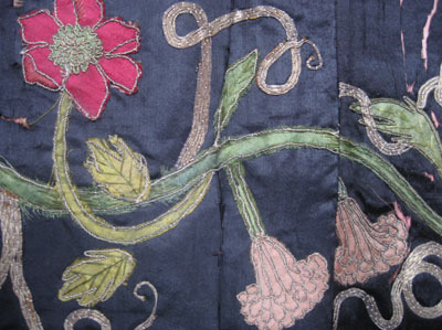 Rektangelformad längd av svart atlassiden i tre stycken med mittsöm samt en smal remsa, bredd: 40 mm, upptill på ena stycket. Högra långsidan och kortsidan nedtill har en 210 mm bred blomsterbård i applikationsbroderi samt en franskant av silkesgarn i grönt, blått, rosa, vitt och gult. Franskantens bredd, nedtill: 45 mm, på sidan: 25 mm. Bården består av blomsterslingor av blandade blommor som tulpaner, liljor (kungsängslilja, krollilja), blåklockor, nejlikor, aklejor mm. Tillverkat av siden, silkesgarn och guld- och silvertråd, i starka färger - grönt, blått, vitt, gult, rött och rosa. I hörnet ett nedåtgående knippe av blå och vita blommor. Längs överkanten är nio ringar fästa, fyra av gulmetall, fem av ståltråd. Foder av rosa sidentaft i två stycken. Samhör med nnr 19533-19543.