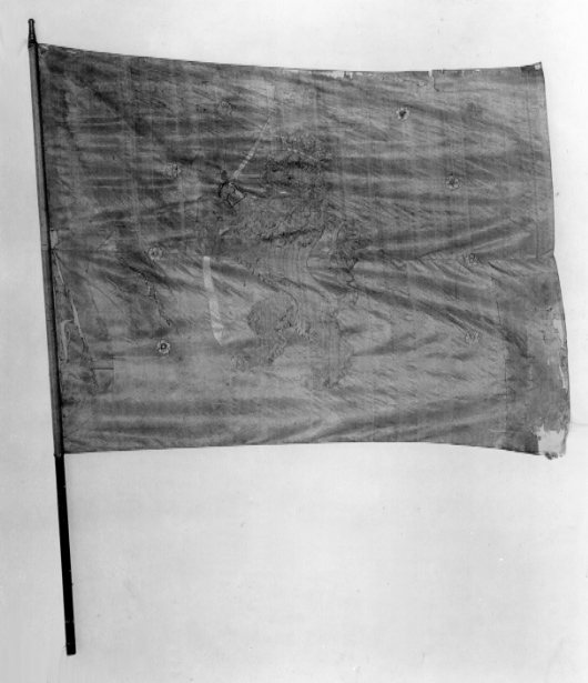 Förmodligen förd vid Åbo läns regemente under Karl XII:s tid. Duk av enkel röd, numera guldgul sidentaft. 2 våder horisontellt sammansydda. Dekor: Applicerat omvänt lika på båda sidor, Stor-Finlands vapen: ett lejon i gult förande i ena tassen, som är klädd i blå järnhandske, ett upplyft svärd. I den andra en nedåtriktad sabel, följd av 9 st. rosor i laxrosa( ?) med nedsydd kontur med blått silke. Lejonets konturer i gult silke. Smal rullfåll i ytterkanterna. Fäst med 1 rad tennlickor på ett sidenband. Stång av trä. Brunmålad. Avsågad. Holk av förgylld mässing.