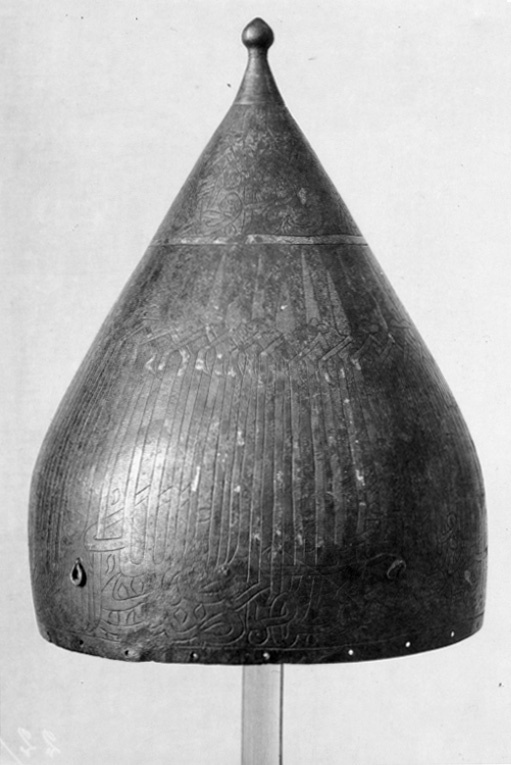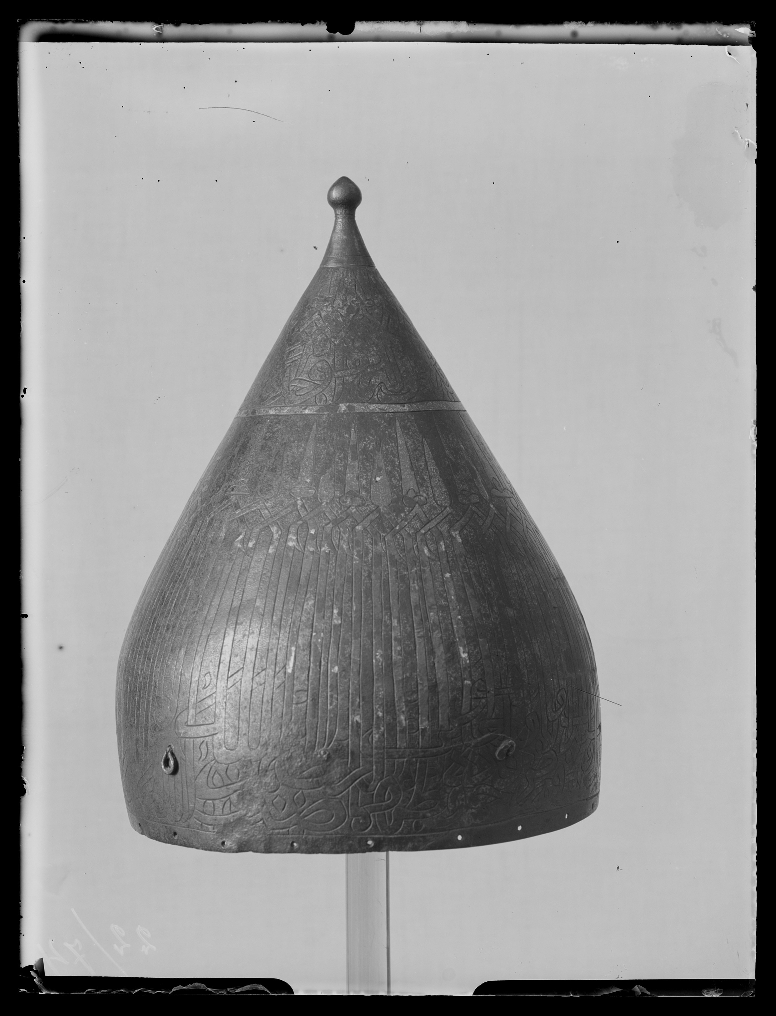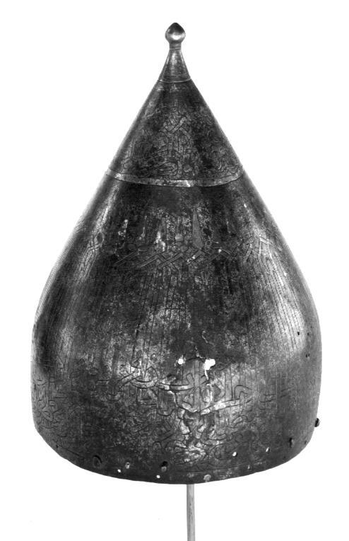 Hjälmklocka av stål med närmast runt tvärsnitt, nertill ett svagt välvt vertikalt band, b: 70 mm, mjukt övergående i en konisk del till spetsen, upptill avslutning med en lökformig kula. Ca 10 mm från nederkanten en kantlinje. Därovanför, zon 2-3, ett 190 mm högt band med s.k. Thuluth-text med långt utdragna vertikala staplar, rester av påslaget guld och silver, texten avslutas upptill av flätverk , treblad och långa, droppformiga spetsar. Därovanför, zon 1, ett 5 mm brett förgyllt/försilvrat band samt ett nytt textfält, b 70 mm, upptill avgränsat med ytterligare ett smalt band. Längs nederkanten en rad med små runda hål, en nit med välvd kopparskålla bevarad samt en med tillplattad skålla. Strax ovanför kantlinjen (förmodligen mitt fram) två grupper om tre nithål, på v sidan rester av alla tre nitarna, till h bara en. Vid övergången till den koniska delen ovanför niten längst till h fyra oregelbundet placerade, små runda hål. Kl. 3 och 9 i förhållande till hålen framtill två nithål med rester av nitar. Även kl. 5, 6 och 7 nithål, i de två yttre rester av öglor.