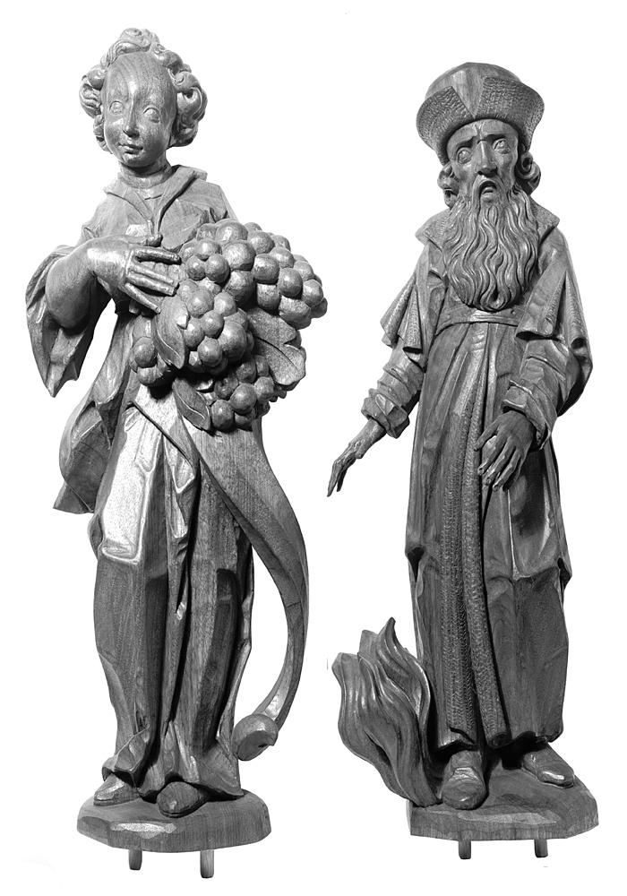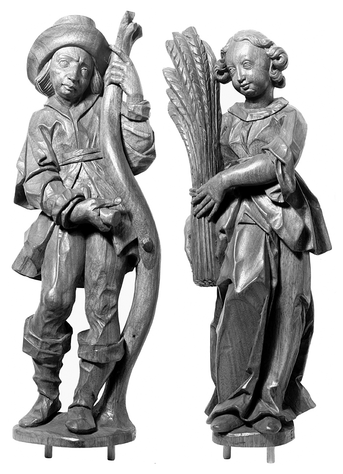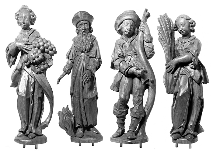- Skurna i valnötsträ och bonade. Afsedda att uppställas i nisch; baksidan ej snidad. Våren och Vintern framställda som män, den förra sysselsatt med ympning å ett träd, den senare värmande sig öfver en eld; Sommaren och Hösten som unga kvinnor, den förra bärande en sädeskärfve, den senare ett ymnighetshorn med vindrufsklasar. Samtliga på ojämnt konturerade fotplattor, i hvilkas undersidor två tappar af ek (för fastsättande i ett underlag). Våren: Ung man, stående, med en kal, nästan S-formigt svängd smal trädstam vid sin vänstra sida; hufvudet något böjdt åt detta håll, vänstra armen uppåtböjd, handen i höjd med ansiktet samt hållande om trädstammen, högra armen böjd framfor lifvet, med handen vid underlifvet, i handen ett kort stafformigt stycke ympvax, höftpartiet något fördt åt vänstra sidan, vänstra benet rakt, det högra något böjdt. Iklädd hatt med framtill uppviket brätte, rock med halflånga ärmar, vida samt uppslitsade, kring midjan ett bälte, åtsittande byxor med s. k. latz samt höga stöflar med upptill’omvikna vida skaft. Å trädstammen något nedanför högra handen en afskuren kvist (för ympningen). I fotplattans kant inskuret: E.Otikt/? ms Höjd (utan tappar): 42.5 cm. Sommaren: Stående; hufvudet något vridet åt högra sidan samt med halflångt lockigt hår, vid högra sidan af kroppen sädeskärfven, högra handen hållande om dess nedre del, vänstra armen böjd framför lifvet samt med handen hållande i kärfven något ofvanför högra handen, höftpartiet fördt åt vänstra sidan, vänstra benet rakt, det högra böjdt. Iklädd fotsid klädning, bestående af vid kjortel samt utanpå fallande blus med rundt halsen gående nedviken krage, något ofvanför midjan ett skärp, ärmarna uppvikna vid armbågarna. I fotplattans kant inskuret signering som å Våren. Höjd (utan tappar): 41 cm. Hösten: Stående; hufvudet något böjdt åt vänstra sidan samt med halflångt lockigt hår, vid vänstra sidan ymnighetshornet med vindrufsklasarna, högra armen böjd, med handen å vindrufvorna, vänstra armen bakåtförd samt böjd, handen vid drufklasarnas bakre del; högra benet böjdt, det vänstra rakt. Iklädd fotsid klädning, bestående af vid kjortel samt utanpå fallande, framtill öppen blus med nedliggande krage, något ofvanför midjan ett skärp; ärmarna nedtill vida samt uppvikna vid armbågarna. Ymnighetshornet mångsidigt, nedåt afsmalnande samt spiralvridet. I fotplattans kant inskuret signering som å Våren. Höjd (utan tappar): 43 cm. Vintern: Gammal man, stående med högra foten invid en på marken flammande eld; hufvudet något böjdt åt högra sidan samt med halflångt lockigt hår och långt vågigt skägg, armarna sänkta samt förda mot elden, händerna lyfta något ut öfver denna, högra benet sträckt, det vänstra böjdt. Iklädd pälsmössa med uppviken kant samt fotsid pälskappa med nedliggande bred skinnkrage och uppslitsade halflånga ärmar, något ofvanför lifvet ett skärp; under kappan en rock, synlig endast å ärmarna, hvilka äro uppvikna vid handlederna. Tätt invid högra fotens utsida elden med flammor, nående till något nedanför knäna. I fotplattans kant inskuret signering som å Våren. Höjd (utan tappar): 41.7 cm. Skurna 1925 af schweiziske träsnidaren Edwin Otiker (Oetiker) efter original, förut befintliga å släkten VON Im Hoffs egendom Rörswil i kantonen Aargau, Schweiz, numera i Landesmuseum, Zürich. Originalen sannolikt från 1500-talets slut eller 1600-talets böljan. Utförda efter beställning af Wilhelmina von Hallwyl, f. Kempe, genom professorn Dr. H. Lehmann vid Landesmuseum, Zürich, Schweiz, af bildhuggaren Edwin Otiker, Zürich, se bref och räkning 4 Juni 1925. Ankommo 26 Juni 1925, se Hufvudbok (hushållskonto). Betalda 15 Juni 1925, se Hufvudbok (hushållskonto) samt skriftligt erkännande från professor H. Lehmann 18 Juni 1925. Pris: Frcs 1780, se räkning.