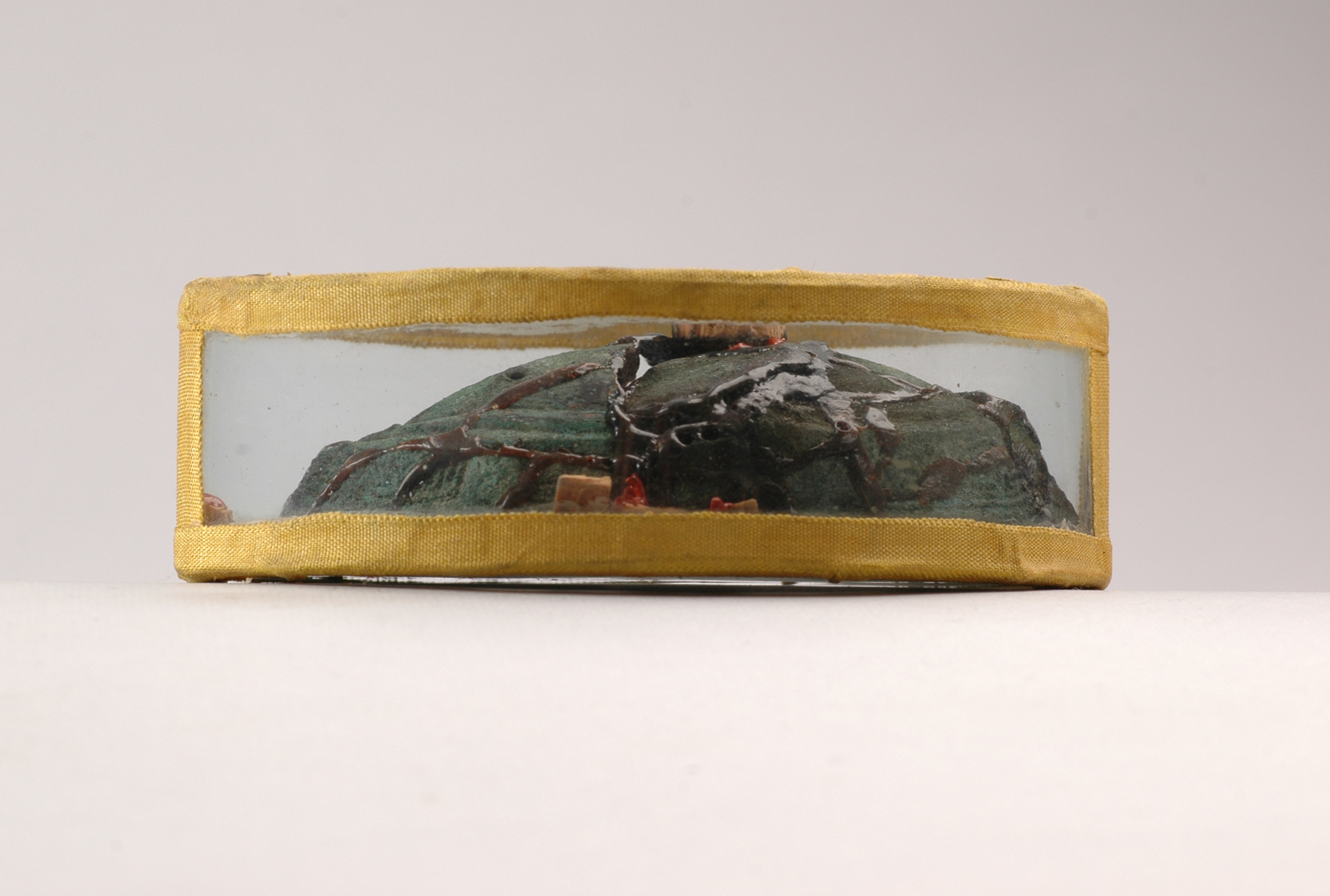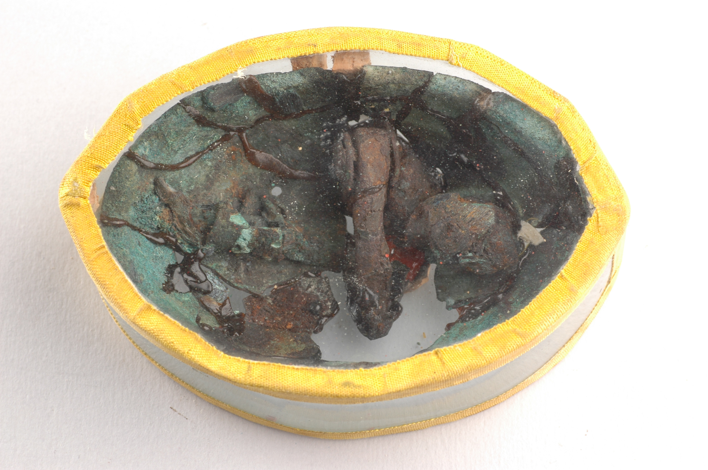 Underskållorna till 2 ovala spännbucklor sammanlimmade till 1 underskålla. Monterad i glasfodral (!).