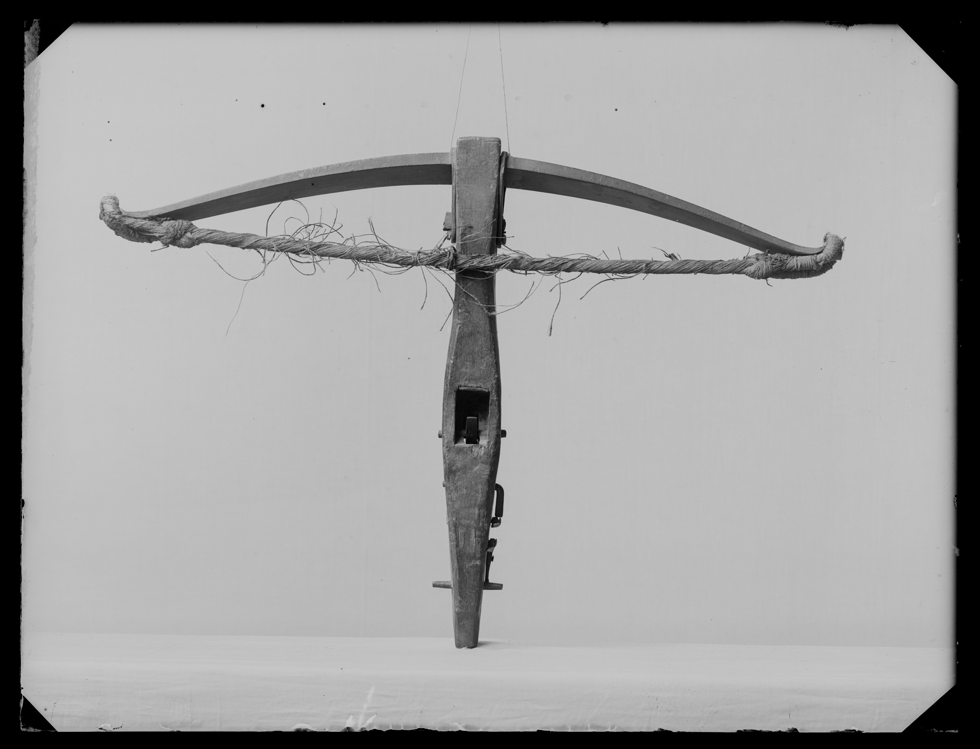 Båge av svartmålat stål, fäst vid stocken med triangulära krampor. På högra bågarmens baksida stämpel "A I" (vägledn.1921:119). Sträng troligen av hampa. Utvändigt lås av stål. Stock av björk, kort och tjock. På höger sida framför låset inbränt AVK (ligatur AV). Baktill ståltappar för spännanordning.