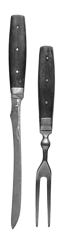 STEKBESTICK. Bestående av kniv och gaffel. Av stål, med träskaft. Kniv: Blad smalt, nästan jämnbrett, med svagt bågformig egg och nedsvängd bak samt spetsig udd, på baken ett stycke från skaftroten en uppskjutande trubbvinklig udd. Skaft med platta sidor, något rundade kanter och spolformig kontur samt bestående av en från bladet utgående skafttunga, belagd på vardera sidan med en skiva av ebenholts; skivorna fästa vid skafttungan medelst tre genom det hela gående mässingsnitar, på inre änden på vardera sidan ett tennbeslag, vilka beslag bilda en holk på skaftet. Längd: 28,9 cm. Blad, bredd: 1,7 cm. Skaft, längd: 11 cm. Gaffel: Tvåkloig, med böjda spetsiga långa fyrsidiga klor, från dessa utgående mot skaftet ett balusterformigt mellanstycke. Skaft som knivskaftet. Längd: 24,1 cm. Gaffel, bredd: 2 cm. Skaft, längd: 11 cm.