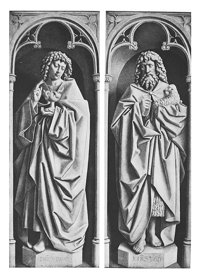 Fotografi. Detalj av Gentaltaret - ett altarskåp i Sint Baafskatedralen i Gent i Belgien. Johannes Döparen och Johannes Evangelisten.