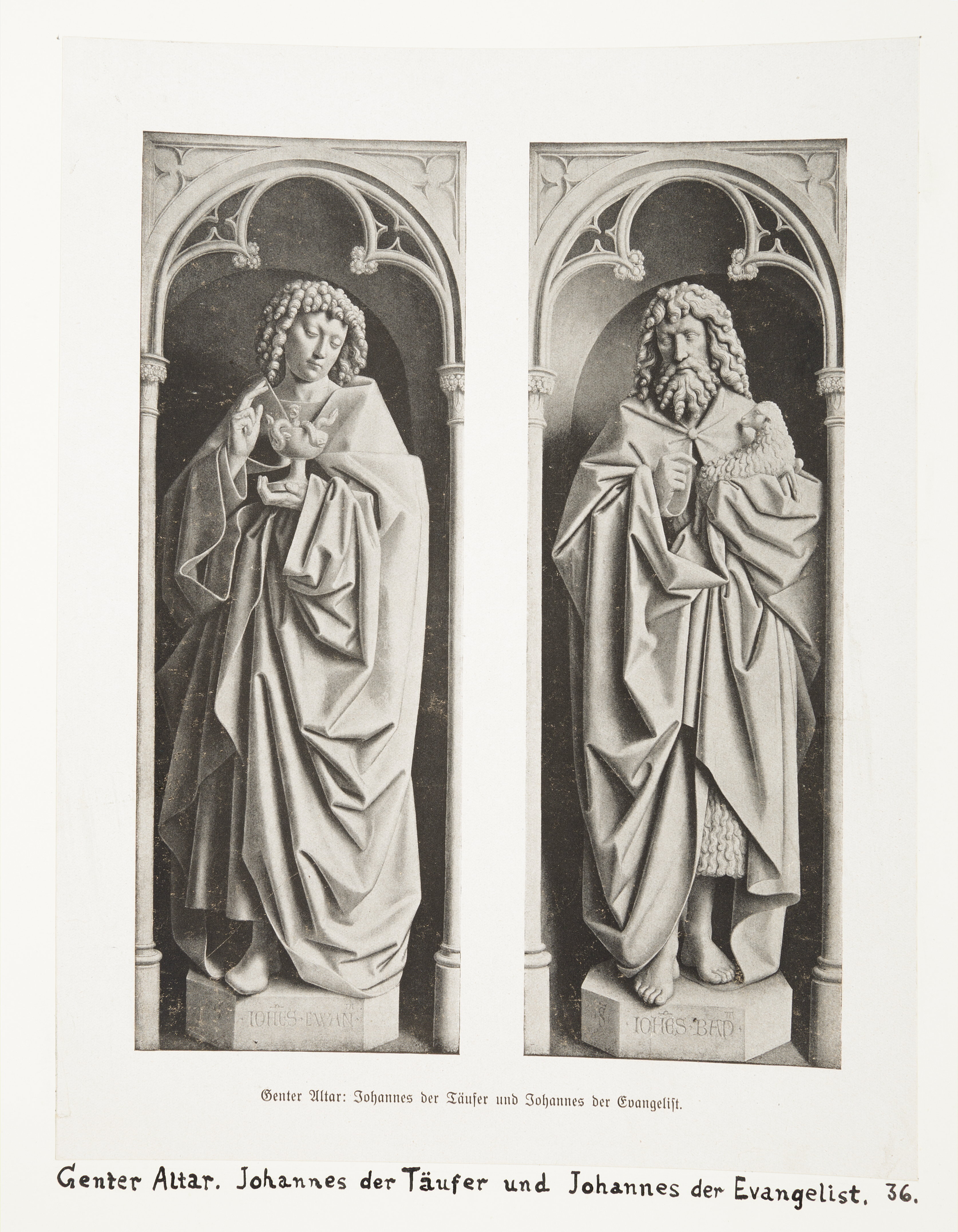 Detalj av Gentaltaret - ett altarskåp i Sint Baafskatedralen i Gent i Belgien. Johannes Döparen och Johannes Evangelisten. Text på originalet: "Genter Altar. Johannes der Täufer und Johannes der Evangelist." Fotografierna LXVI:Q.01.-55. kommer från en resa genom Schweiz, Belgien och Holland, som Wilhelmina von Hallwyl gjorde den 4 juni - 1 augusti 1927. Med på resan var fröken Sonja Gelotte, professor Nils Lithberg, herr Karl Andersson och kammartjänaren John Petterson. Nils Lithberg lämnade sällskapet efter vistelsen i Schweiz. Fotografierna är inköpta av Wilhelmina i Basel, Zürich, Bryssel, Antwerpen, Haag och Amsterdam. Uppgifterna kommer från Sonja Gelottes reseanteckningar.