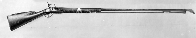 Rund, vid kammaren åttsidig, slätborrad brunerad pipa, vid övergången en svarvad ring, och en pärlstavsring. Vid pipbasen hispaniserade, urspr. förgyllda stämplar, rektangulär stämpel med lejon, krönt kvadrat med text: " BON // GAR // DE ", därframför fyra, på sidofaserna vardera en ornamentstämpel, (Stöckel 80-82) guldet delvis kvar. På v. sidofas en stämpel i form av krigare i uniform från c. 1700. Tvärt avskuret, svagt nerböjt svansskruvblad. Guldfodrat fänghål. På pipans undersida fäst en kantig rörka av förgylld mässing, pärlstavsringar i ändarna. Riktmedel: Knoppkorn av silver på inlaxad fyrauddig platta. Fästning: Pipan fäst med krysskruv, bakre låsskruven genom svansskruvplattan samt ett på undersidan blomformigt genombrutet pipband av mässing. Flintlås med plant låsbleck, fasade kanter, försänkt bakspets med spetsig fals. Framför hanen graverad signatur: " BONGARDE. // A. DVSSELDORP ". S-formigt svängd, platt hane med fasade kanter, lös överkäke, omvänt päronformig käkskruv. Kantig fängpanna med bred fals. Batteri med rundat eldstål, profilerad framsida, kraftig häl. eldstålsfjäder med fasade kanter, fjäderlöv med rund platta och flikig spets. Fästning: Två blånerade låsskruvar. Blånerad avtryckare med upprullade ände. Konturerat, blånerat avtryckarbleck av stål. Halvstock av brunflammigt trä, kolv med kindstöd och rak undersida. Snidad dekor vid kindstöd, svansskruvblad, lås, varbygel och spetsrörka. Beslag av förgylld mässing, bakplåt med konturerad flik på kolvryggen, avslutning i form av flikigt blad, två blånerade låsskruvar. Genombrutet sidbleck i form av rankverk med två putti hållande sabel och spjut, sittande på lejon, ytterst två bundna fångar, en sittande och en knäböjande. Kantig spetsrörka med pärlstavsringar i ändarna, lång, slät spets. Profilerat näsband med två pärlstavar. Varbygel av förgylld mässing, konturerad list på bygeln, runda stolpar, främre arm avslutad med urna och flikigt blad, lång platt bakre arm med fasade kanter, ände i form av flikigt blad. Tillbehör: Laddstock av ljusare trä, l: 1045 mm, framtill förgylld mässingsplatta.