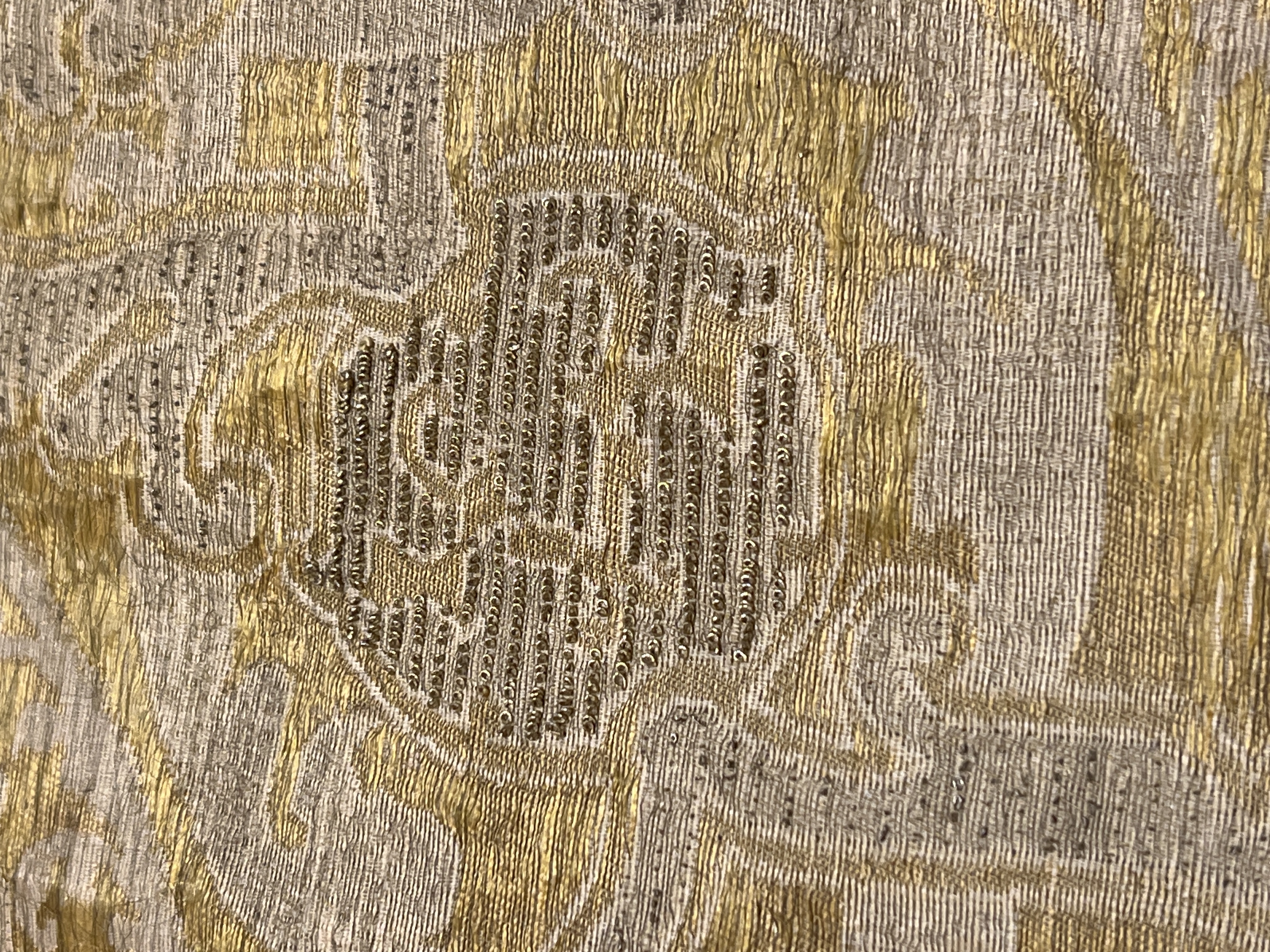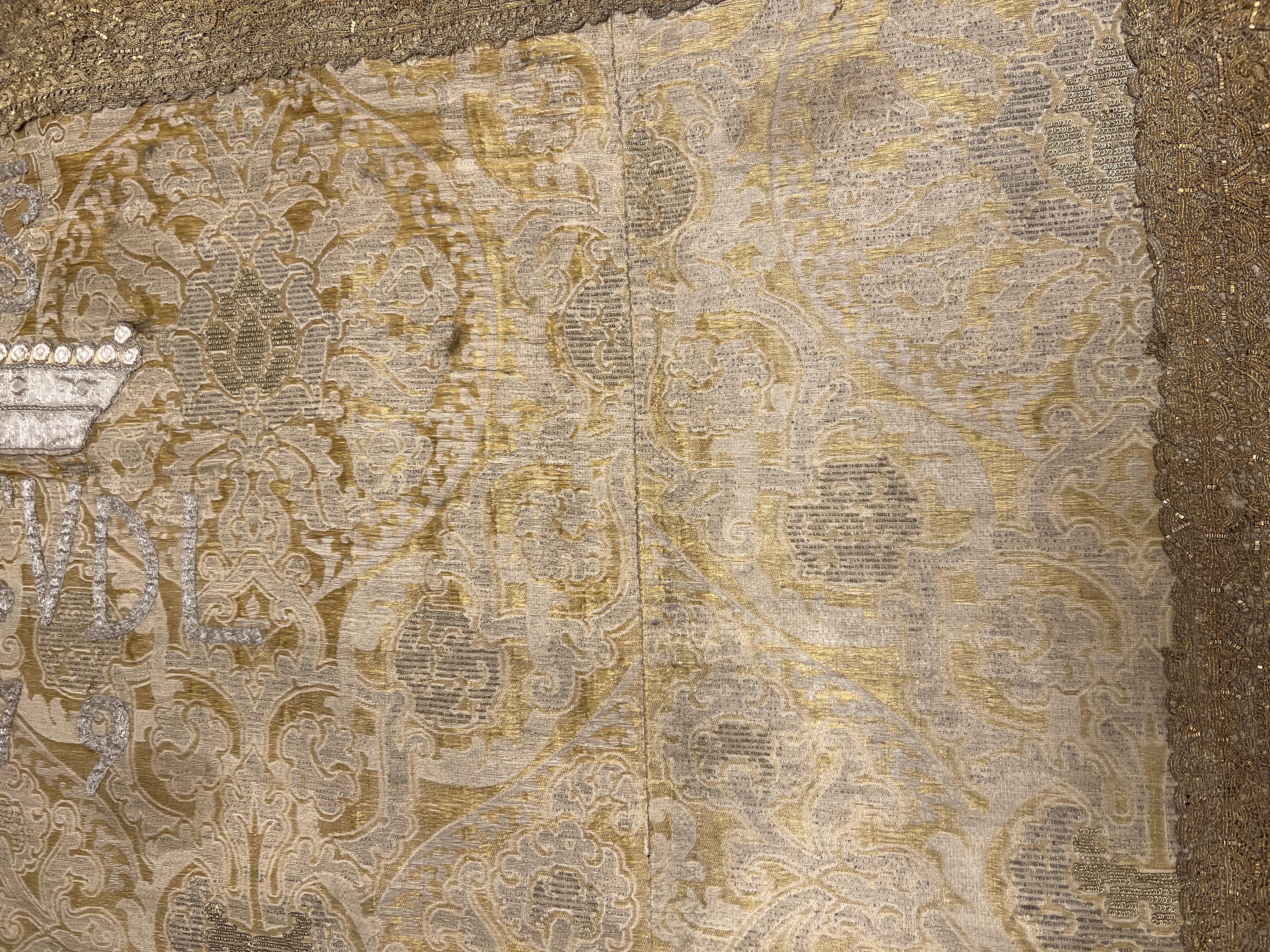 Vit guldbrokad, guldspetsar. Inköpt 1884. Antependium i gul, vitt, guld och silver med stort spetsovalmönster. Öglor i guld och silvertråd är uppdragna på ytan för maximal metalleffekt. Stort broderi med BGHCVDL 1679 under en friherrelig krona som krönts av IHS. Breda metallspetsar fastsydda på sidorna samt överdelen av antependiet.