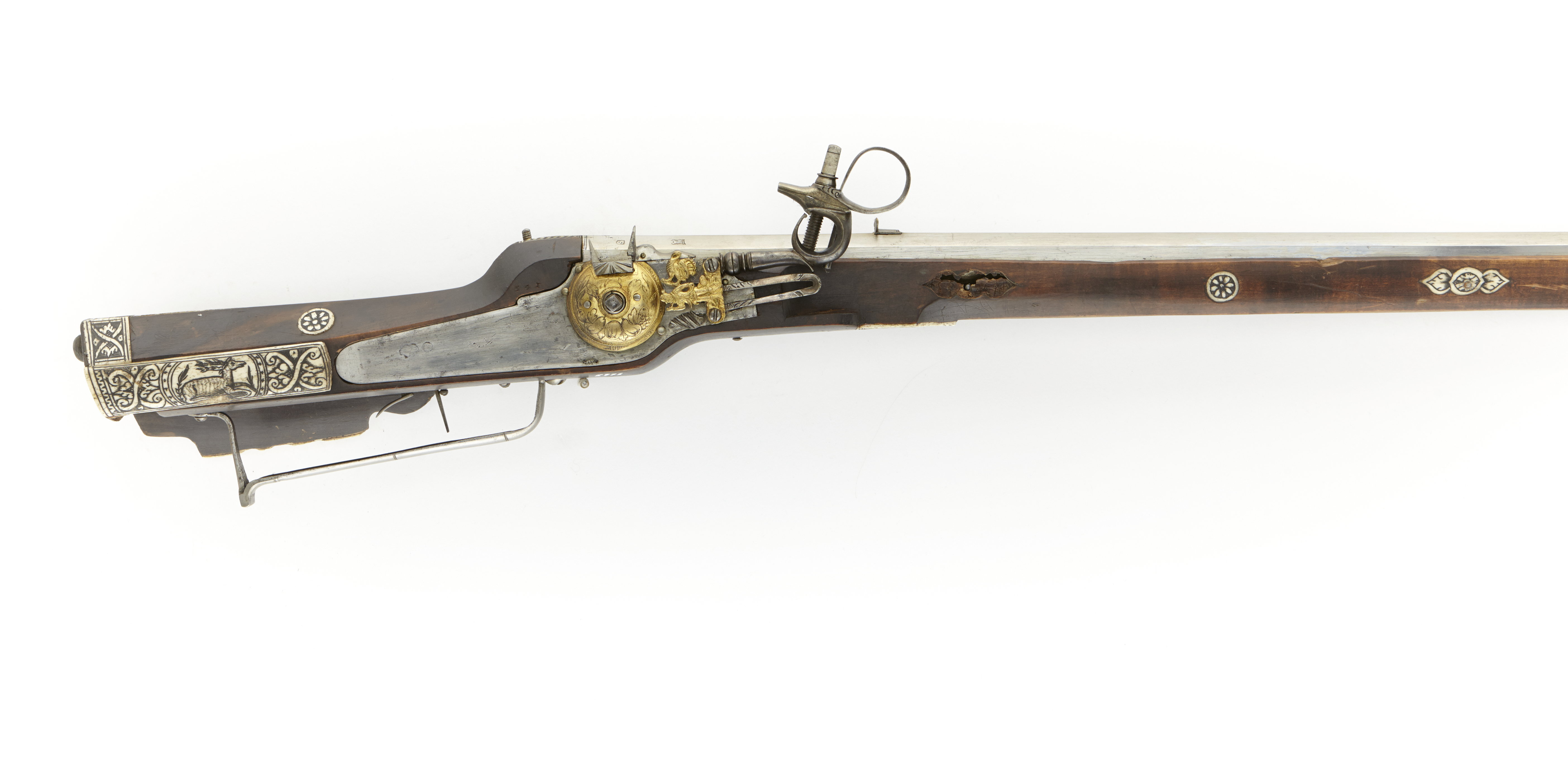 Åttkantig pipa av stål med åtta räfflor. Ståndsikte av stål och stolpkorn av mässing. På kammarens ovansida finns en siktskåra, på båda sidor därom är stämplat en nyckel (se Stöckel nr 5625) och "M S" (se Stöckel nr 4045). Tre häften. Hjullås med plant, blånerat låsbleck av tysk typ - bakåt avsmalnande genom två fall. Välvd hjulkapsel av graverad mässing med fruktmotiv. Hane med lös överkäke och ringformat fingergrepp samt ringformad hanhals. Tryckknapp med huvud i form av en kalkon av förgylld mässing. Hanfjädersstudel av förgylld mässing i form av en lurblåsande jägare. Mörkbrun helstock av trä med kolv av tysk typ. Bakplåt och stödkula av horn. Kolvlåda med lock av graverat ben med en liggande hjort. Två runda låsbrickor av ben med graverad dekor. Inläggningar av graverat ben i runda och lökformade plattor. Överrörka och näsband av graverat ben. Rak, skålformad, så kallad holsteinsk varbygel av stål. Avtryckare med snällare. Yttre pipstiftet utgörs av en skruv, som fäster ett mässingsband. Tillbehör: Laddstock av trä med doppsko av ben. Märkt: 541 ovanför låsblecket, stanstyp 5376. Enligt 1710 års inventarium p. 15, rum II: "79-541-1 Studzare med blanck pijpa M.S. på 2 nycklar till Stempell, stocken något beensatt -8-".