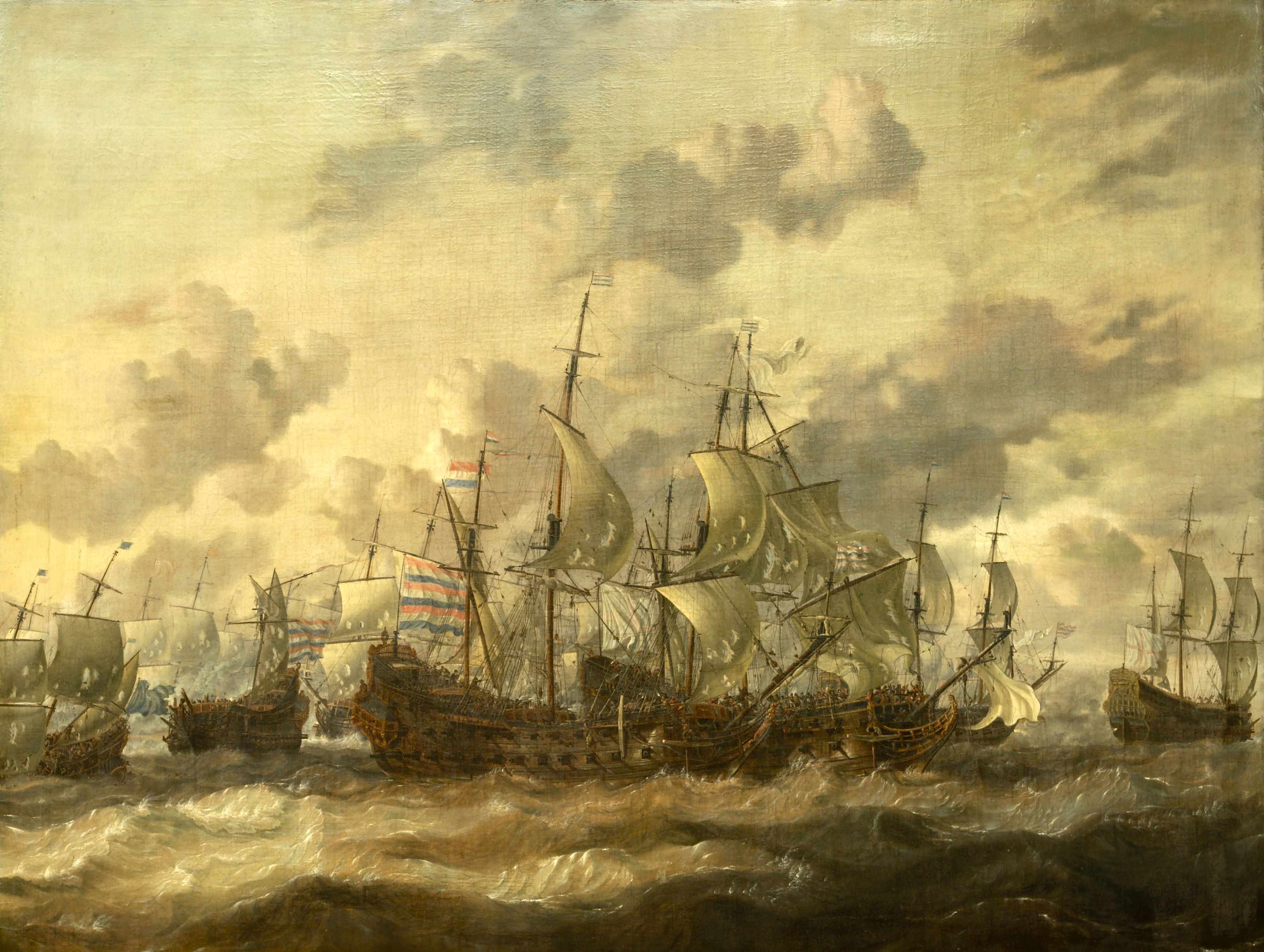 Fyradagarslaget var en strid mellan brittiska och holländska flottan utanför den sydengelska kusten 1666. Kampen avgjordes inte slutgiltigt men holländarna under de Ruyter hade de största framgångarna. Denna målning tillhör en grupp verk med motiv från slaget utförda av marinmålaren Abraham Storck i Amsterdam. De mest betydande finns i Fitzwillam Museum, Cambridge, (Cambridge 1960, nr 106), The National M;ariltime Museum, Greenwich (Woodbridge 1988, inv nr 1509) och Minneapolis Institute of Art (Minneapolis 1970, inv.nr 84:31). Ingen är daterad men de målades säkerligen långt efter det att slaget ägde rum. Just denna scen skildrar möjligen den händelse då det engelska fartyget "Swift-sure" beslagtog det holländska skeppet "Reiger". Målningen har tidigare ansetts vara ett verk av Willem van de Velde den äldre och den yngre. -"- The Four Day Battle was fought between rthe British and the Dutch fleets of the coast of Southern England in 1666. The action was inconclusive but the Dutch under de žuyster hade the greater successes. This belongs to a group of paintings of the battle by the Amsterdam marine painter Abraham Storck. None is dated but they were certinely painted long after the battle took place. The painting has previously been attributed to Willem van de Velde the Elder and Younger.