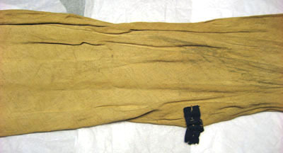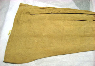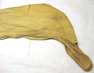 Lång, något oformlig strumpa av vit lärft. En smal tå och en tjock häl. Strumpan är sydd med två sömmar som löper bak, längs med strumpskaftet och möts vid strumpskaftets övre del. Två sidsömmar i vinkel på vardera sida av foten. Sidsömmen går fram till tåspetsen. Strumpskaftet kantas av en smal fåll, 4 mm bred. Mitt på strumpskaftet sitter med vita stygn fasttråcklad en rektangulär, dubbelvikt lapp av mörkblått kläde.