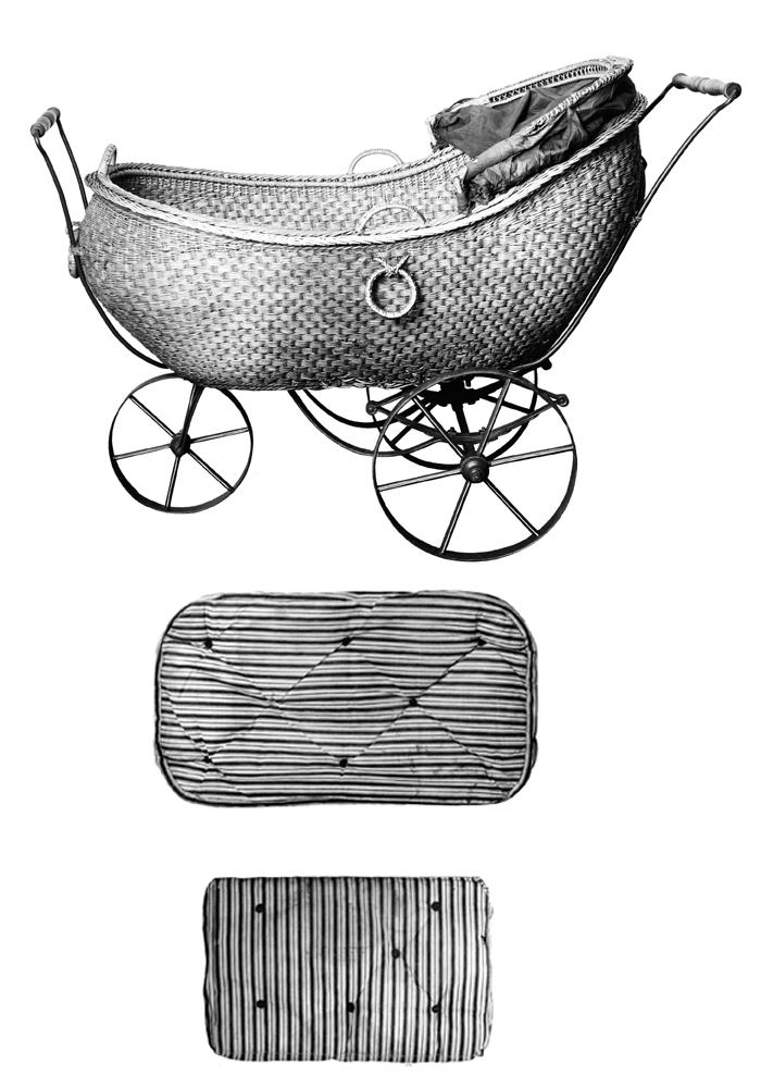 BARNVAGN med madrass och sneddyna. Av korgvide och järn Avlång med bukiga ändar samt på tre hjul. Underrede av järn, grönmålad och randat i gult samt med två hjul bak och ett fram. Korgen flätad av okluvna spön Höjd: 80.1 cm, längd: 1 m, bredd: 60 cm Suflett av impregnerat (vaxat) grönt bomullstyg samt fäst på tre bågar. Madrass: Stoppad med tagel, var av linnetyg. Avlång med rundade hörn. Varet med längdgående grupper av bredare och smalare ränder i blått mot oblekt botten, madrassen häftad i tre längdgående rader med häftningarna ställda i sicksack samt med puskor av blått linnegarn. Längd: omkring 80 cm, bredd: omkring 45 cm Fem puskor saknas. Sneddyna: Stoppning, var, häftning och puskor som madrassen. Rektangulär, med ena långsidan tjockare. Varet med randgrupperna tvärgående. Längd: omkring 60 cm, bredd: omkring 40 cm. Tre puskor på ena sidan saknas. Inköpt av Walther och Wilhelmina von Hallwyl år 1866 till deras försfödda dotter Ebba. Ebba; Ellen Elma och Irma von Hallwyl har alla legat i denna barnvagn på säteriet Ericslund, Södermanland., där den förvarats till år 1916 då den överfördes till Hallwylska huset.