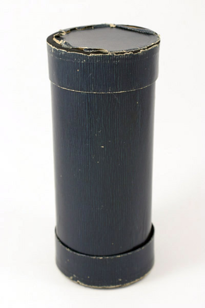 Cylindriskt fodral av papp, delvis klätt med svart linneväv. Utanpå väven klistrat grönrandigt papper. Fodralet öppet i båda ändar och där försett med lock.