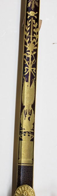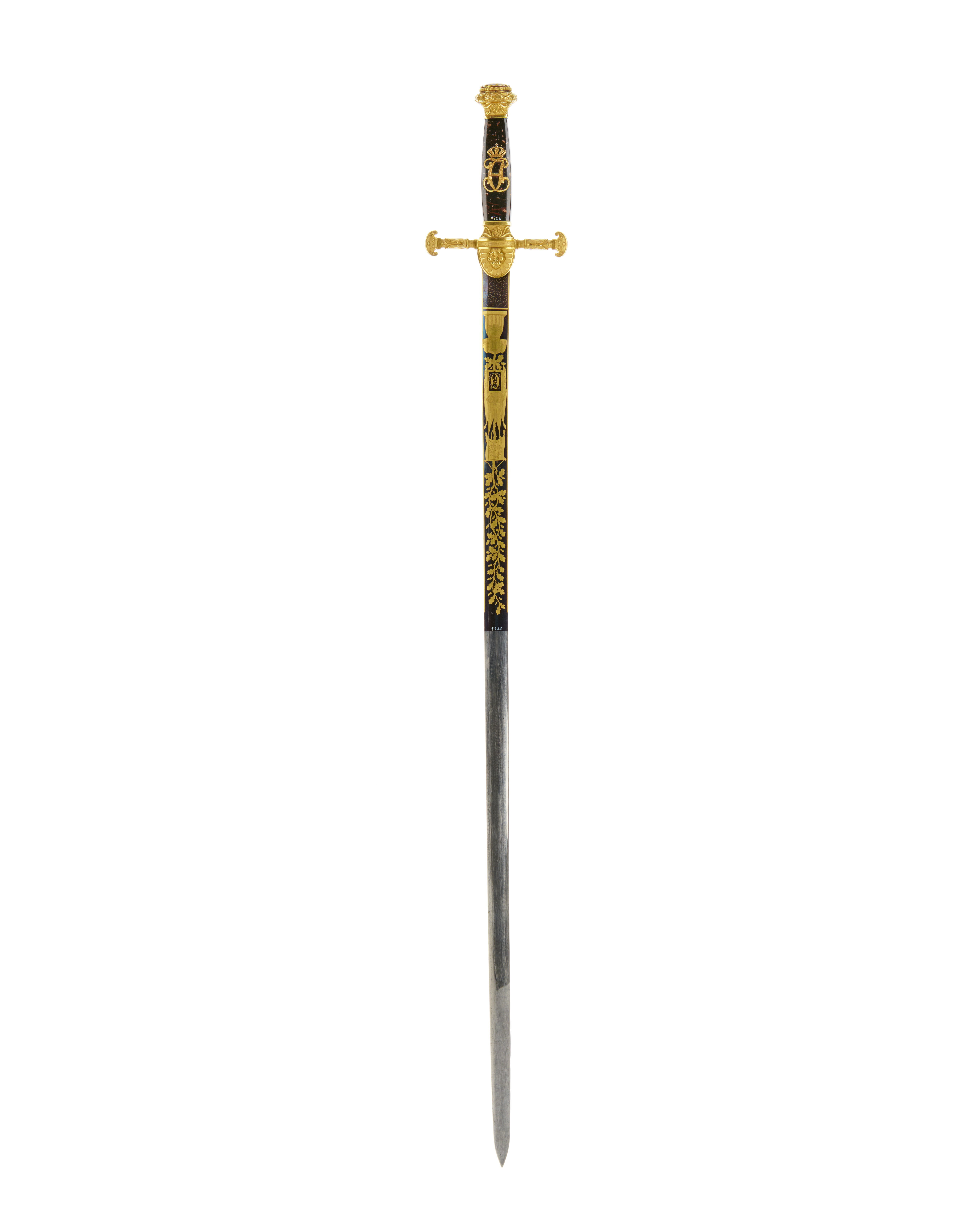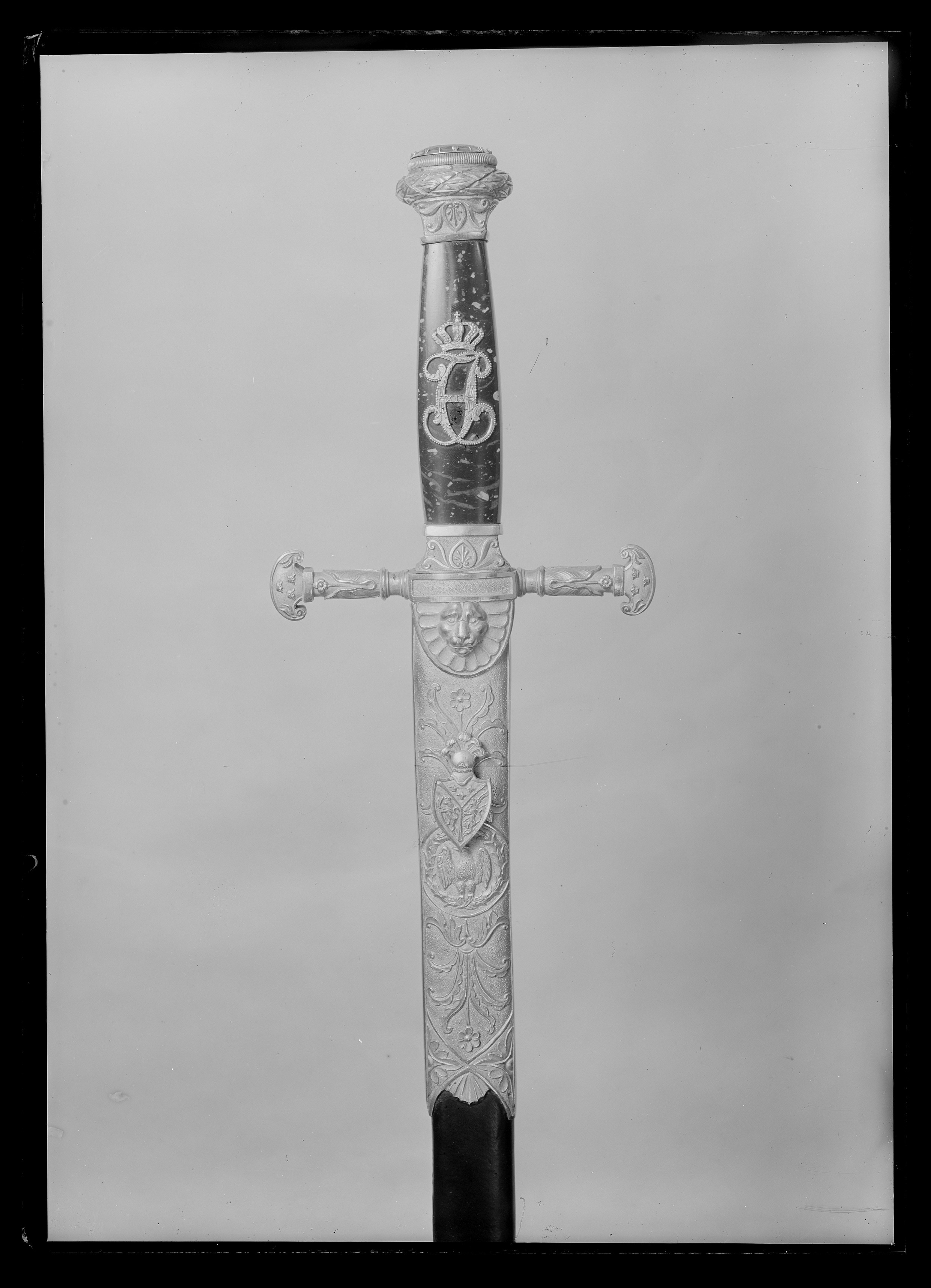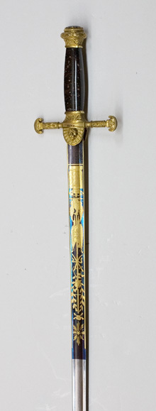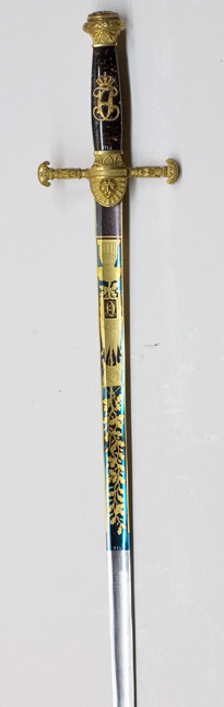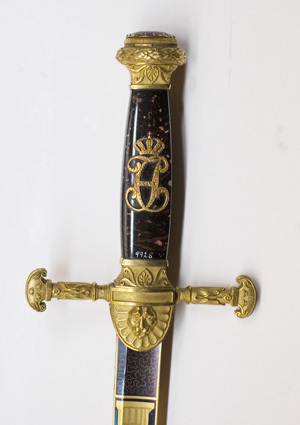 Korsformigt fäste med beslag av reliefornerad, förgylld mässing. Knapp utvidgad uppåt, runt överdelen en tuktad lagerkrans, överdelen platt med en slipad, oval ametist (l: 26 mm, b: 22 mm) i slät guldfattning. Knappen i övrigt med nedåtvända bladornament. Parerstänger raka, ornerade med blad, som öppnar sig nedåt, ytterändarna formade som amasonsköldar, varpå tre kronor, sköldarna vända med en rundade delen utåt. Styrskenor breda vid krysset, horisontalt avgränsad överdel och rundad nederdel, på den senare en lejonmaskaron, omgiven av en palmett. Kavel av polerad, melerad, mörkbrun älvdalsporfyr (Gammelklitt?), på utsidan monogram av förgyllt silver, CXIVJ under kunglig krona. Monogrammet fäst med nitar i kaveln. Klinga rak, eneggad med bred, grund hålkäl. Starka delen ornerad med etsade och förgyllda emblem mot blånerad botten, upptill tvärt avskuren. Baspartiet på båda sidor med ett rektangulärt, blånerat fält, överspunnet med ett finådrat, förgyllt ytmönster. På utsidan därovanför ett harnesk, varifrån ett smalt ekträd reser sig intill 14 mm från den blånerade bottnens avslutning. Nedtill är ekträdet belagt med en trofégrupp av korslagda fanor och ovanför dessa ett banér, fanornas nederdel belagd med en blånerad, fyrsidig sköld vari ett förgyllt monogram CXIVJ, skölden under kunglig krona. På insidan Sveriges och Norges unionsvapen under kunglig krona, därovanför en örn med uppåtriktade vingar och ett blixtknippe i klorna, strålande Nordstjärnaen ekranka. Ryggen och eggsidan förgyllda. På ryggen närmast basen hovdamaskeraren Carl Gustaf Liljedahls signering i skrivstil: "C.G.Liljedahl, Stockholm". Ryggen därovanför ornerad med en bård av konturetsade blad.