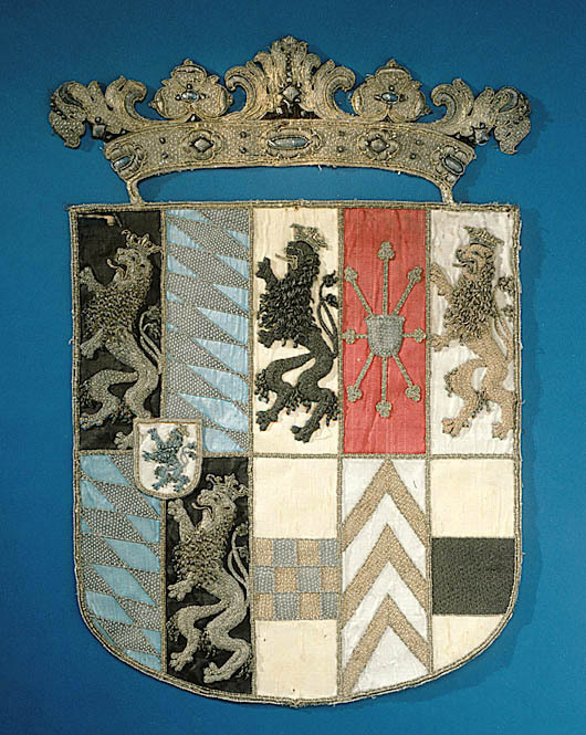Delad sköld, fyra gånger kluven. Ruta 1, 2, 6 och 7 är kvadrerade för sig med pfalz lejon av förgylld tråd mot svart sidenatlas och Bayerns vapen, med ett snedrutat schackmönster av silvertråd mot blå sidenatlas. Därpå en hjärtsköld med Bergs vapen, ett lejon av blå silkestråd och silvertråd mot vit sidenatlas. Ruta 3, Gülichs vapen, med ett broderat lejon av svart silkestråd mot ljusgul sidenatlas. Ruta fyra är av röd sidenatlas med Cleves vapen, en sköld samt stiliserade liljestänglar av förgylld silvertråd mot röd sidenatlas. Ruta fem utgörs av Bergs vapen, ett lejon av gul silkestråd och förgylld silvertråd mot vit sidenatlas. Veldens vapen med en schackrutad balk i rött och silver mot gul sidenatlas, utgör ruta åtta. Ruta nio utgörs av Marks vapen, tre sparrar av brun silkestråd mot gul sidenatlas. Ruta tio utgörs av Ravensteins vapen, en balk broderad med svart silkestråd mot gul sidenatlas. Ruta tio utgörs av Rawenstein vapen, en bjälke av svart silkestråd mot ljusgul sidenatlas. Samtliga broderier är utförda i plattsöm samt med lejonens man och hårbeklädnader av krusad tråd. Detaljer är utförda med kantiljer och en svart pärla får tjäna lejonens ögon. Samtliga rutor kantas av tre smala snoddar av förgylld silvertråd. Skölden kantas runtom av en tjockare och en smalare snodd av förgylld silvertråd samt av vit silkestråd omvirad av silvertråd utdragen i små öglor. Vapnet kröns av en broderad grevekrona av förgylld silvertråd. Kronringen kantas liksom vapnet av en tjockare och en smalare snodd av förgylld silvertråd. På kronringen är broderat fem blommor med stenimitationer av silverlan omvirad av blå- respektive röd silkestråd, kantade av skruvade, förgyllda lan samt av kantilj. Mellan blommorna är broderat små prickar av kantilj av förgylld silvertråd. Kronspetsarna utgörs av fem stiliserade blad på vilka är broderat stenimitationer med blå silkestråd. Även dessa kantas av kantilj och skruvade lan samt av små prickar av kantiljer av förgylld tråd. Mellan kronspetsarna är utfyllt med svart silkestråd. Vapnet är fodrat med beige linnelärft samt med ljus makulatur.
