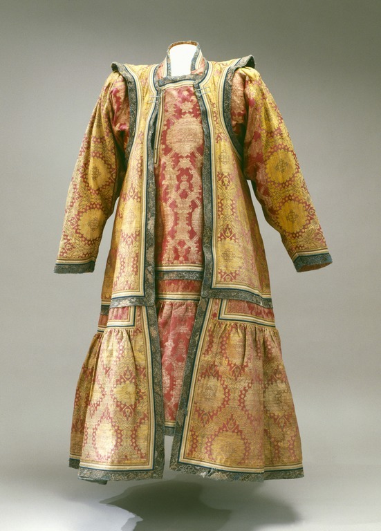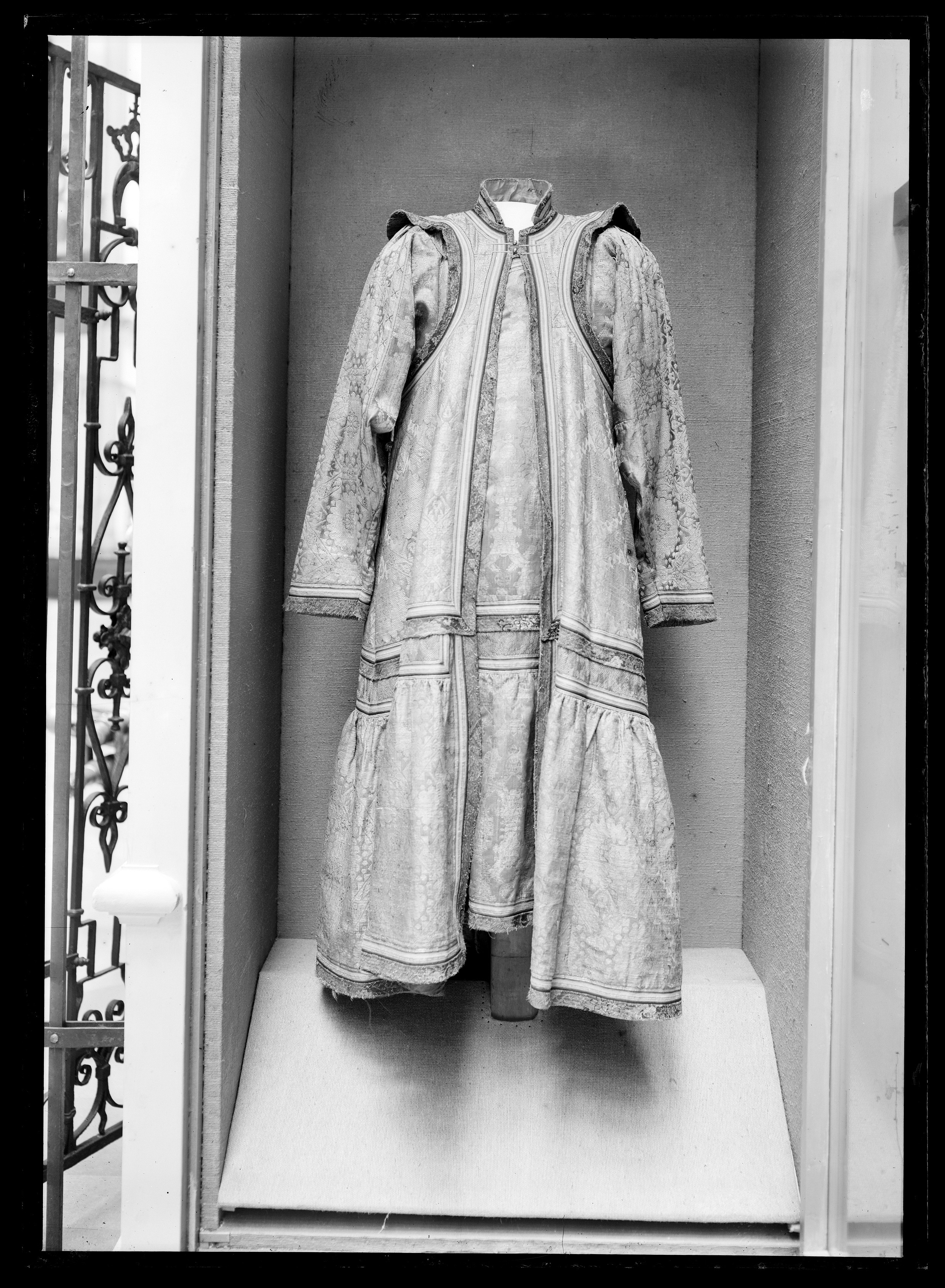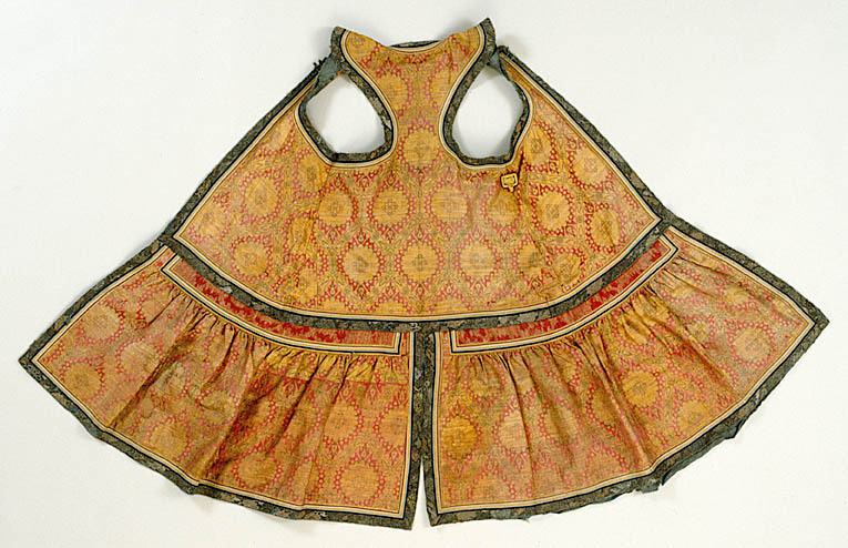 Dräkten hemfördes av Johan Gustaf Renat och hans hustru Birgitta Scherzenfeldt efter långvarig fångenskap hos kalmuckerna i Djungariet, Centralasien. Samhör med Nnr 31 474. Materiallteknik: Rock, så kallad uuj, ärmlös, med vida ärmhål, avskuren med rynkad kappa nedtill Knäppes med tränsar och små silverkulknappar fram. Yttertygets mönster bildas av inslags-flotteringar på 8-skaft varpsatin-botten. Varp av rött silke. Inslag av grönt och gult silke, guldlan virat om gult silke samt gulvitt/gulrosa botteninslag av grov vegetabilisk fiber. Vävt i vävstol med draganordning. Foder av grå kinesisk sidendamast, 5-skaft satin. Båda dräktdelarna kantade med brokigt, kinesiskt siden, garnerade med guldränder och snoddar. Guldränderna består av guldpapper virat kring gult silke, fastsydda med gult silke, c 1 stygn/mm. Snoddarna är av kulört silke med olika tvinning och snodd nersydda mot blått underlag. I vänster sida ett fyrkantigt spänne i gul metall med djuransikte. Tillstånd Tyger delvis slitna och blekta. Guldian oxiderat och brustet på många ställen. Dräkten troligen sydd av tyg som använts tidigare, skarvat på många ställen. En silver-kulknapp saknas.