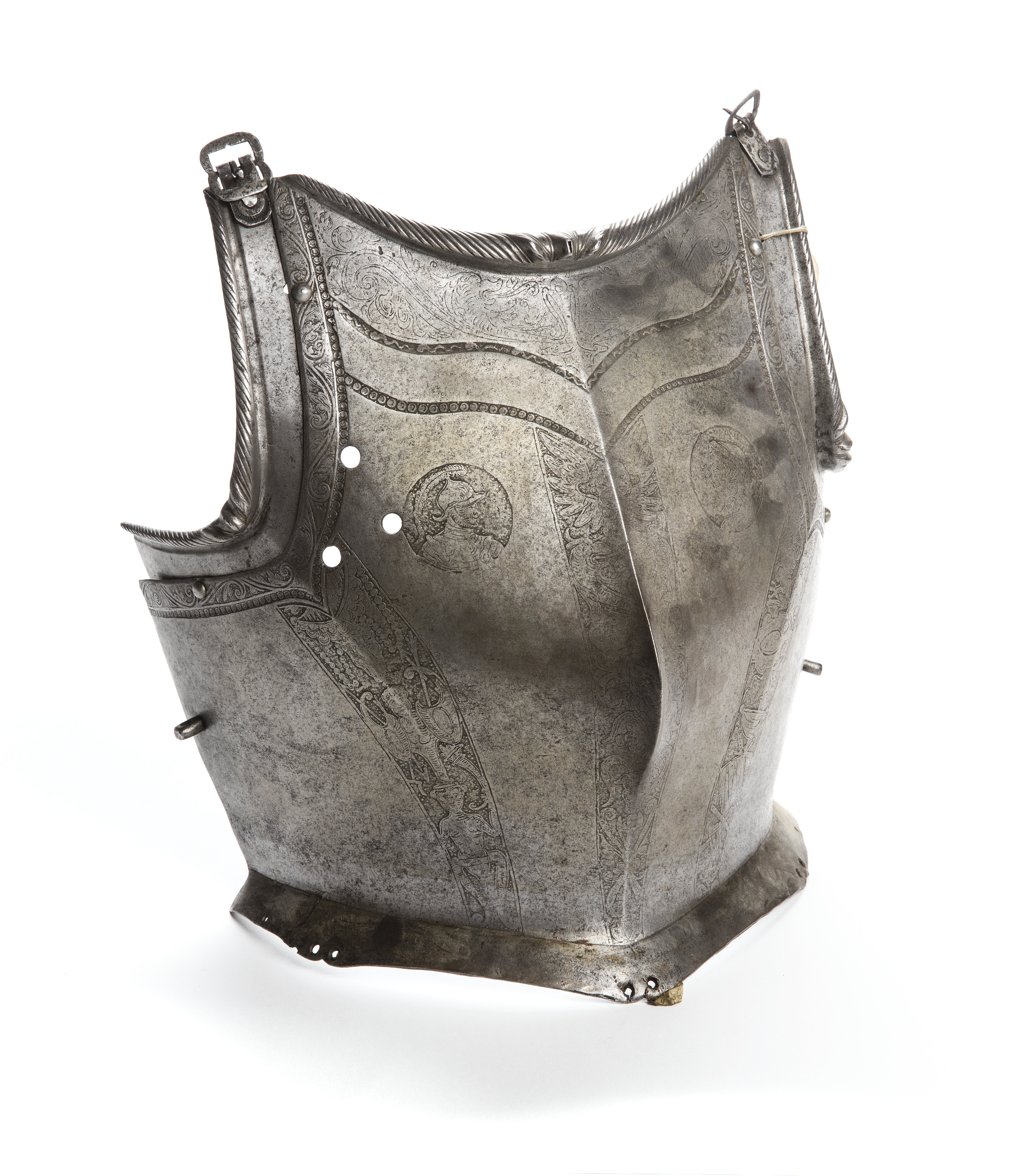 Bröstharnesk av smitt och etsat stål i tre delar. I underkant utvikt 20-25 mm. Hals- och armurtag med inåt vikt, rundsmidd kraftig kant med mejslad repstavsdekor med markerat mittparti med tre utskjutande vulster. Halsringningen uppdragen mitt bak i en spets. Innanför insättningarna har bröststycket fasad kant Därefter band av etsad rankdekor följt av nedsänkt linje med etsad pärlstavsdekor. Dekoren neddragen i en spets i höjd med armhålans underkant, spetsen fortsätter snett ner mot mitten till harneskets nederkant i en hamrad ås. Längs åsarna löper avsmalnande band med etsad dekor i form av trofégrupper och figurer. Nedanför halsringningens repstavsdekor ett fält med etsade lejonhuvuden och rankdekor. Därefter en nedsänkt linje med arbaletprofil med etsad vågig dekor som följs av ett slätt fält och därefter pärlstavsdekor. . Längs med mitten en kraftigt utskjutande taput. Utmed mittåsen ett nedåt avsmalnande band med etsad dekor i form av änglahuvud, gumshuvud, etc. På ömse sidor mitten, strax ovanför bröstvårtorna, etsade medaljonger med mansporträtt - det på högra sidan iförd rustning. Svagt konvext utvik med tre hålpar för fastsättning av bukskenor. Vid båda sidorna fastnitad hålförsedd ten. Nitarna för isättningarna och spännena är sekundära. Insidan med någon form beläggning (fernissa?). Vid axlar och midja sekundära remmar.