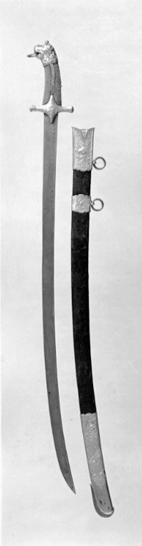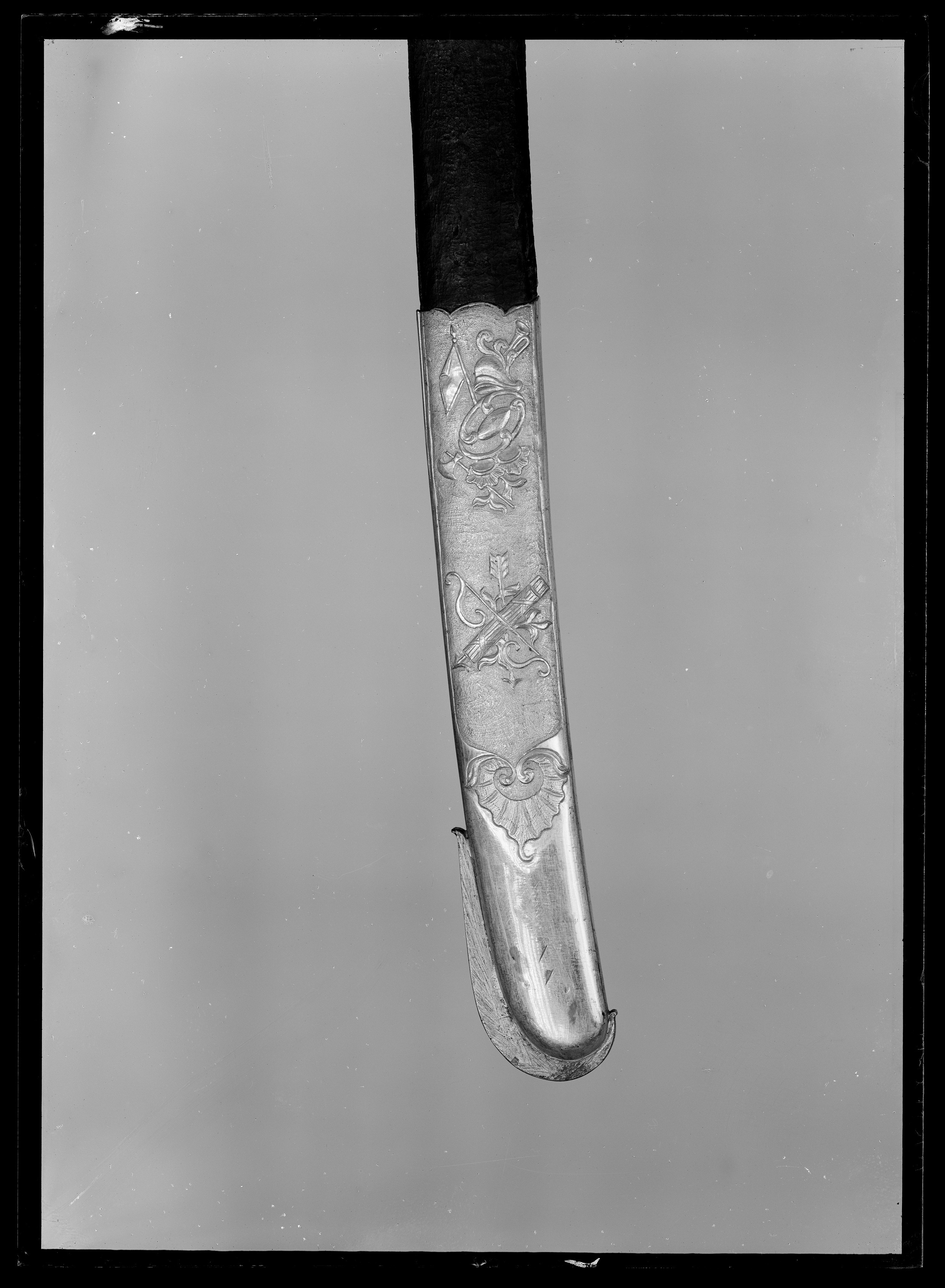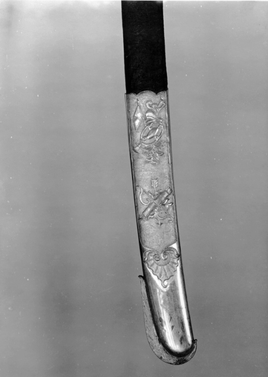 Balja klädd med svärtat läder med munbleck, mellanbeslag och doppsko av förgylld mässing, samtliga på utsidan smyckade med trofégrupper i relief mot punsad botten. Munbleck och mellanbeslag med koppelringar av stål. Urtag för styrskenan. Bård i form av rokokoornament kring detta. På munbleckets insida graverat: "Joh. Hend. Drachman Fourbisseur a Gothembourg". Doppsko med släpsko av stål, som går upp högre på eggsidan.