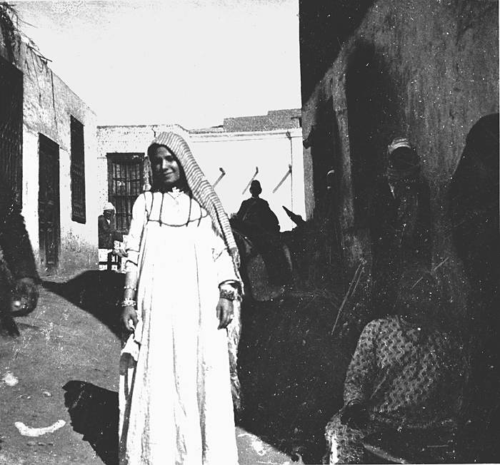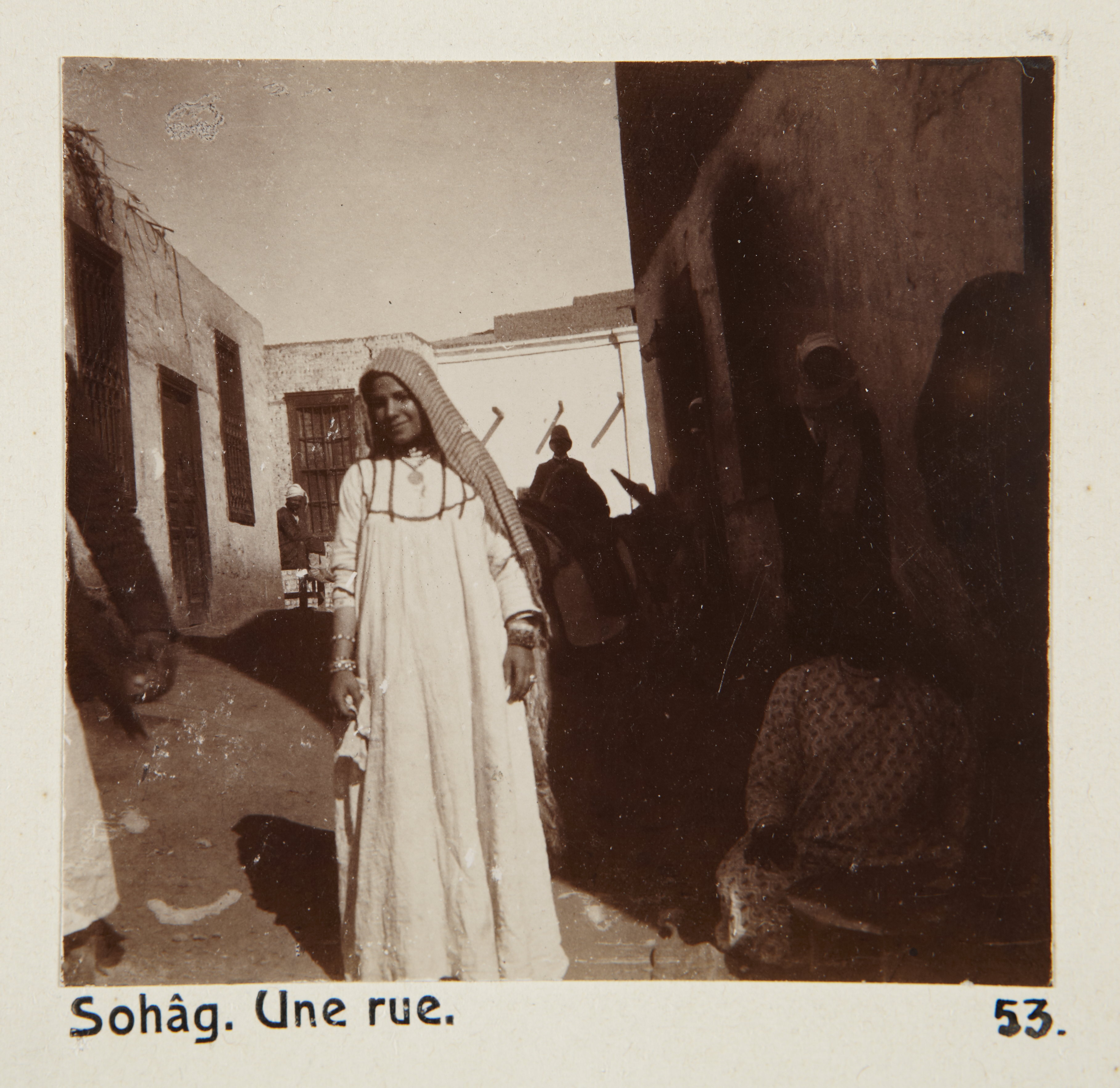 En gata i Sohag, Egypten. Text på fotografiet: Sohâg. Une rue Fotografierna LXVI:M.01.- 201. kommer från resan till Egypten och Sudan som Wilhelmina och Walther von Hallwyl gjorde vintern 1900-1901. De lämnade Sverige den 5 november 1900 och fortsatte från Egypten till Palestina den 28 mars 1901. Med på resan var döttrarna Ellen med maken Henric de Maré och Irma med maken Wilhelm von Geijer. Wilhelminas sällskapsdam, fröken Ida Uhse reste också med. Under en del av resan anslöt sig ledamoten av Internationella domstolen i Kairo, assessorn Otto Conrad Waldemar Cedercrantz med makan Anna Elisabeth. Vid resan uppför Nilen hade Walther von Hallwyl hyrt ångfartyget Columbia med besättning. Båtresan startade i Kairo 27 december 1900, gick ända till Wadi Halfa varifrån man reste vidare med tåg till Khartum och tillbaka till Wadi Halfa. Båten vände åter i riktning mot Kairo, men det verkar som att sällskapet tog tåg sista biten, från Luxor. Henric och Ellen de Maré samt fru Cedercrantz lämnade båten redan då de passerade Luxor första gången. Resten av sällskapet återvände till Kairo den 1 mars. Fotografierna LXVI:M.01.-120. togs av resenärerna själva, de största av Ellen de Maré, de mellersta av Wilhelmina von Hallwyl och de minsta av Wilhelm von Geijer. Resten köptes av professionella fotografer i Kairo, de flesta från Studio Photogr. Artistique G. Lekegian & Cie. Alla uppgifter kommer från Ida Uhses reseanteckningar.