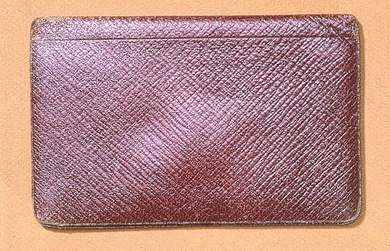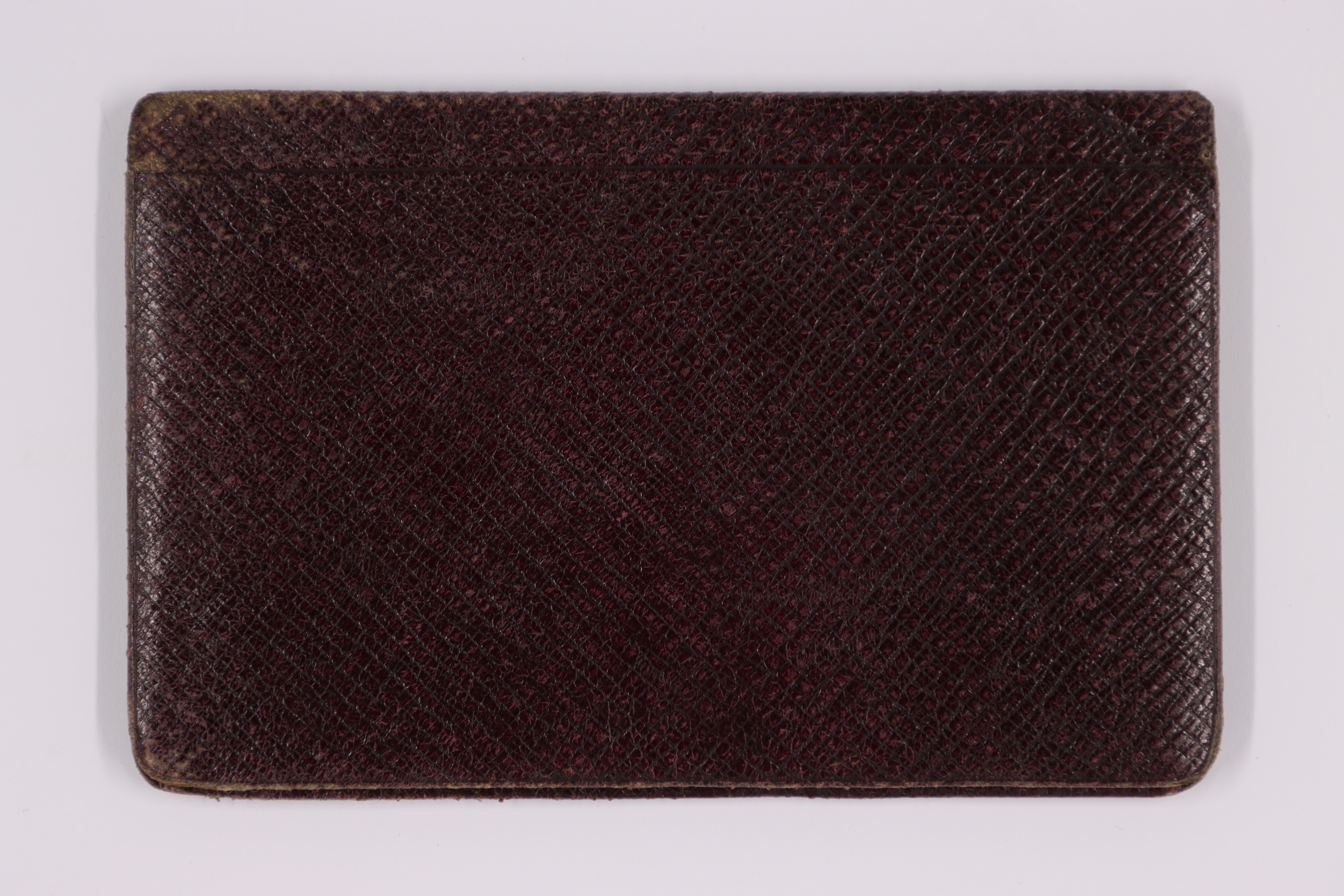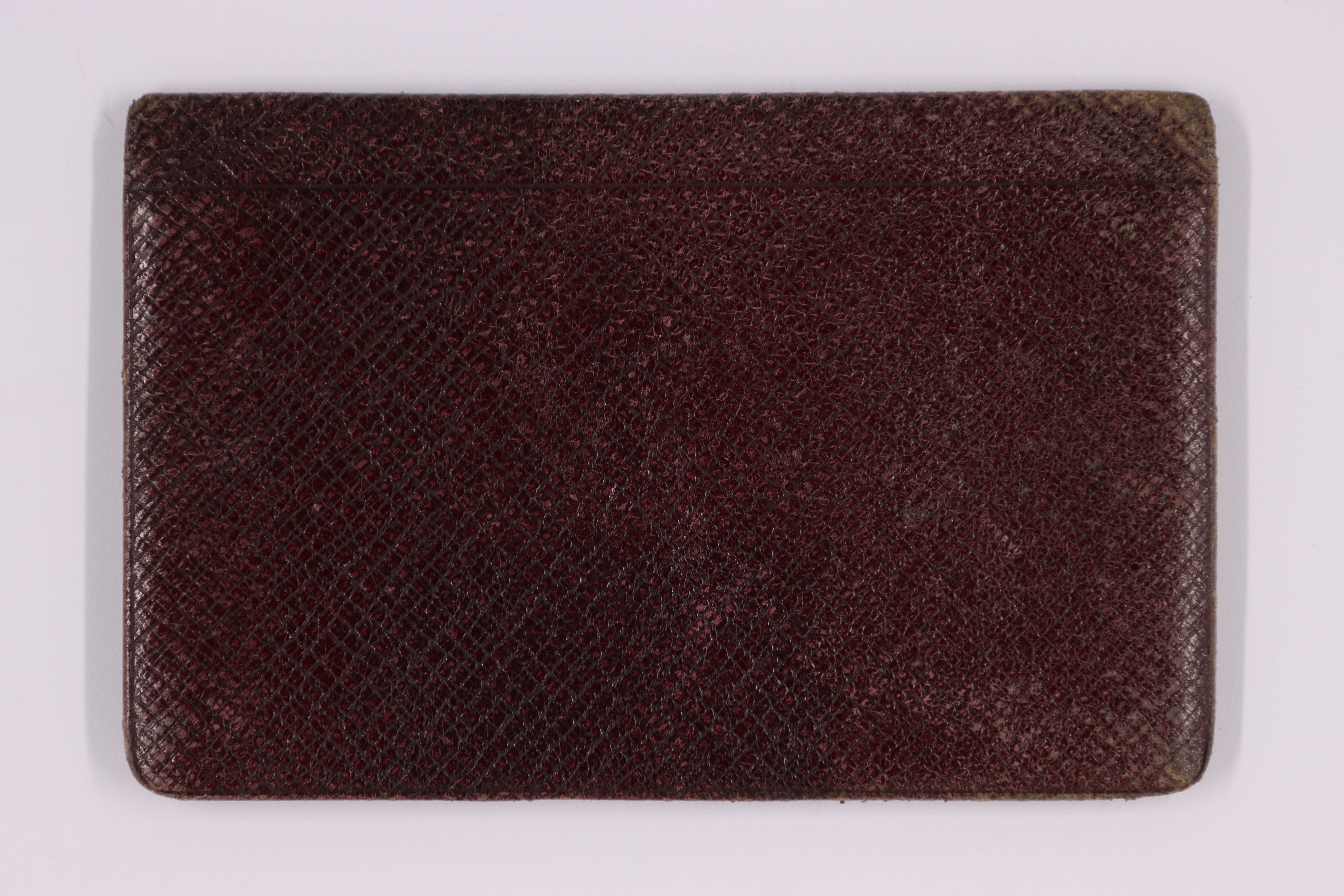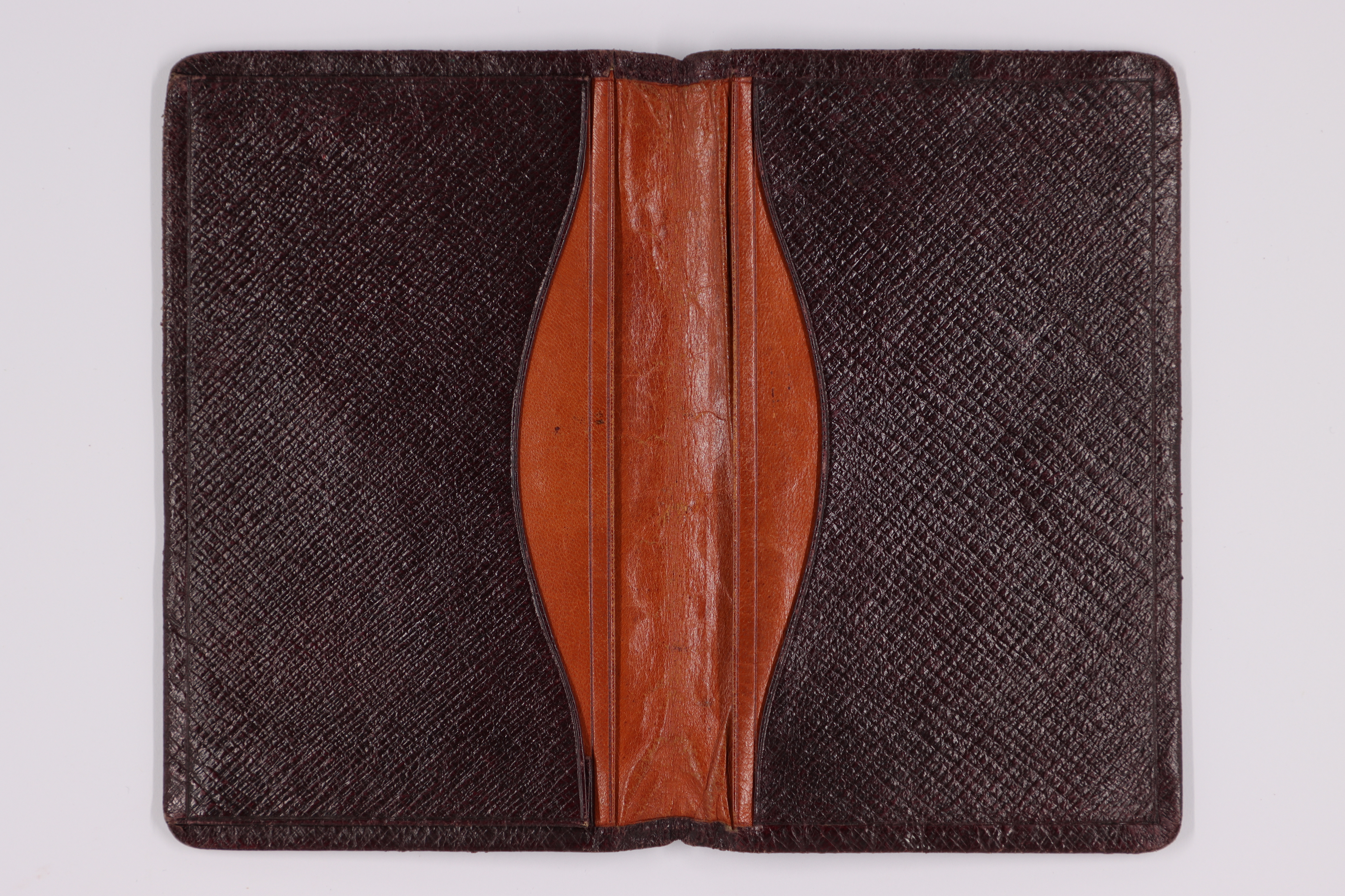 Mörkt vinröd plånbok av läder med präglad struktur som lite liknar ormskinn. Foder av ljusbrunt läder. Fyra fickor. I en ficka ligger ett visitkort med texten "Carl Gustaf Piehl, Civilingenjör, Stockholm".