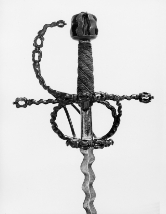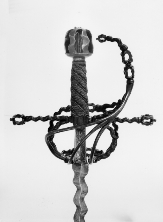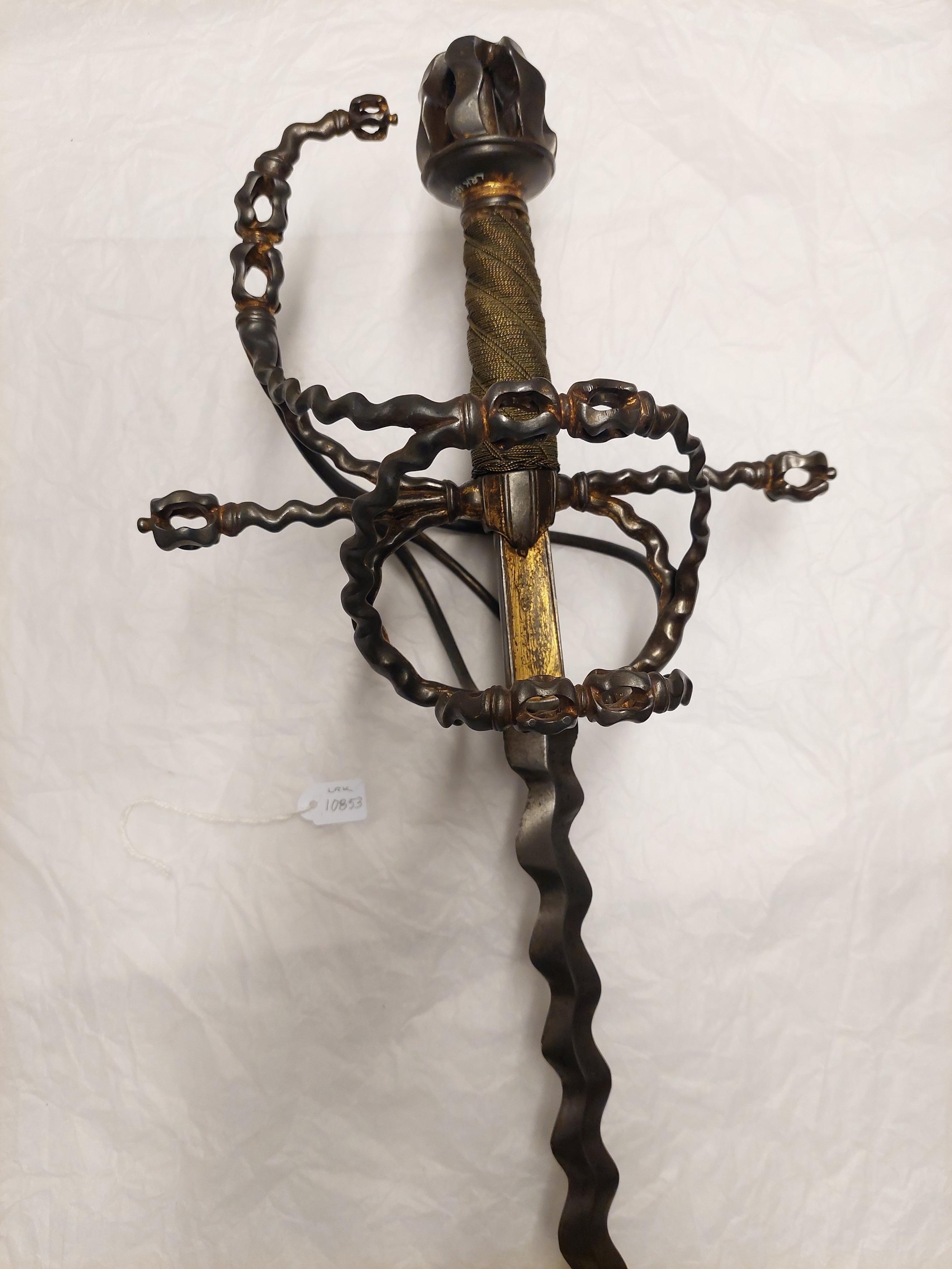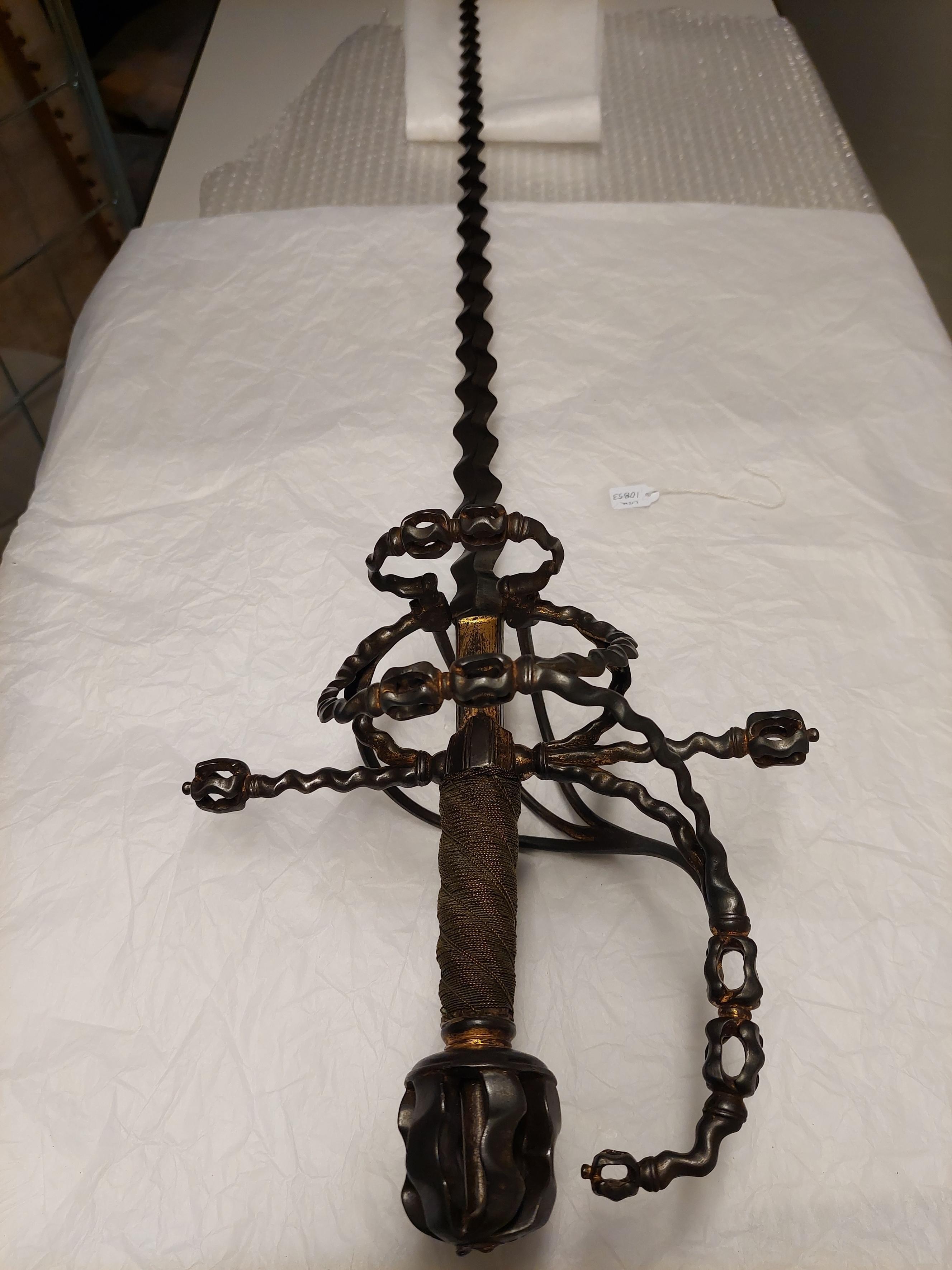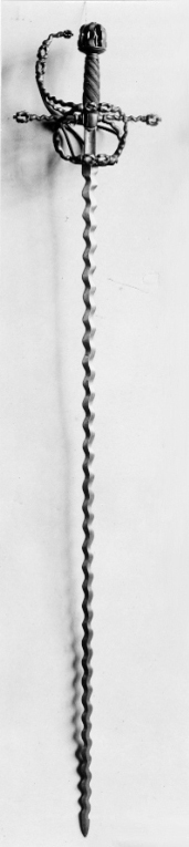 Bygelfäste av mörkt, ursprungligen förgyllt stål (guldet påslaget, endast obetydliga rester återstår). Samtliga delar vågformigt veckade, broskartade. Knapp (lös), tämligen stor, bildad av sex från varandra åtskilda, vertikala led, mellan vilka tångenär synlig, nitknappen sönderslagen (saknas). Handbygel vågformig, överdelen når fram till ca 10 mm från knappen. Parerstänger raka, långa med knoppformiga ytterändar, krysset nedtill utdraget i en spets. Pareranordningen i övrigt bestående av på ut- och insidan en sidobygel utgående något ovanför handbygelns mitt, den yttre övergående något ovanför krysset i en från fingerbyglarnas nederdel uppåtsvängd, stor bygel. Den inre sidobygeln i höjd med parerstängerna förgrenad i tre nedre, släta sidospänger, de två främre på vardera sidan av klingan anslutande till fingerbyglarnas nedre ändar, den bakre bakåtsvängd och anslutande till bakre fingerbygelns nederdel. Kavel spiralräfflad i sex varv, lindad med tvinnad, tunn, förgylld silvertråd, utmed räfflorna två tvinnade, förgyllda dylika. Klinga rak, lång, slipad med mötande, jämnbreda skär och, med undantag för ricasson utmed hela längden vågig, s.k. flammig. Ricasson, l: 55 mm ca, förgylld, på båda sidor med inslagen Sahagum-stämpel, ett krönt S i sköld (LRK vägl.1921:60).