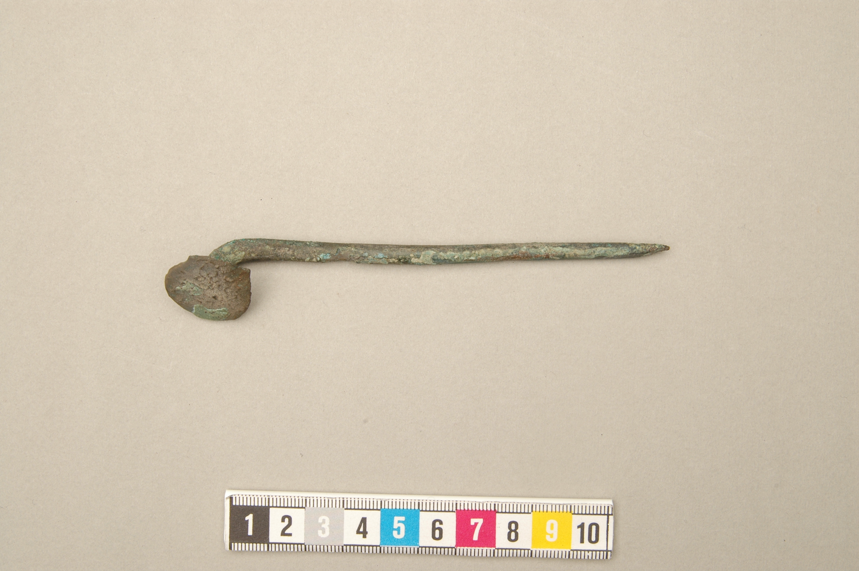 Skivnål av brons med litet huvud, ornerat med inpunsade koncentriska cirklar, som dock genom patinans bortfall till större delen har försvunnit.