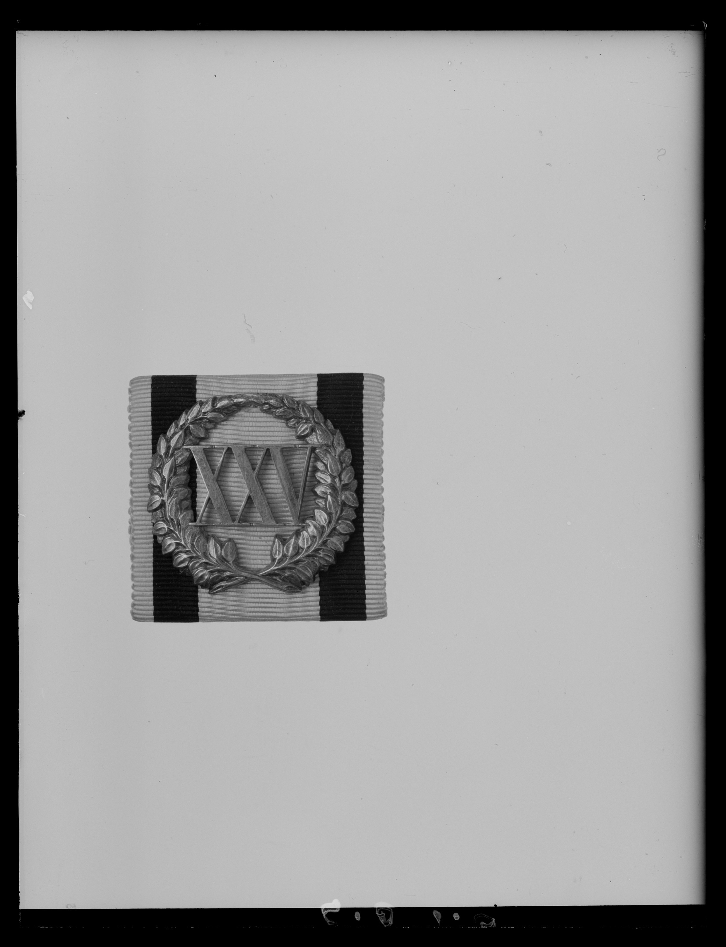 Kvadratisk platta av vitmetall, klädd med vitt sidenmoaréband med 6 mm breda, svarta kantränder, 3 mm från kanten (Järnkorsets band för ickekombattanter). Därpå fäst en lagerkrans av silver(?), omskrivande XXV. På baksidan en säkerhetsnål.