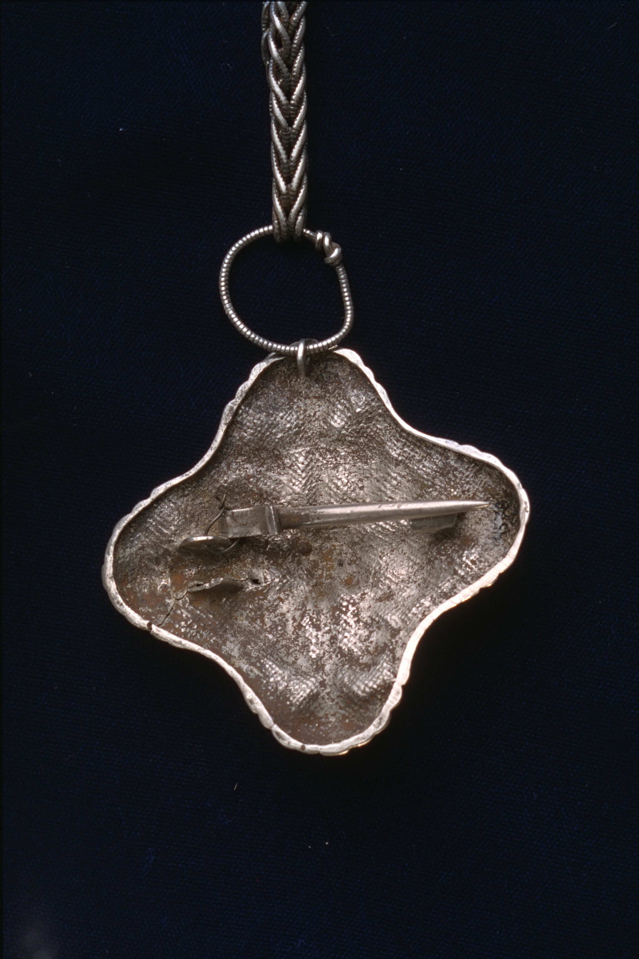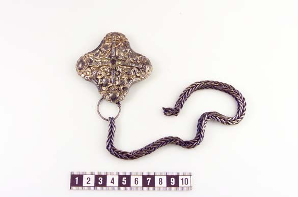 silverspänne, kvadratiskt, m kedja på spännets baksida intakt nålfäste med nål