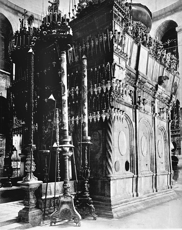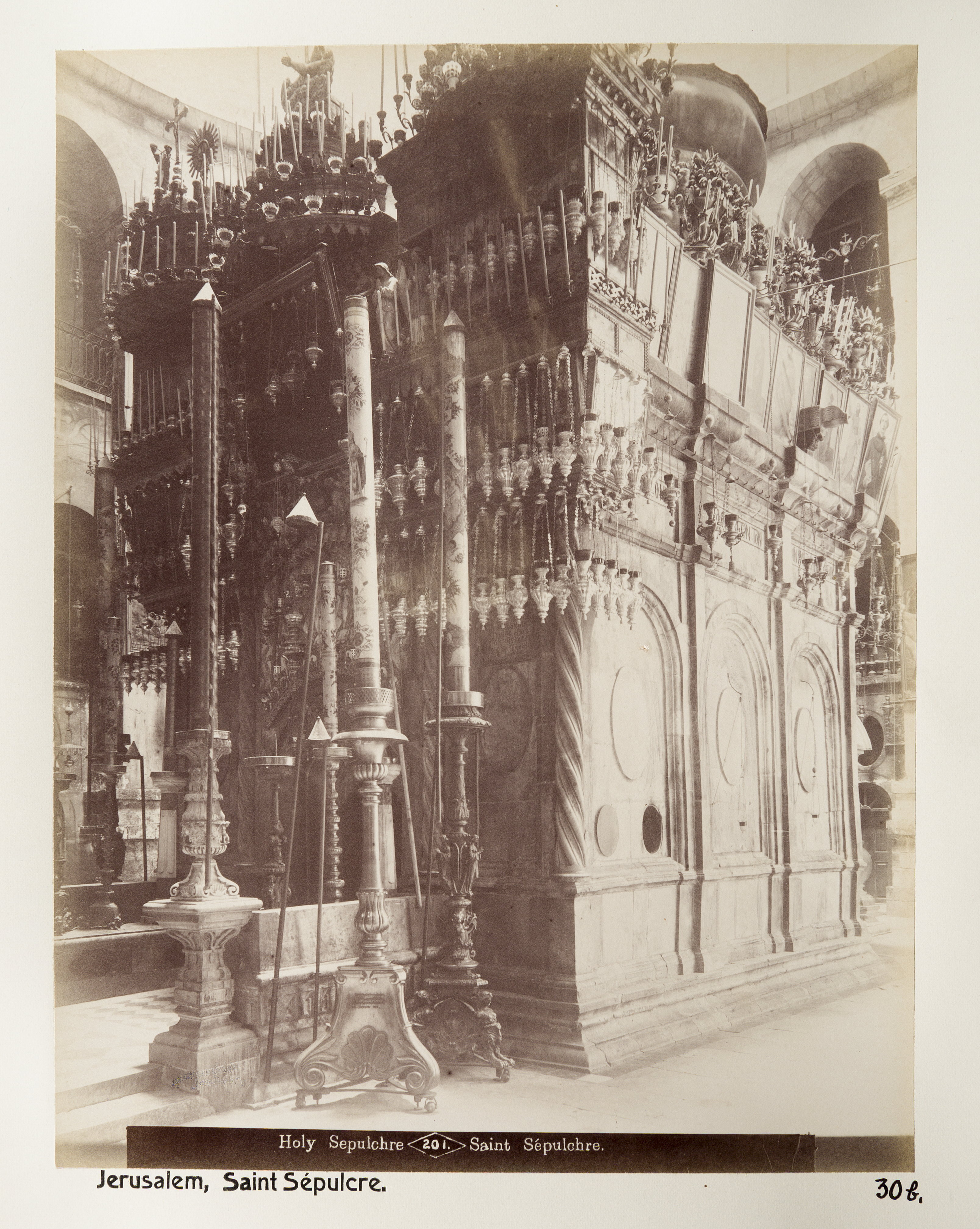 Den heliga graven i Jerusalem. Text på originalet: "Holy Sepulchre/Saint Sépulchre". Fotografierna LXVI:N.01.-180. kommer från resan till Palestina och Syrien som Wilhelmina och Walther von Hallwyl gjorde den 30 mars-27 april 1901. De lämnade Sverige den 5 november 1900 för Egypten, där de stannade till den 28 mars 1901, då de fortsatte till Palestina. Med på resan var Wilhelminas sällskapsdam, fröken Ida Uhse. Den 27 april fortsatte de till Turkiet och Mindre Asien. De mindre fotografierna (utom de från Samos) LXVI:N.90.-100. är tagna av Wilhelmina själv, under en resa till häst från Jerusalem till Damaskus 8-20 april 1901. Övriga fotografier är inköpta av Wilhelmina i Jerusalem, Damaskus och Beirut. Alla uppgifter kommer från Ida Uhses reseanteckningar.