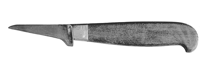 FÖRSKÄRARKNIV Av stål, med träskaft. Blad kort, smalt, spetsigt, med rak egg och rak bak samt spetsig udd, avspetsad från baken, vid skaftroten en flänsliknande utsvällning s. k. ansats. Skaftet av ebenholts, med plana sidor och flackrundade kanter, den undre något bågformig, på denna vid ytteränden en trubbig udd, på inneränden en holk av tenn. Längd: 18,3 cm. Blad, bredd: 2,2 cm. Skaft, längd: 12 cm. Svensk tillverkning; Eskilstuna Jernmanufaktur-Aktiebolag.
