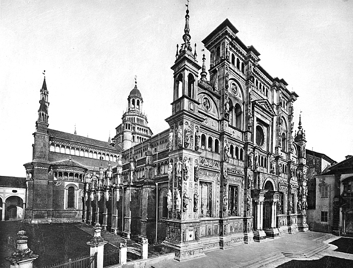 Fasad och sida av Certosa di Pavia, Pavias kartusiankloster. Foto från resa genom norra Italien och Rivieran samt åter över Schweiz, 22 september - 14 december 1890. Fotografierna LXVI:G.01.-07. är inköpta i Pavia och Hyères av Wilhelmina von Hallwyl, f. Kempe. Med på resan var maken Walther von Hallwyl, modern Johanna Kempe, f. Wallis, dottern Irma samt fröknarna Caroline Pflaum och Ida Uhse. Uppgifterna kommer från fröken Ida Uhses reseanteckningar.