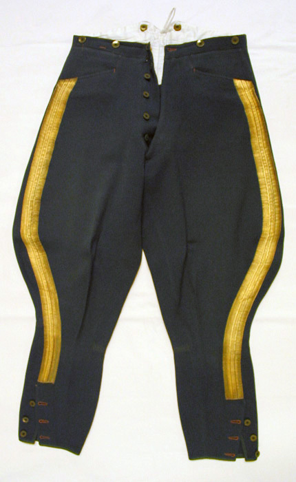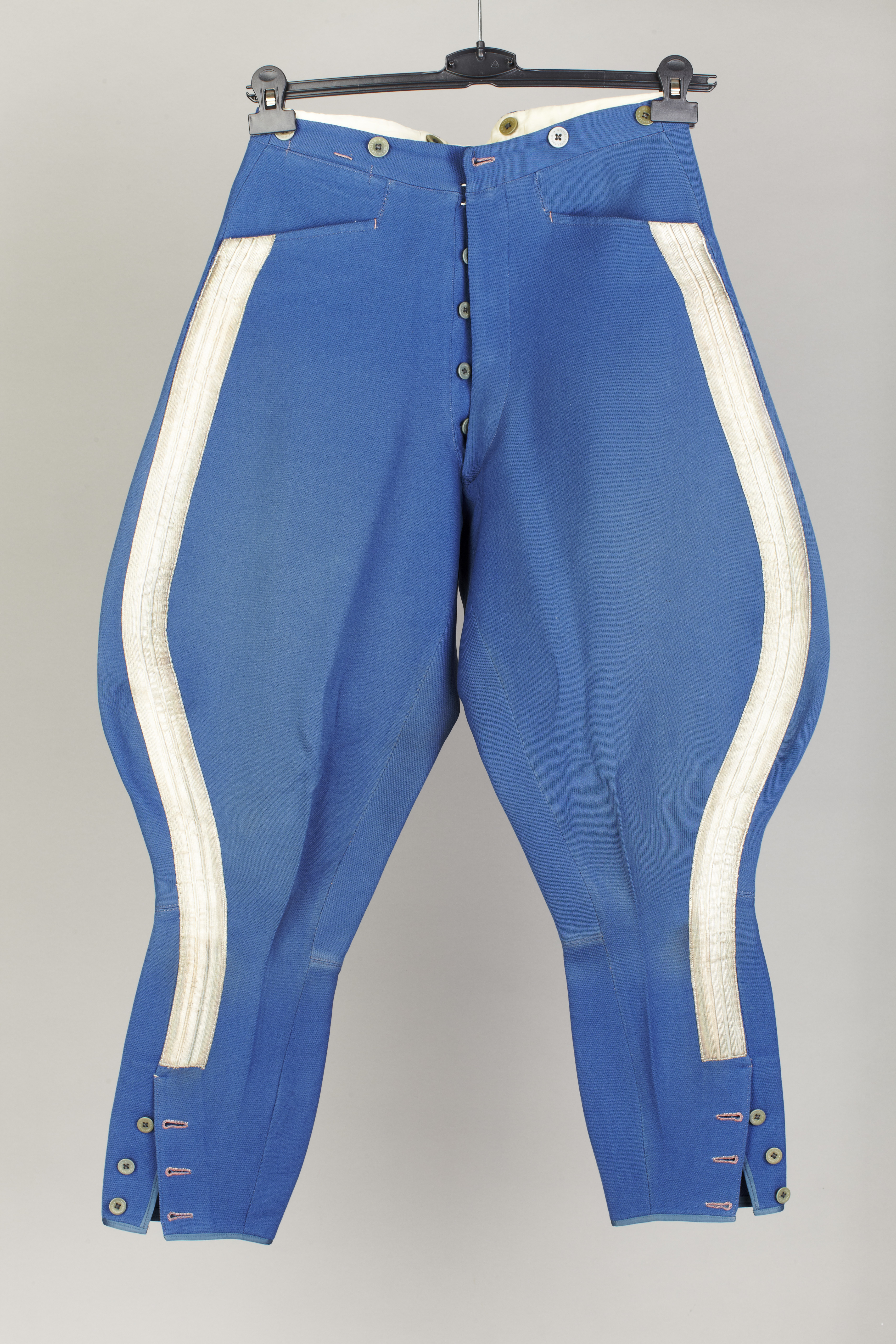 Ridbyxor till uniform för Kungliga Livregementet till häst K1. Ridbyxor av ljusblå diagonalvävt tyg med silvergaloner (ca 4 cm breda) i sidorna. Högt skurna i midjan och benen med stor vidd över låren. Nedtill vid bensluten sprund med tre knappar och knapphål. Gylf med fyra knappar med knapphål, en hake och hyska, samt på midjelinningen en knapp. På linningen ytterligare sex knappar, två bak och fyra fram. Alla knappar grå och av plast samt med texten: "MILITÄR EKIPERINGS AB". Fram två fickor samt en ficka på höger sida vid midjelinningen. Bak, på höger sida en infälld ficka. Byxans linning och överdel fodrad med benvitt bomullstyg. I linningen fäst en tamp för en inre knäppning av gylfen, på denna en vävd firmaetikett med benvit botten och blå invävd text: "Militär Ekiperings AB // Kungl. Hovleverantör // Stockholm den (Ifyllt för hand): 14/8 1925 // Herr (ifyllt för hand): H.K.H. Prins Gustaf Adolf" samt invävt firmämärke samt symbolen för Kunglig Hovleverantör.