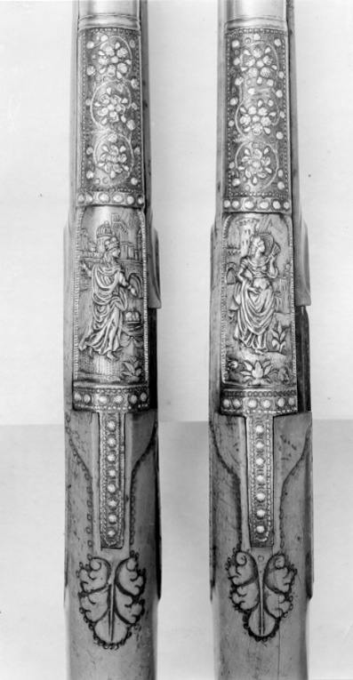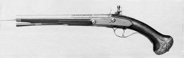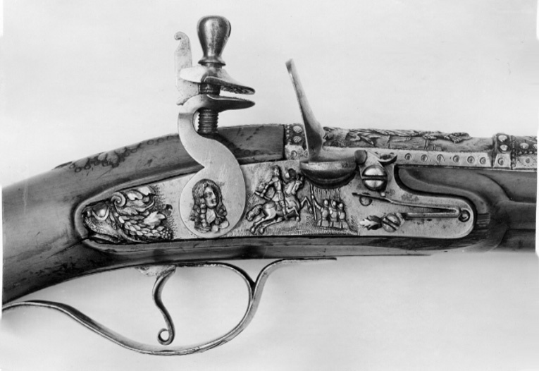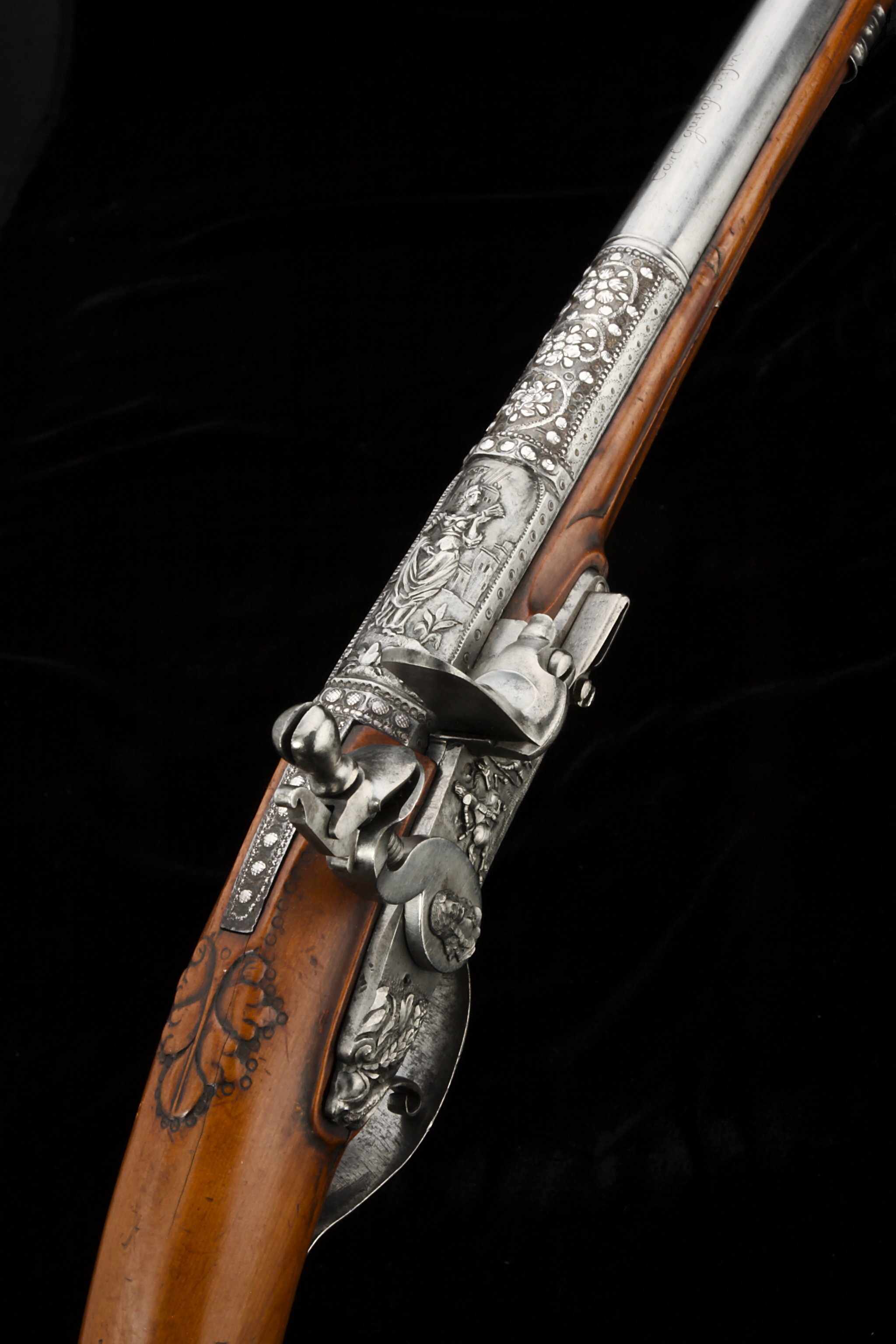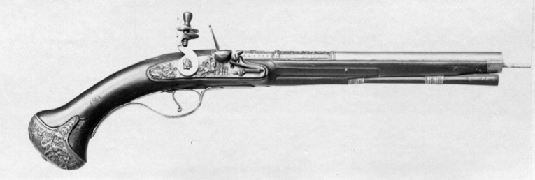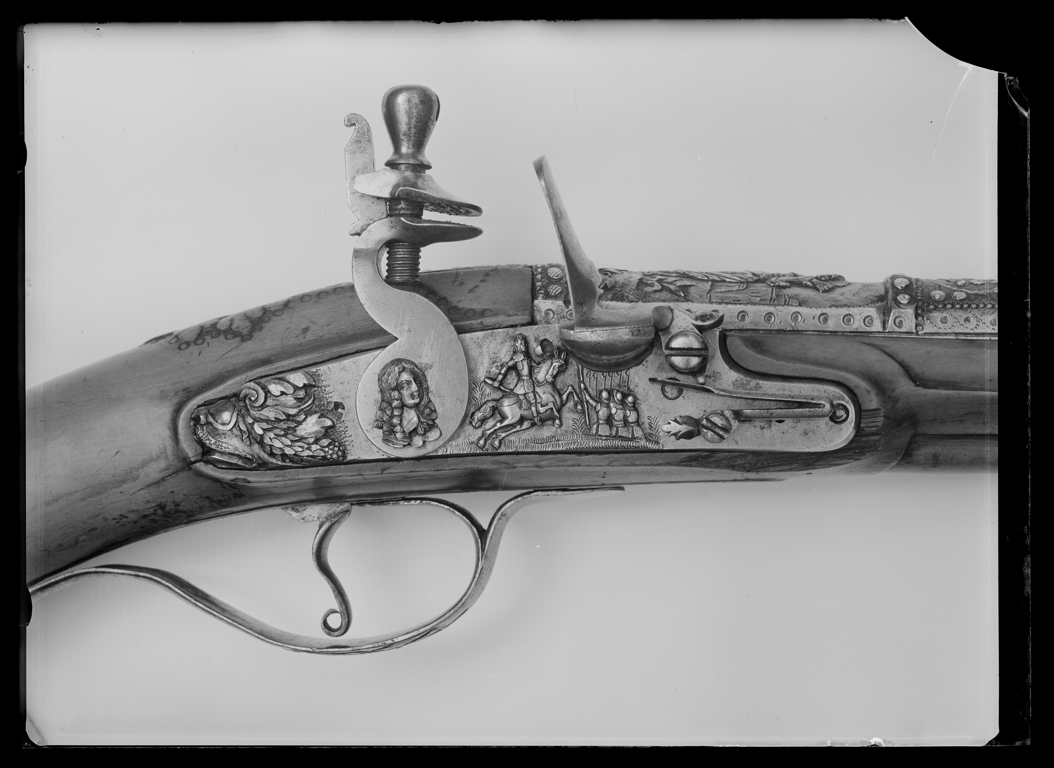Rund, slätborrad pipa av stål, rektangulärt, svagt böjt svansskruvblad. På svansskruvblad och pipbas påslagen silverdekor i form av korsskrafferade kulor samt pärlstavs- och bladbårder. På kammarens ovansida därframför fält med stålsnittsdekor, l: 54 mm, kvinna i djupt urringad klänning med släp över h arm, solfjäder i v hand, i bakgrunden borg. Därframför fält med påslagna blomrankor av silver, l: 52 mm. Resten av pipan slät, graverat ägarnamn: "Carl Gustaf Tessin". På kammarens undersida en otydlig stämpel med bokstäver, sista bokstäverna AS (möjligen COLAS, jfr nr 11670). Fästning: Två häften. Pipan fäst med bakrelåsskruven genom svansskruvplattan samt två pipstift av stål. Flintlås med plant låsbleck, svagt fasade kanter. Dekor i stålsnitt, på bakspetsen hundhuvud, övergående i bladfestonger, framför hanen ryttare i halvrustning, marskalksstav(?) i ena handen, därframför tre pikenerare(?), stående i sänka (benen syns ej). S-formig, platt hane, hanskruvens huvud täckt av porträttbyst i relief av man, fas höger, allongeperuk, nedvikt krage. Triangulära käkar, överkäken lös, kantig hangren, omvänt koniskt käkskruvhuvud. Rundad fängpanna, batteri med välvt fängpannelock, plan ovansida, rektangulärt eldstål med rundad överkant, filad dekor nertill på ryggen, liten kommaformig häl. Batterifjäder med litet, flikigt löv. Nöt utan studel. Fästning: Två låsskruvar. S-formig avtryckare med upprullad ände. Slätt avtryckarbleck. Helstock av buxbom, kolv med tillplattat ovalt tvärsnitt. Enkel snidad bladdekor bakom svansskruvbladet, däromkring samt runt svansskruvbladet inslaget bård av cirklar, på kolvens högra sida inslaget hertig Karl (XIII) rustkammarmärke. Beslag av stål, kolvkappa med korta flikar på kolvsidorna, dekor i stålsnitt, fältläger med tält och på ena sidan en ryttare med rundsköld och kroksabel, på motsatt sida en ryttare med en stav. På flikarna bladrankor samt blommor. Sidblecket saknas. Två svagt profilerade rörkor, slätt näsband. Varbygel med kluven framstolpe och kort främre arm, lång, slät bakre arm. Tillbehör: Laddstock av stockens trä(?), l: 279 mm.