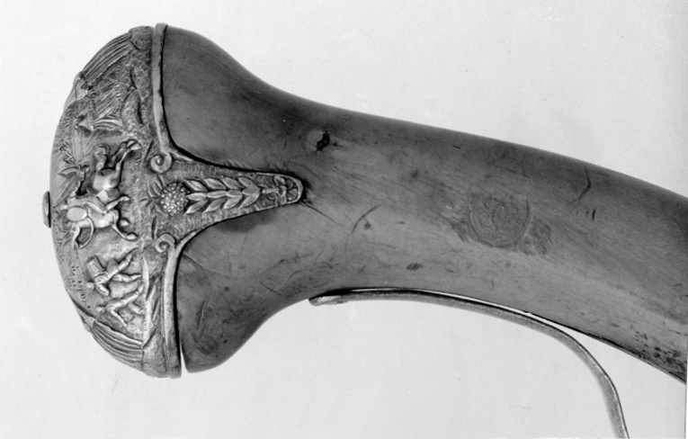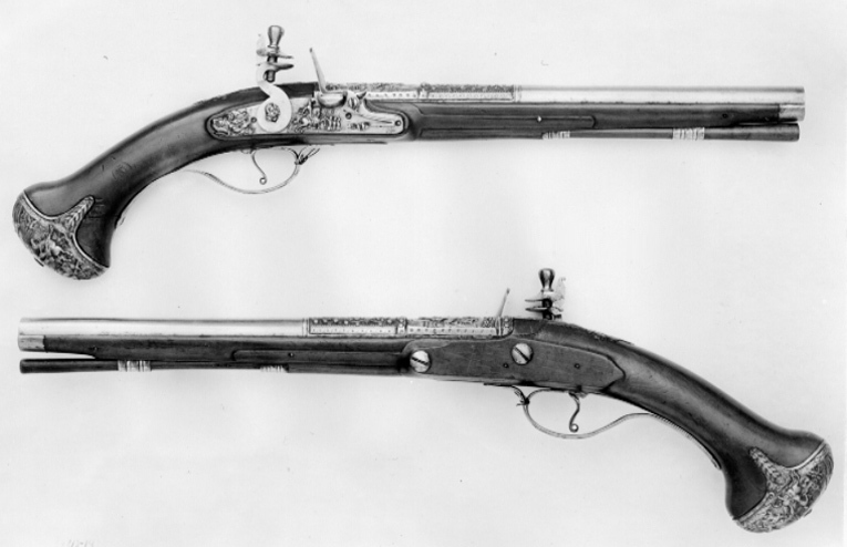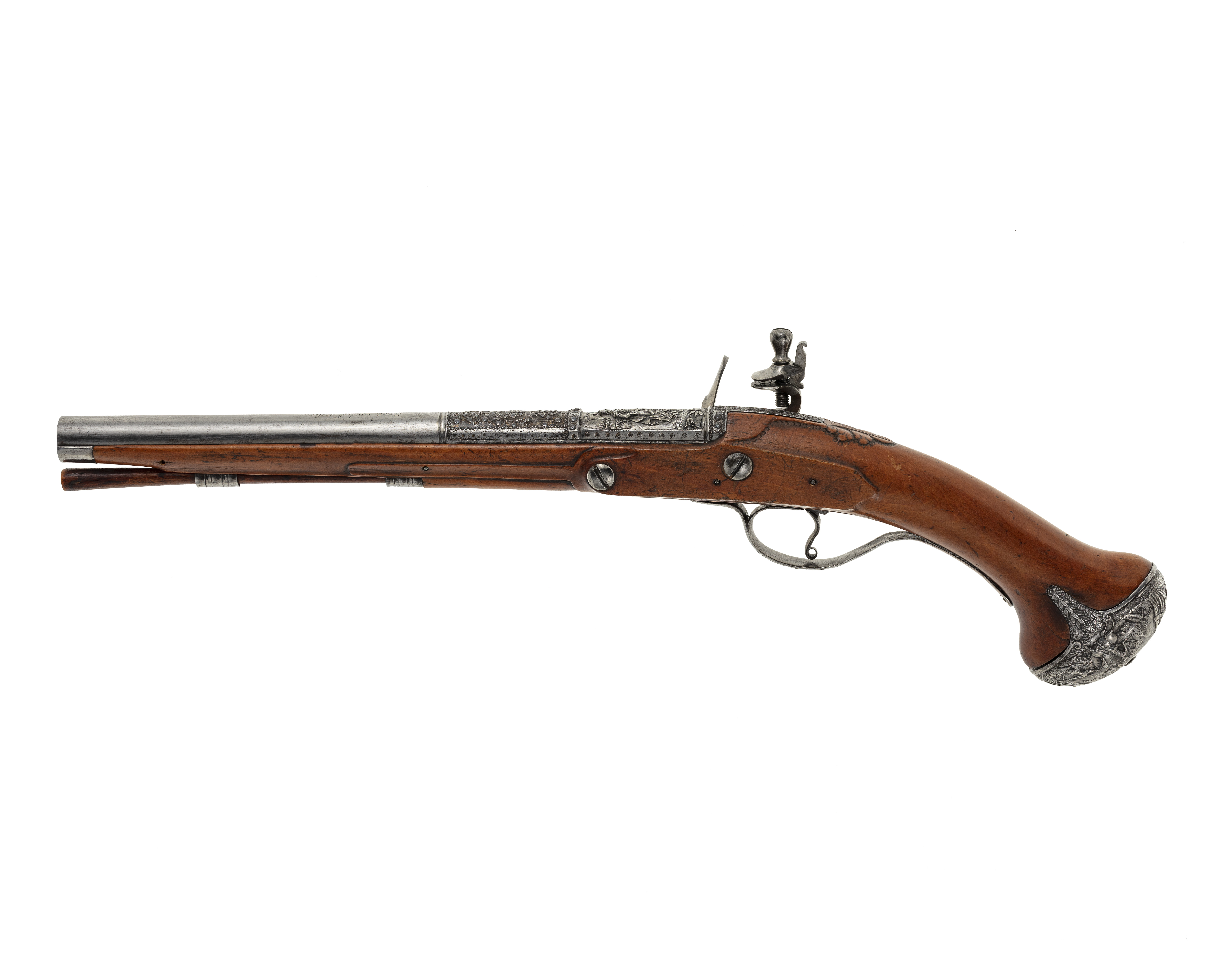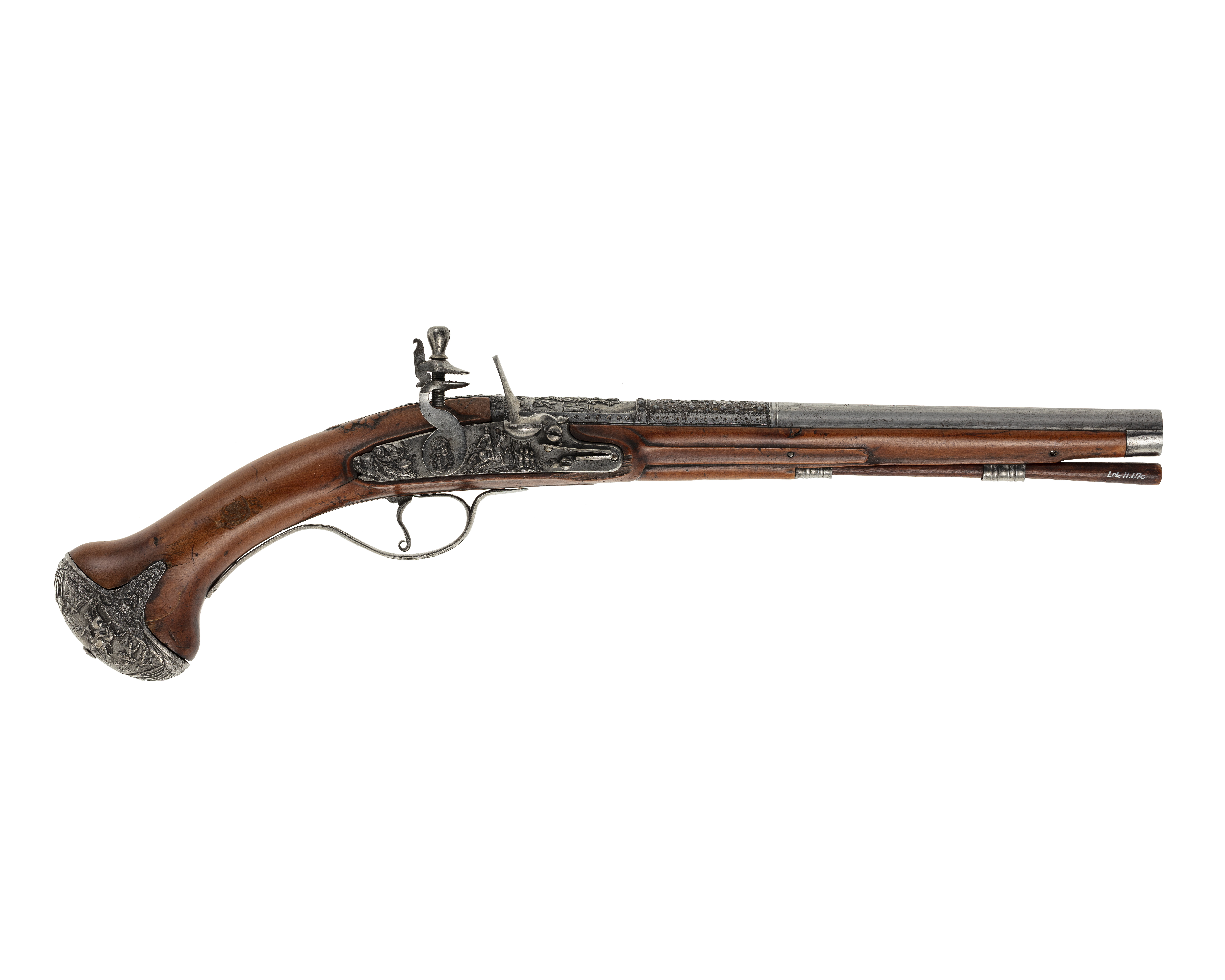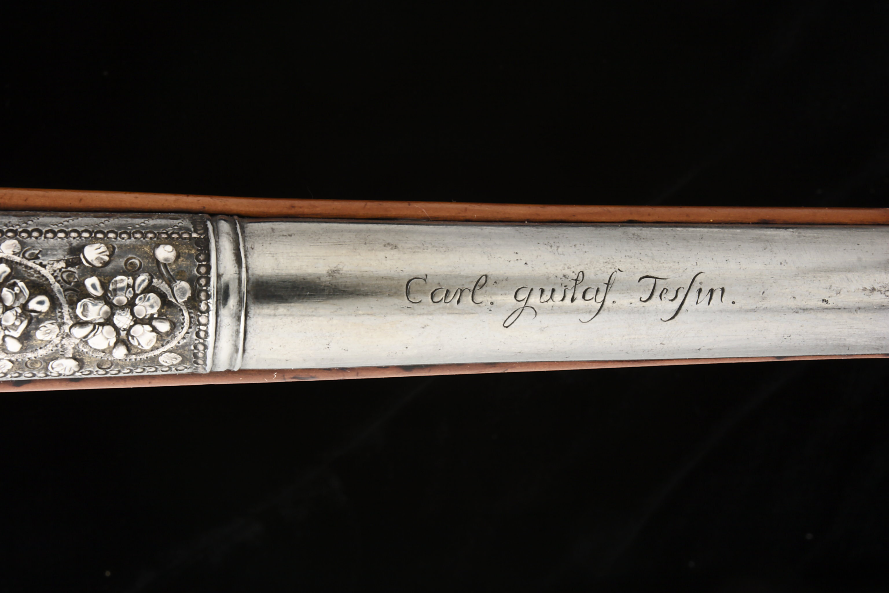 Rund, slätborrad pipa av stål, rektangulärt, svagt böjt svansskruvblad. På svansskruvblad och pipbas påslagen silverdekor i form av korsskrafferade kulor samt pärlstavs- och bladbårder. På kammarens ovansida därframför fält med stålsnittsdekor, l: 54 mm, kvinna i djupt urringad klänning med släp över h arm, solfjäder i v hand, i bakgrunden borg. Därframför fält med påslagna blomrankor av silver, l: 52 mm. Resten av pipan slät, graverat ägarnamn: "Carl Gustaf Tessin". På kammarens undersida en otydlig stämpel med bokstäver, sista bokstäverna AS (möjligen COLAS, jfr nr 11670). Fästning: Två häften. Pipan fäst med bakrelåsskruven genom svansskruvplattan samt två pipstift av stål. Flintlås med plant låsbleck, svagt fasade kanter. Dekor i stålsnitt, på bakspetsen hundhuvud, övergående i bladfestonger, framför hanen ryttare i halvrustning, marskalksstav(?) i ena handen, därframför tre pikenerare(?), stående i sänka (benen syns ej). S-formig, platt hane, hanskruvens huvud täckt av porträttbyst i relief av man, fas höger, allongeperuk, nedvikt krage. Triangulära käkar, överkäken lös, kantig hangren, omvänt koniskt käkskruvhuvud. Rundad fängpanna, batteri med välvt fängpannelock, plan ovansida, rektangulärt eldstål med rundad överkant, filad dekor nertill på ryggen, liten kommaformig häl. Batterifjäder med litet, flikigt löv. Nöt utan studel. Fästning: Två låsskruvar. S-formig avtryckare med upprullad ände. Slätt avtryckarbleck. Helstock av buxbom, kolv med tillplattat ovalt tvärsnitt. Enkel snidad bladdekor bakom svansskruvbladet, däromkring samt runt svansskruvbladet inslaget bård av cirklar, på kolvens högra sida inslaget hertig Karl (XIII) rustkammarmärke. Beslag av stål, kolvkappa med korta flikar på kolvsidorna, dekor i stålsnitt, fältläger med tält och på ena sidan en ryttare med rundsköld och kroksabel, på motsatt sida en ryttare med en stav. På flikarna bladrankor samt blommor. Sidblecket saknas. Två svagt profilerade rörkor, slätt näsband. Varbygel med kluven framstolpe och kort främre arm, lång, slät bakre arm. Tillbehör: Laddstock av stockens trä(?), l: 279 mm.