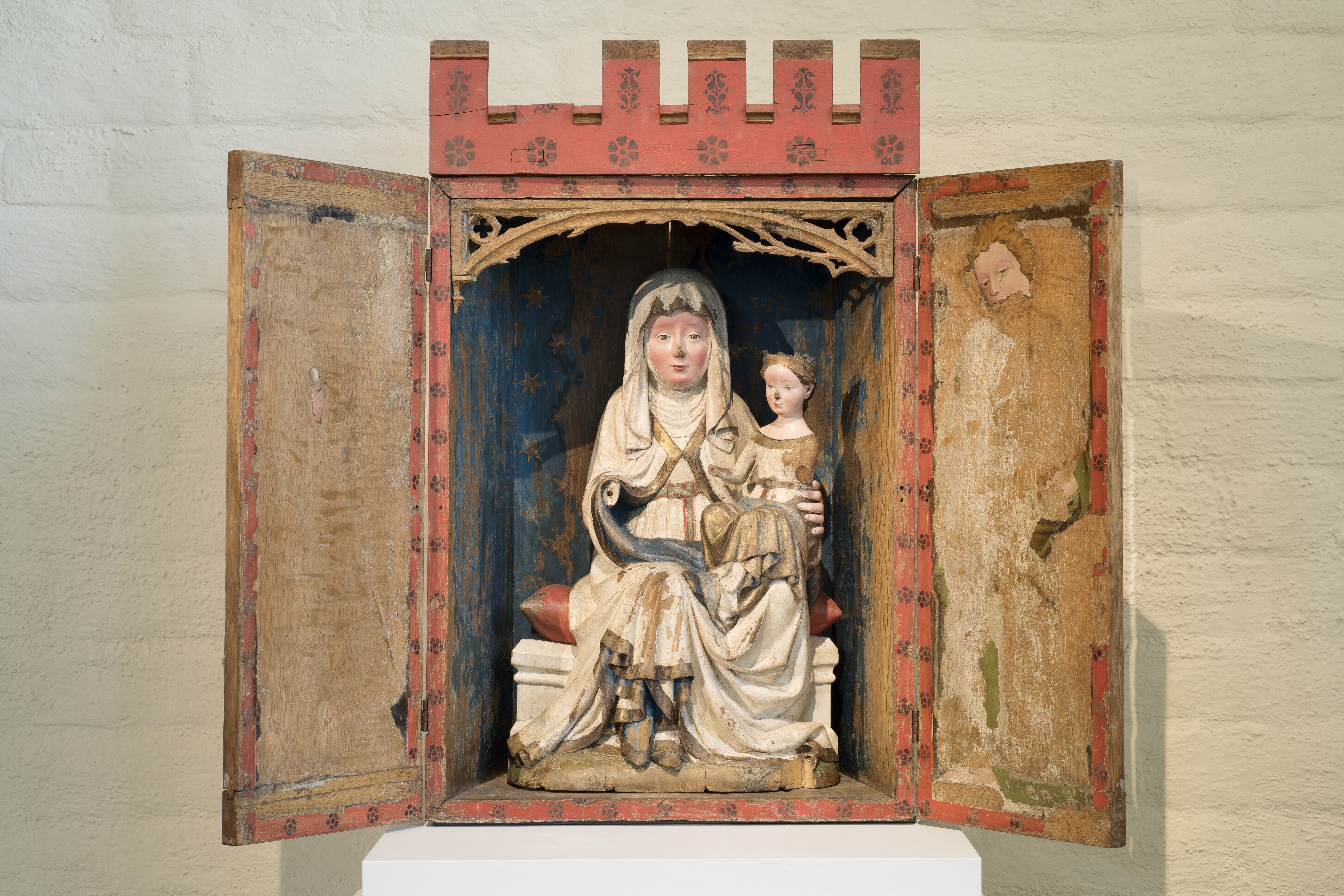 lövträ (skulptur), ek (skåp). Kondition: barnet, Annas högra hand och båda Marias förlorade. Färg: skulpturgruppens färg i huvudsak välbevarad, flyglarnas målningar nästan helt utplånade.