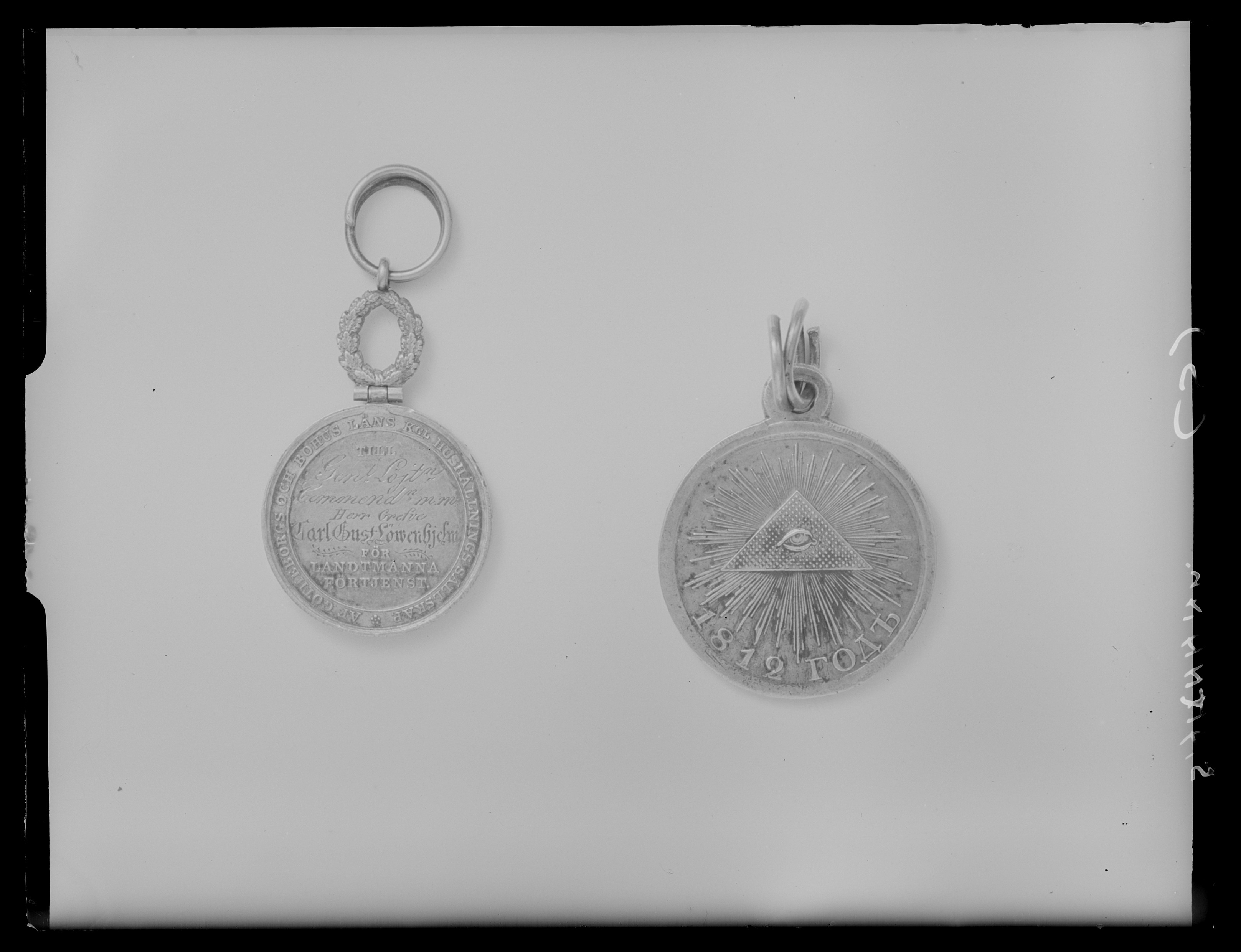 Åtsida: Guds allseende öga, rysk omskrift nertill: 1812 GODI (år 1812). Frånsida: rysk text: NE NAMb // A IMENI // TVOEMU (icke för oss, icke för oss utan för ditt namn (s ära)). Upptill platt ring, däri fäst spiralformig bandring.