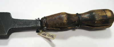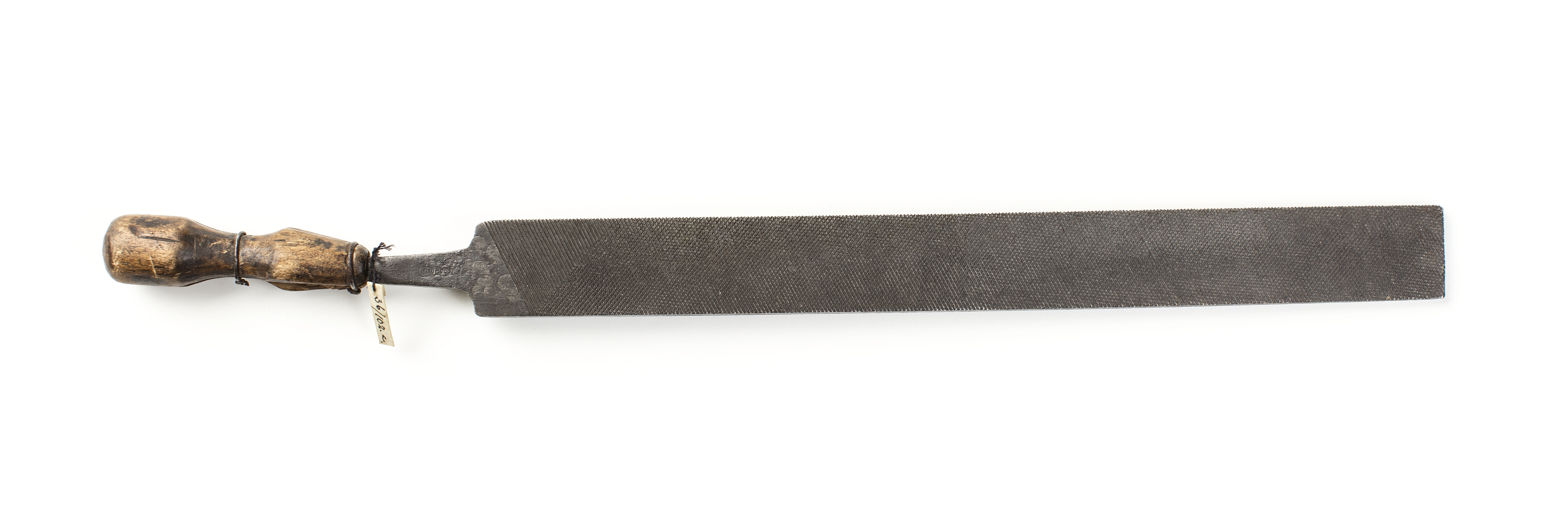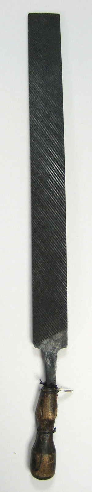 Ur bössmakare Johan Rings verkstad. Blad av mörkt stål. Långsmalt med rektangulärt tvärsnitt, bredsidorna dubbelgradiga, ena smalsidan slät den andra med enkel enkelgradig. Nertill tånge med tillverkarstämpel med halvmåne och "C.O. ÖBERG & Co. ESKILSTUNA", och på motstående sida inom ram "GARANTI". Grepp tillskuret av mörkbrunt trä, rundat med insvängt mittparti. I mitten och framtill lindad med ståltråd.