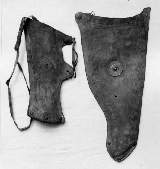 Koger av ljusbrunt läder med insidan ut. Insatt spetsoval botten. Kogrets utsida ornerad med pressad dekor i form av bårder. Nedre delen täckt av flikigt konturerat av samma slag. På mitten hjärtformigt beslag av förgyllt silver med graverad rankdekor med ciselerat mittornament och kant av tvinnade trådar och små rosetter. Ett större och tre mindre rosettformiga beslag av förgyllt och ciselerat silver. Insidan utan dekor med fästen för gehäng. Tillbehör: Gehäng av blått läder ca 20 mm brett med beslag av förgylld vit metall (silver?) tre tampar, sex hålskoningar, tre sleifhylsor, en krok och ett mindre beslag, alla ornerade med graverade snirklar och växtdekor. På den mellersta sleifhylsan två infattade turkoser.