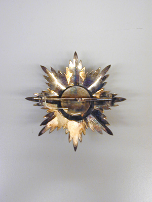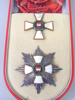Åttauddig, flinkerad strålstjärna av silver(?), i mitten ordenskorset, vitemaljerat Georgskors med röda kantränder. Medaljong av karminröd emalj, belagd med sköld i Ungerns färger (två ggr delad rött-vitt-grönt), runtom en grönemaljerad lagerkrans. Med blyerts tillskrivet: "Röda förtjänstkorset".