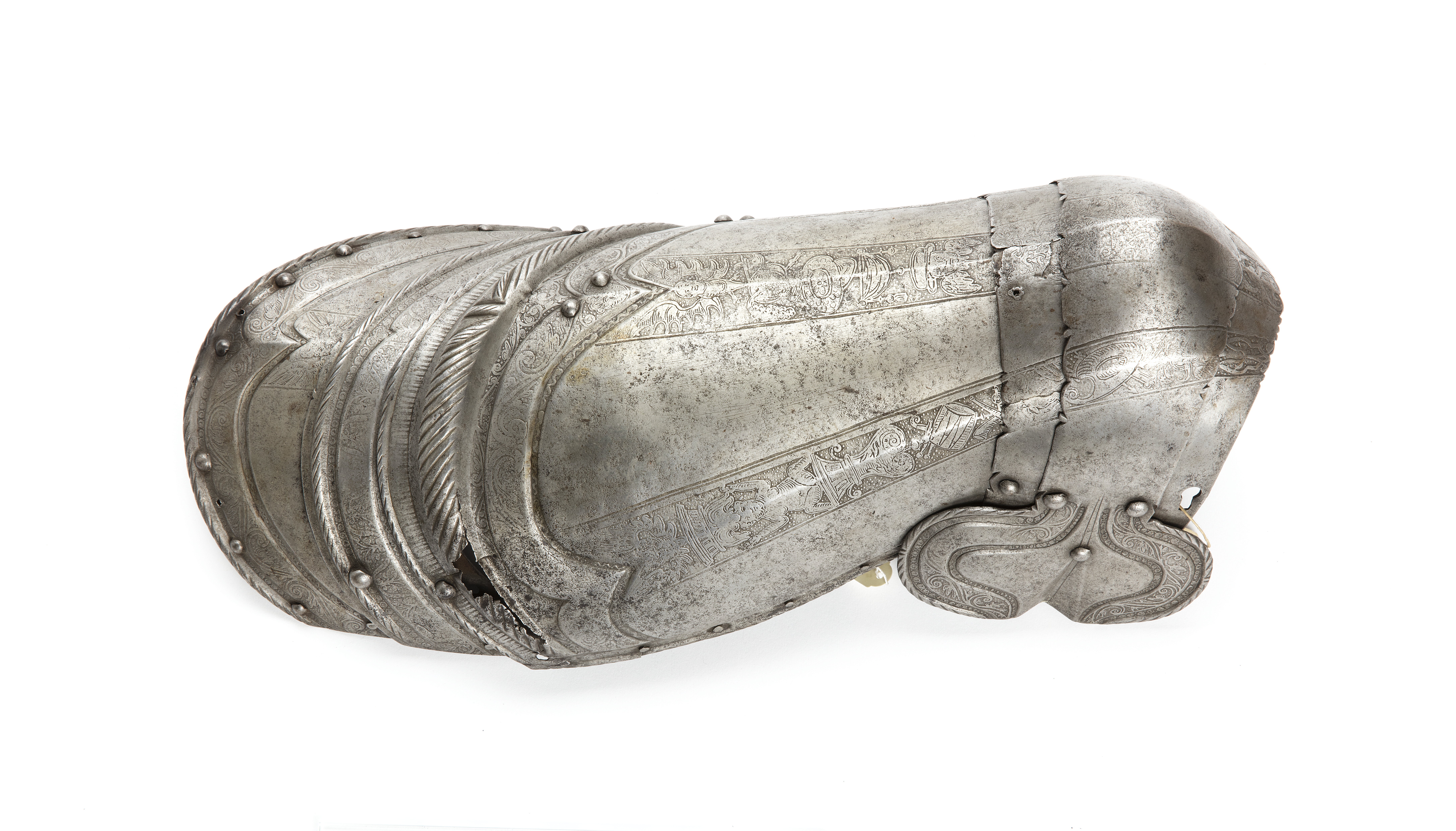 Denna rustningsdel utgör en del av en rustning som inkom till Livrustkammaren genom Karl XV:s testamente. Den hade tidigare varit överintendenten Fritz von Dardels ägo. Till denna rustning, som tillverkats i Nordtyskland under 1500-talet mitt, tillverkades under 1800-talet kompletterande delar. Dessa avlägsnades år 1894 men finns fortfarande kvar i Livrustkammarens samlingar.
