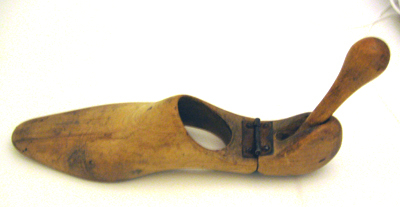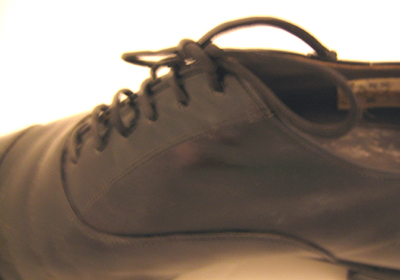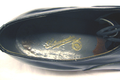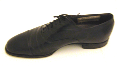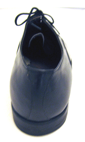 Skon är tillverkad av blankt svart kalvskinn och har sluten snörning. Modellen är en enkel Oxfordsko med en tvåtrådssöm som löper längs med den svagt rundade tåhättan samt gränsen mellan bladet och siddelarna. Bakkappan är delad med bakrem. Skon snörs med sex par snörhål. Den underliggande svarta plösen är fodrad med benvit filt. Skon har randsydd sula och bred låg klack Den främre delen av skon är fodrad med benvitt linne och bakkappan med grått kalvskinn. Innersulan är av brunt nötläder som i hälpartiet har täckts med en grå halvsula av kalvskinn. Klacken uppbyggd av tre läderdelar. Stiftlapp av läder är fastsatt med 21 små metallstift. Den är förstärkt baktill med en svart diagonalt skuren gummilapp?