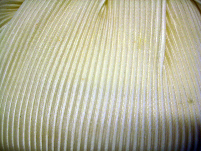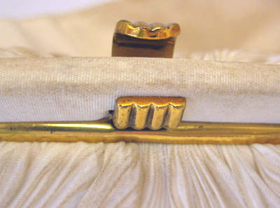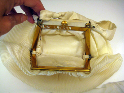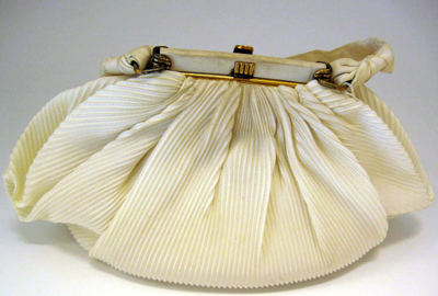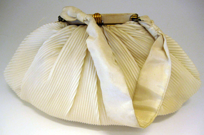 Väska av vit siden. Pliserad. Kraftigt rundad botten. Djupa veck i sidorna. Smärre veck upp mot ramen. Rem av slätt siden, fästad i ramen med fyrkantiga öglor av gulmetall. Ramen av gulmetall går ner längs sidorna, 75 mm. Väskan låses med knäppe av gulmetall i form av räfflad halvcirkel. Inuti fodrad med vit siden. En ficka i vilken ligger en spegel. På fickan liten lapp med ordet: "Import".