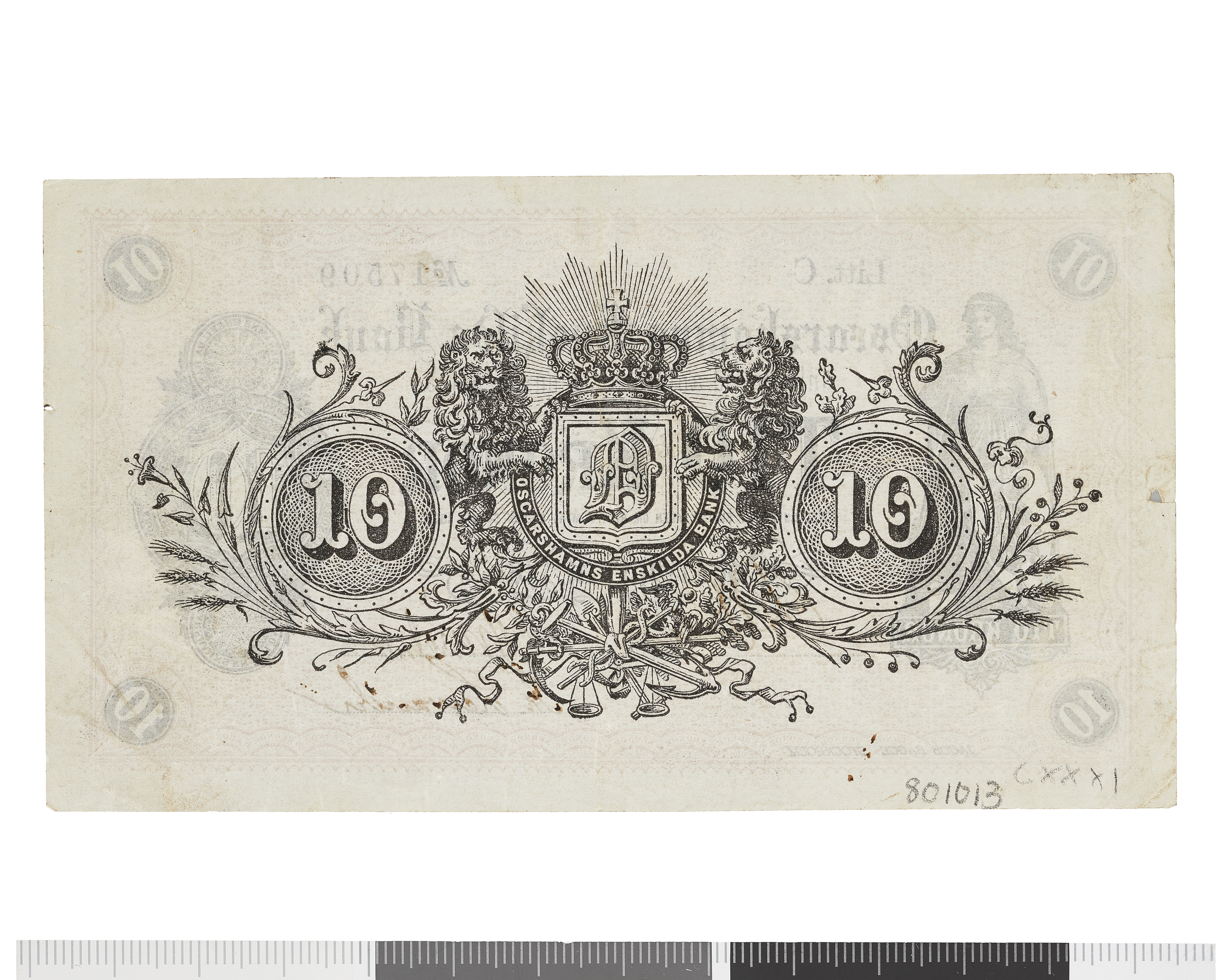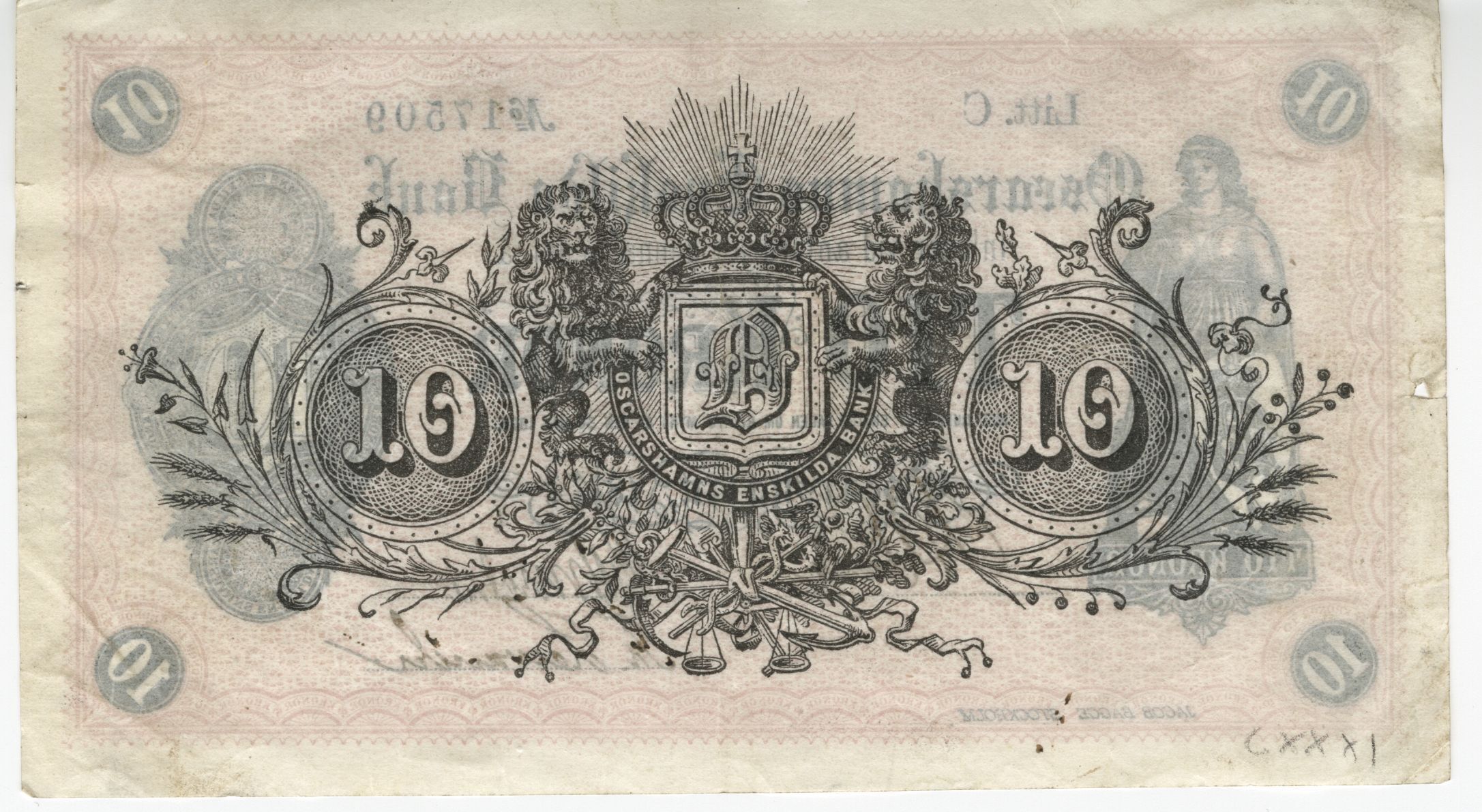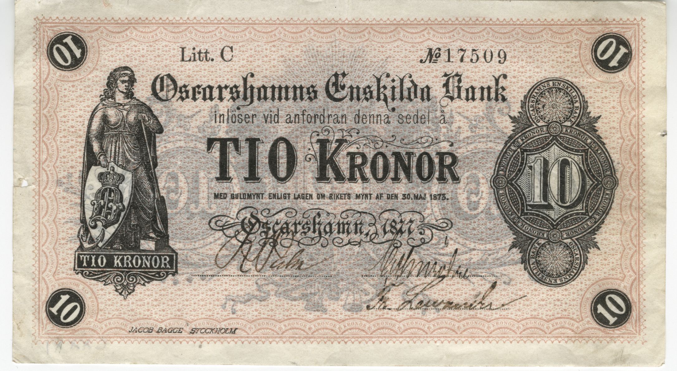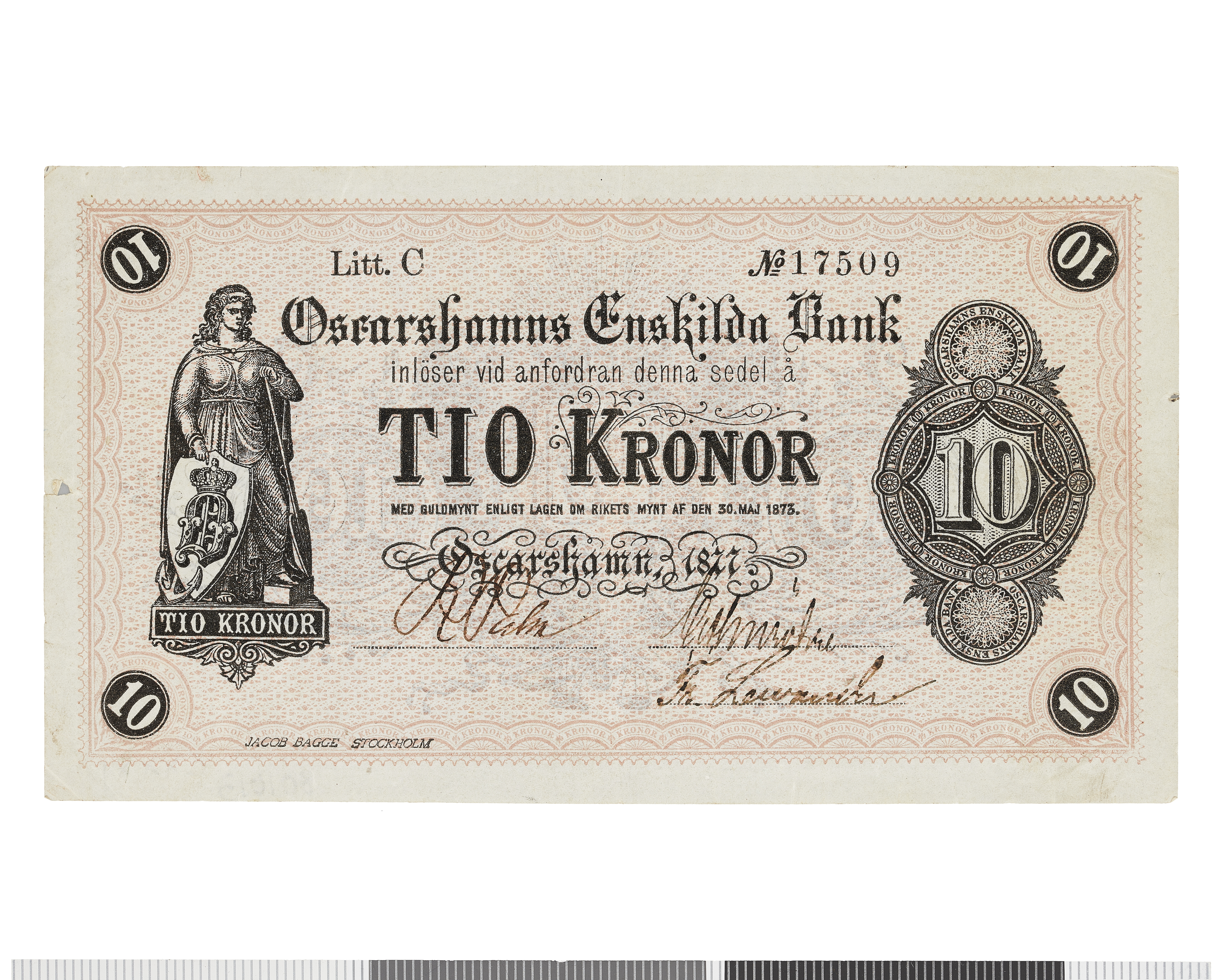 Upphov: Oscarshamns enskilda bank. Media: Bonnevier, Helena. Ekonomiska museet - Kungliga myntkabinettet/SHM, (PDM) Upphovsrätten till detta verk har gått ut och är därmed fritt att använda på alla sätt. Ange gärna upphovsperson om denne är känd.