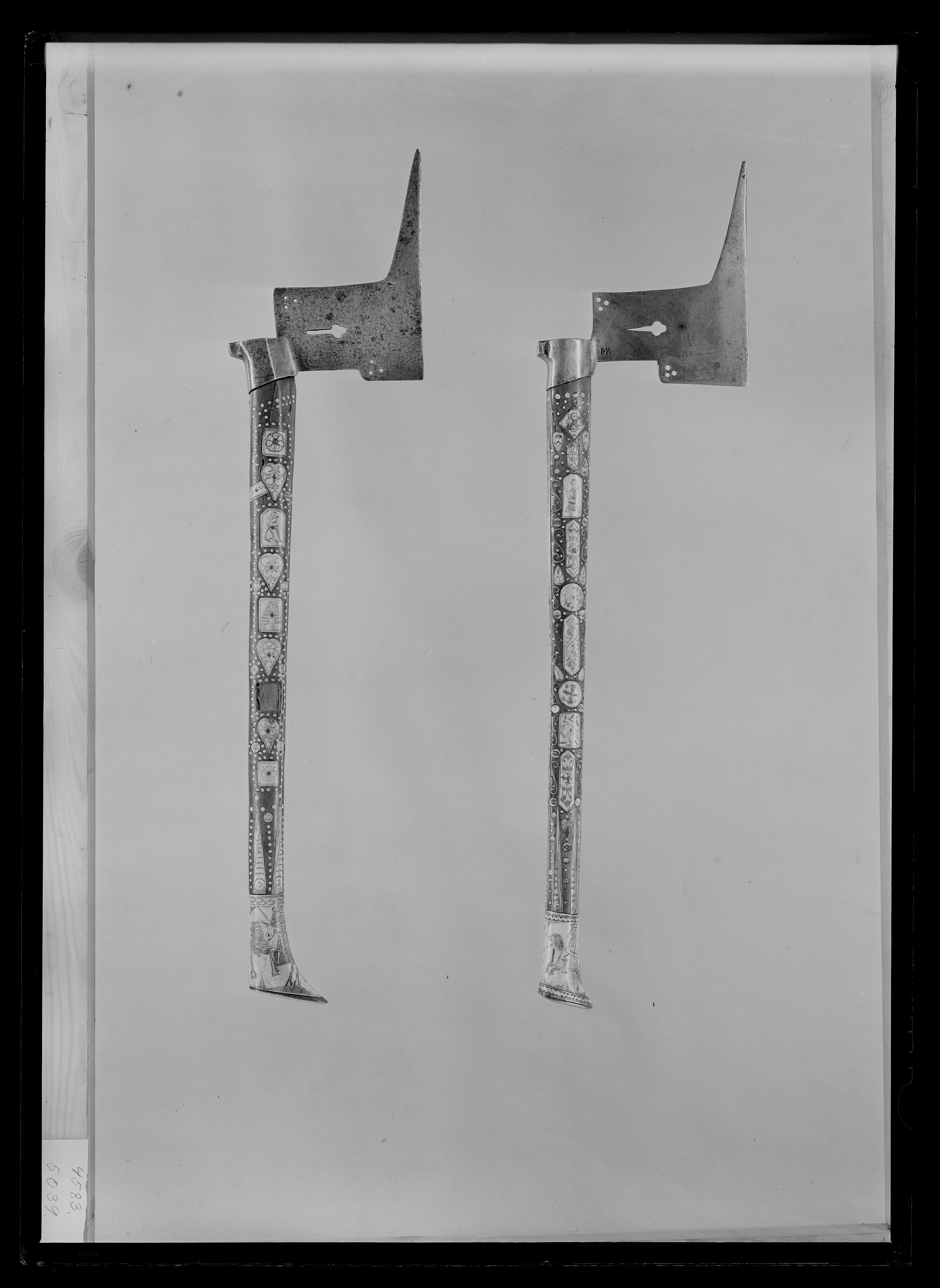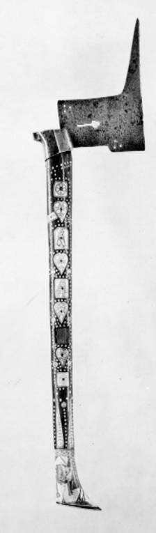 Blad av stål med 54 mm lång holk med bakåt utstående klack, bladets ovansida vinkelformigt uppåtgående och eggsidan utdragen uppåt i en lång spets. Bladet genombrutet vid det bakre hörnet och innanför det främre med tre runda hål samt mittpå med ett klöverbladsliknande ornament. Skaft av valnöt med ovalt tvärsnitt vid skaftänden format i en framåtriktad spets. Skaftet med yttäckande ornering av graverade beninläggningar på båda sidor lika. På var sida 5 fyrkantiga, däremellan en hjärtformad. De fyrkantiga inläggningarnas dekor i form av, från bladet: blomma, knästående mansfigur, bröstbild av mansfigur, tulpan, blomma. De hjärtformade figurernas dekor: de två översta med tjocka voluter, blomma omgiven av tunna volutet samt den nedersta med enbart tunna voluter. Nedtill ett 98 mm högt beslag av ben med ryttare. Vapensköld (ärkemarskalksvapnet för Sachsen?) samt rektangulär ram med årtalet 1686. Från beslaget fem uppåtriktade spetsiga inläggningar. På skaftets bakre kant bandformade inläggningar, den övre med korsfäst Kristus den nedre med bladbård. AK märkt på benskoningen i skaftändan.