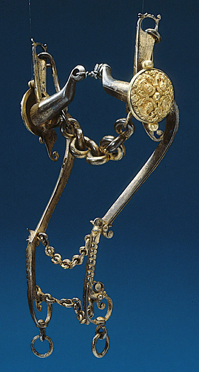 Hufvudstället och Hand Tygeln af röd Juckt stickade lika som Förbögeln med Guld och Silfver. Beslaget finnes af 6 lödigt Silfver eller Zink förgylt och består uti 59 stycken Pucklor Söljor och Stijfter, nätt drifvit Arbete, samt dessutan 6 stycken små Kedjor framför Pannan /: En Kedja af Silfver feltes 1803:/