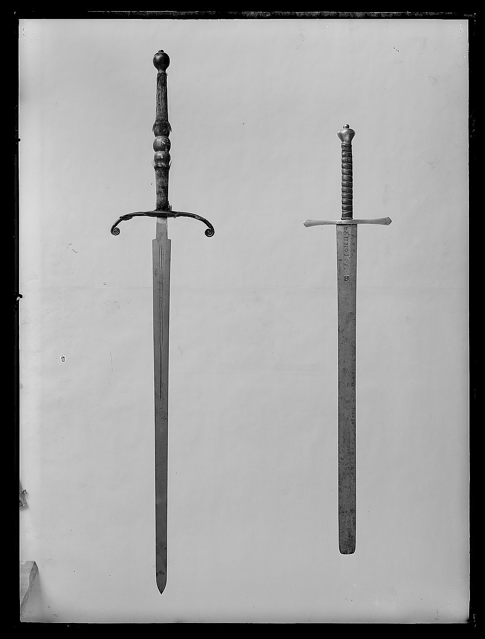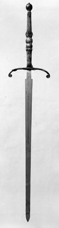 Fäste med päronformad slät knapp och bågformig pareranordning av svärtat stål samt 400 mm lång träkavel med i tre sammanhängande kulor svarvat mittparti klätt med mörkbrunt fårskinn, kavelns över- och nederdel klädd med brunaktig sammet, kantat upptill och nedtill med frans i samma färg. Pareranordningen bestående av runda nedåtböjda parerstänger vilkas ytterändar är inrullade samt en oval kryssbygel på vardera ut- och insidan. In- och utsidan av båda parerstängerna smyckad med en inrullad volut. Klinga rak, tvåeggad med 65 mm lång ricasso. På starka delen tre längsgående hålkälar, den mellersta längre än de övriga. Klingan alltför svajig. Vapnet i sin helhet avsågs ge intryck av ett tvåhandssvärd från 1500-talet.